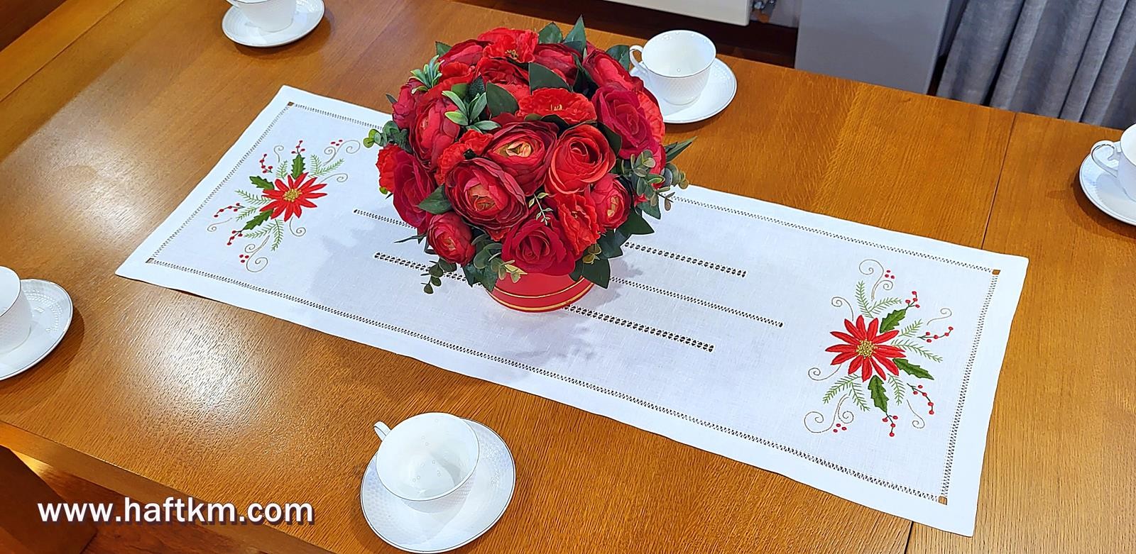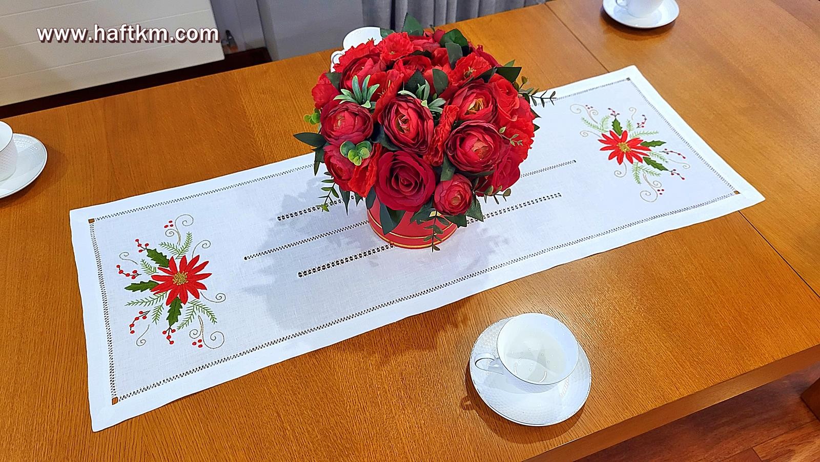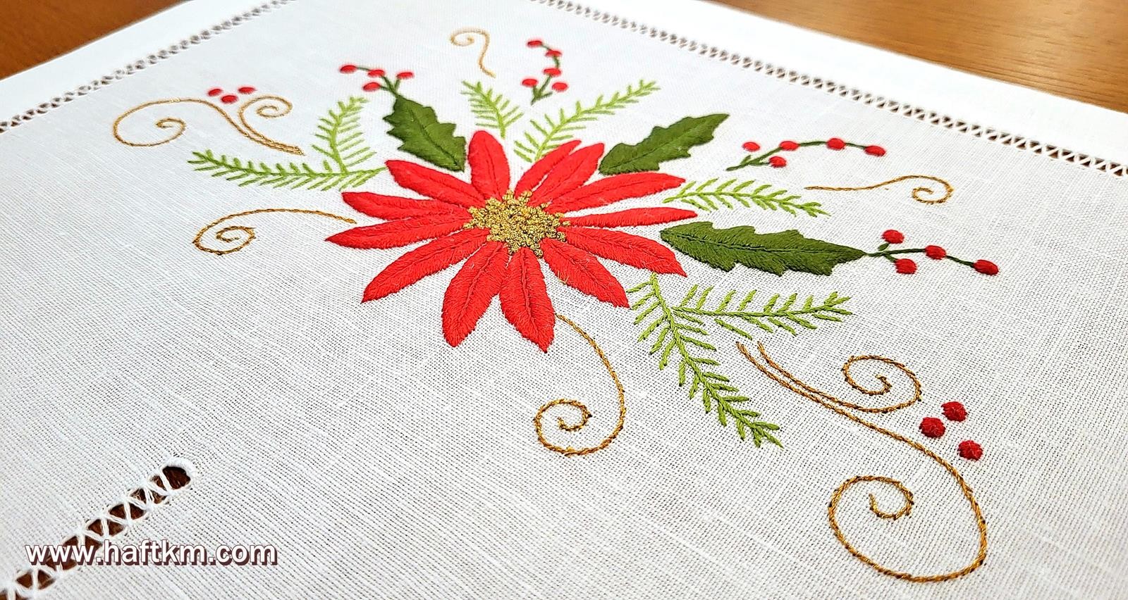 techniką hafciarską, haft wypukły. Ponadto bieżnik został misternie ozdobiony elegancką i estetyczną mereżką.