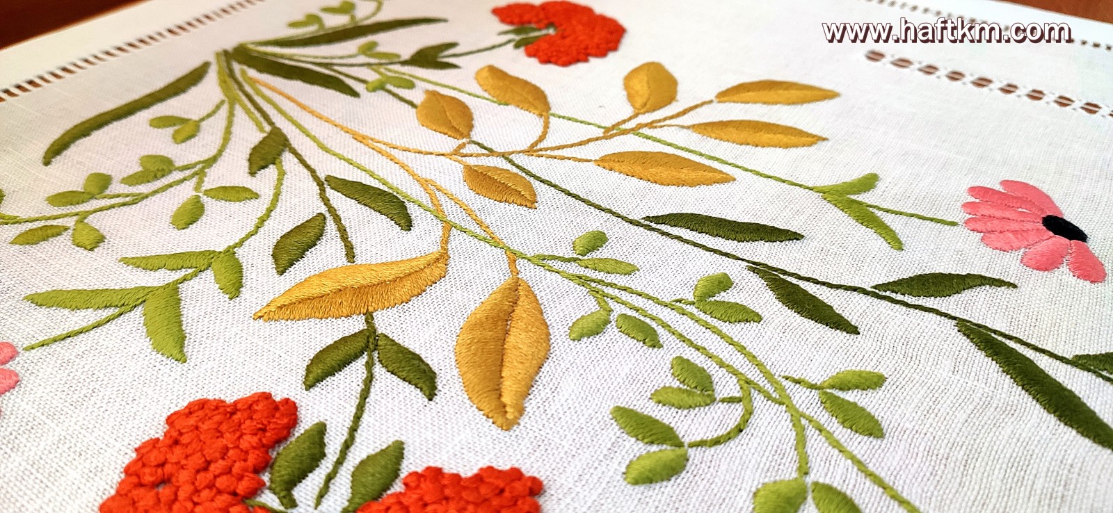 Technika wykonania: haft wypukły, mereżka wiązana i mereżka prosta.