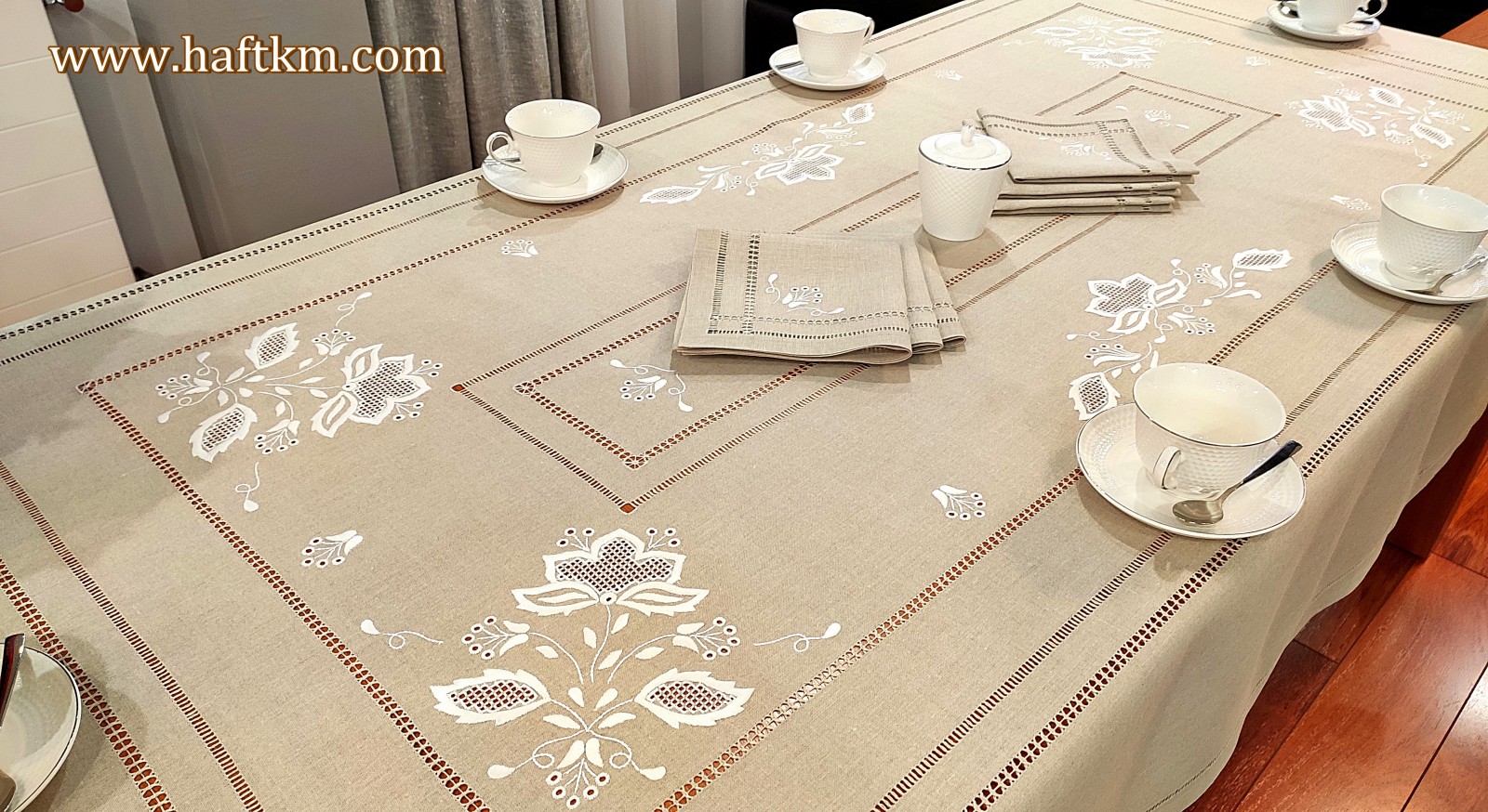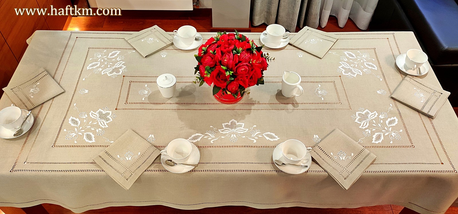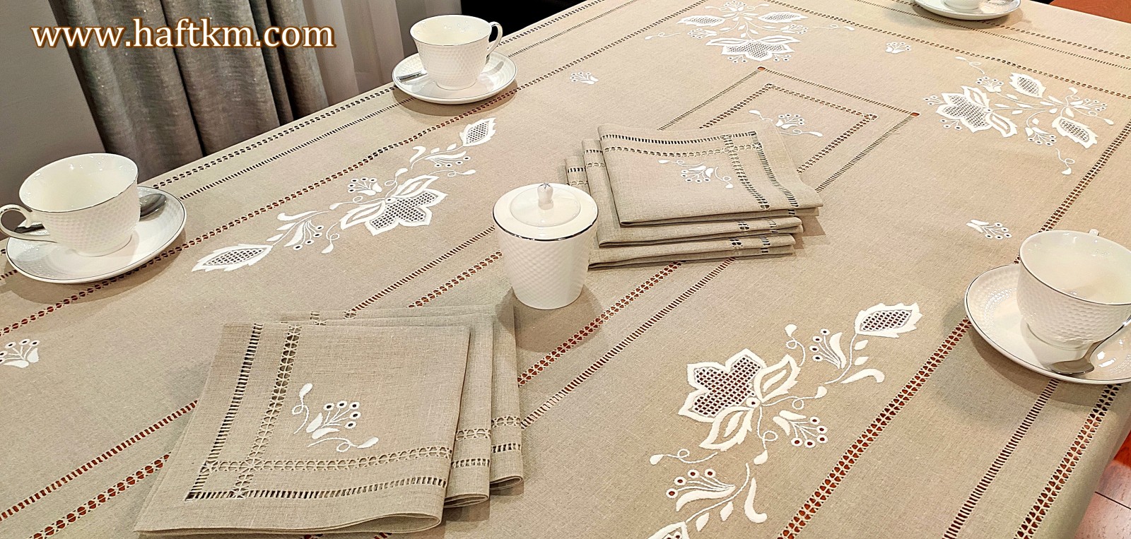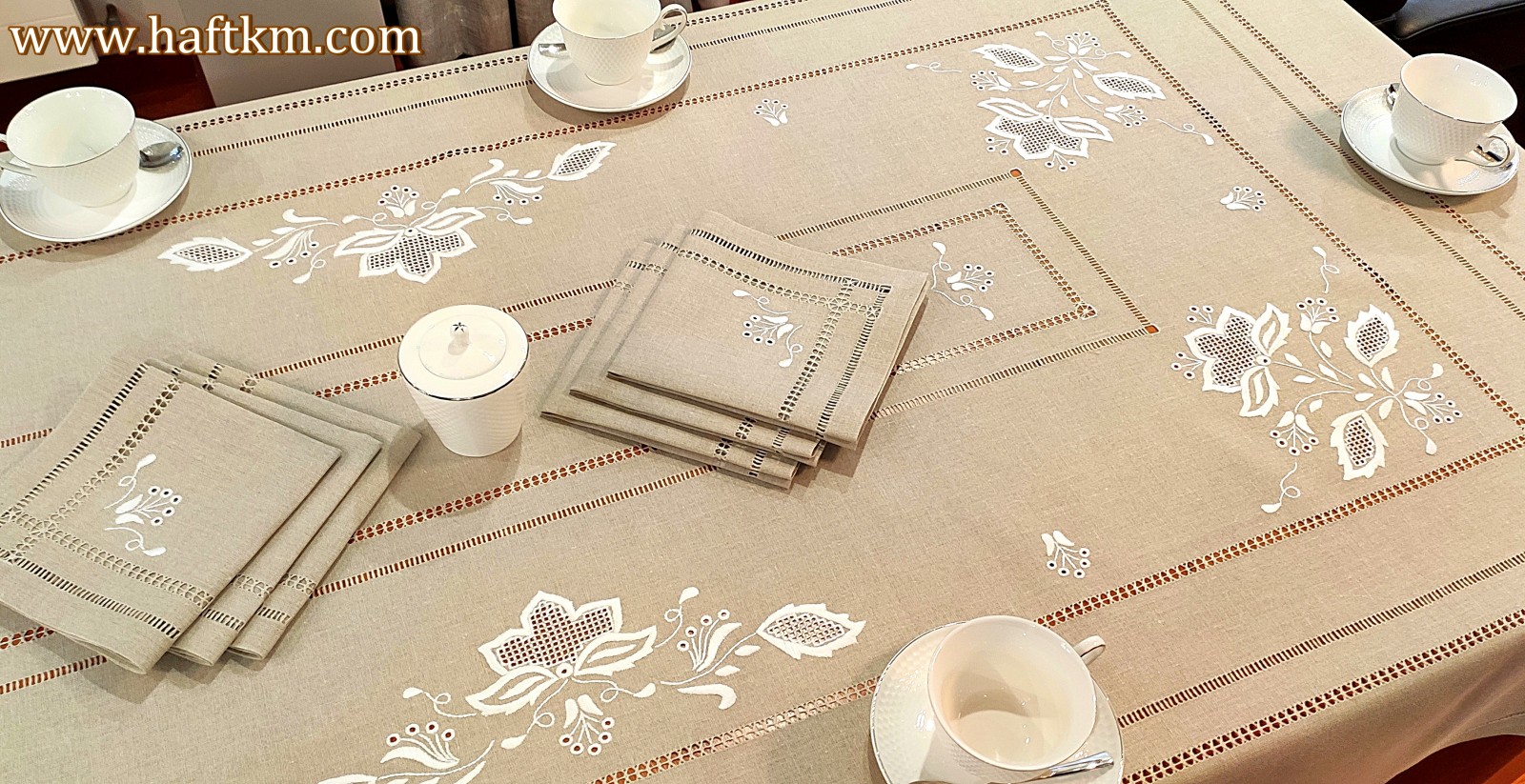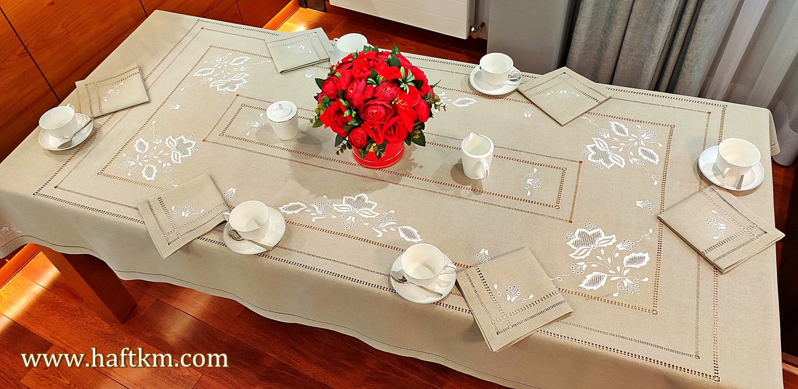 Komplet składa się z obrusa i sześciu serwetek.