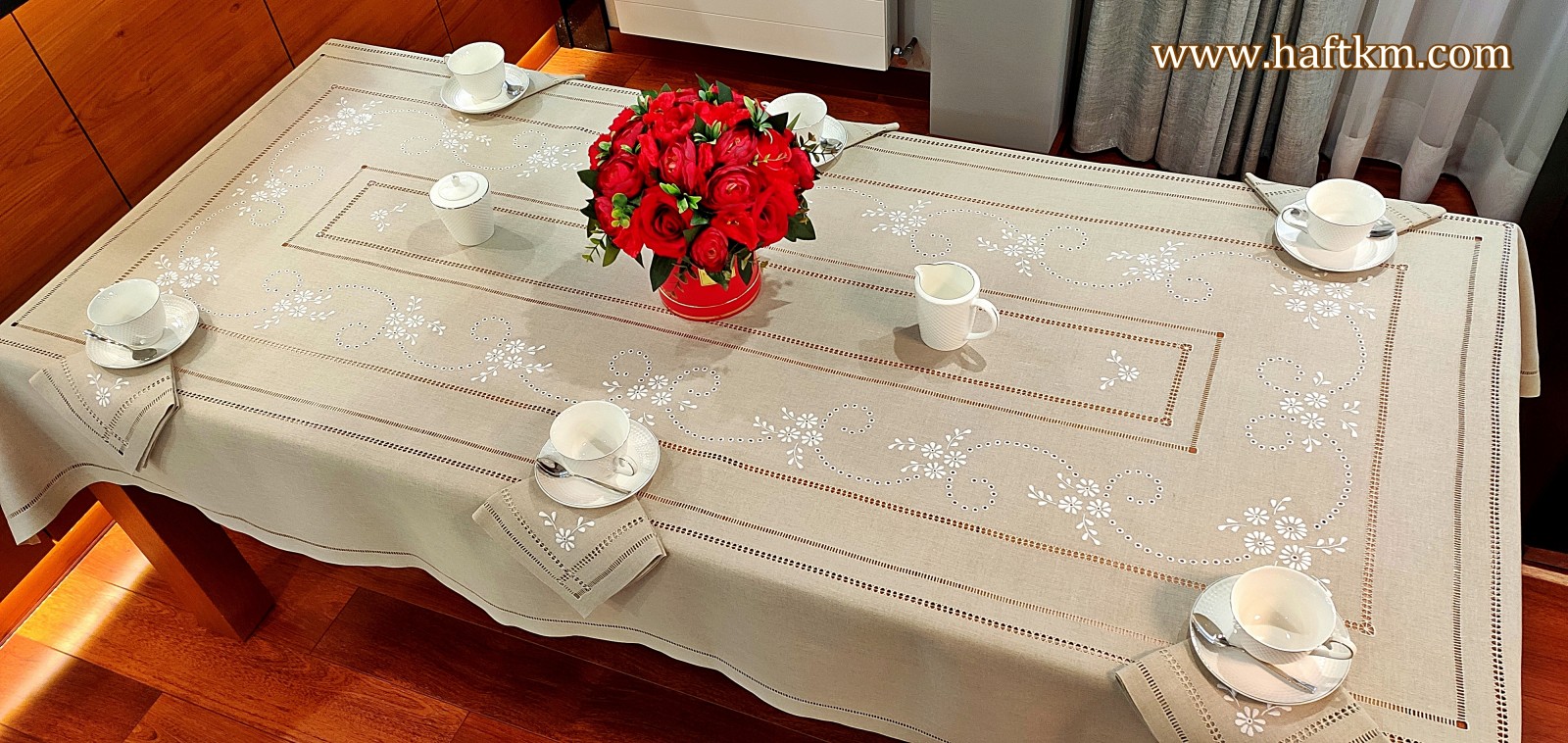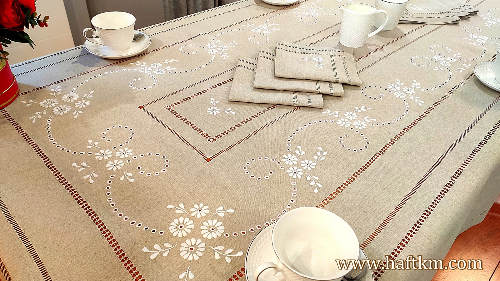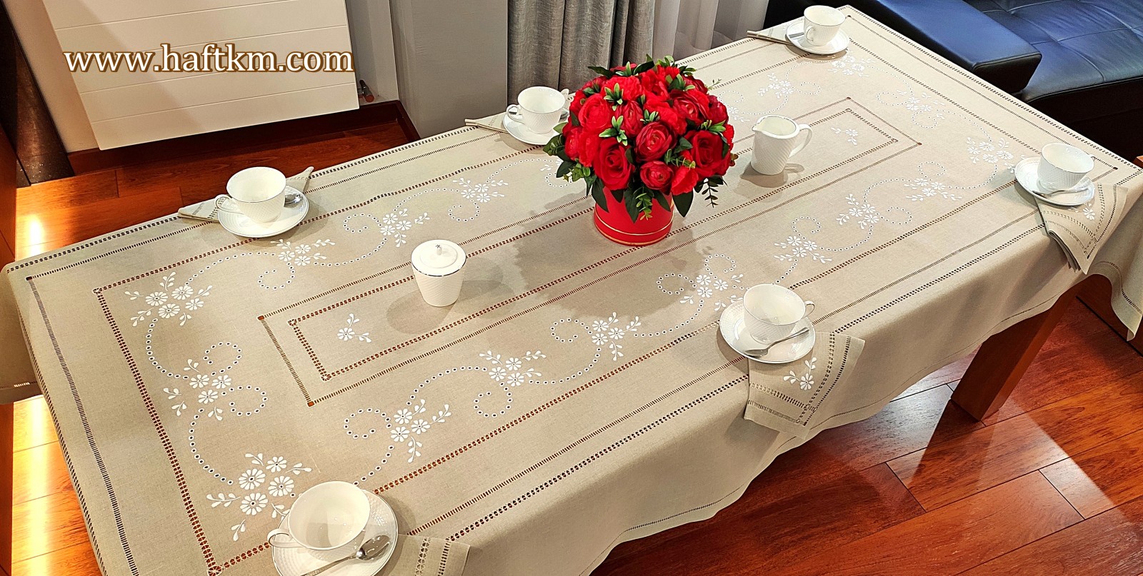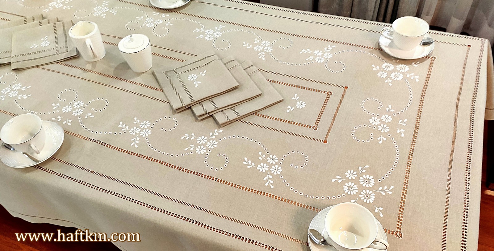 Komplet składa się z obrusa i sześciu serwetek.