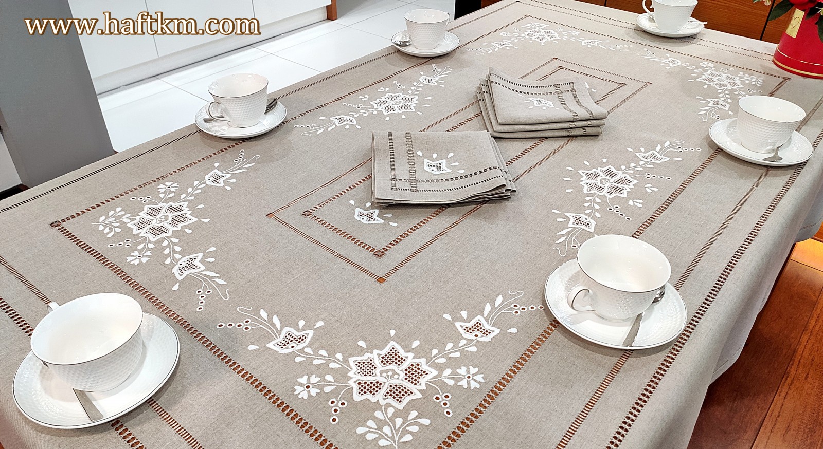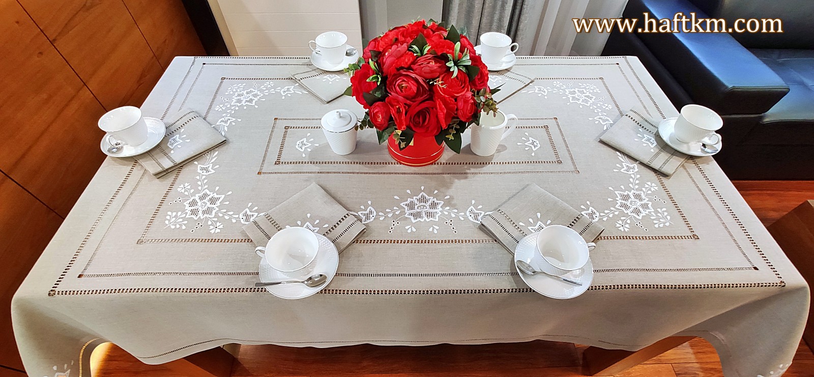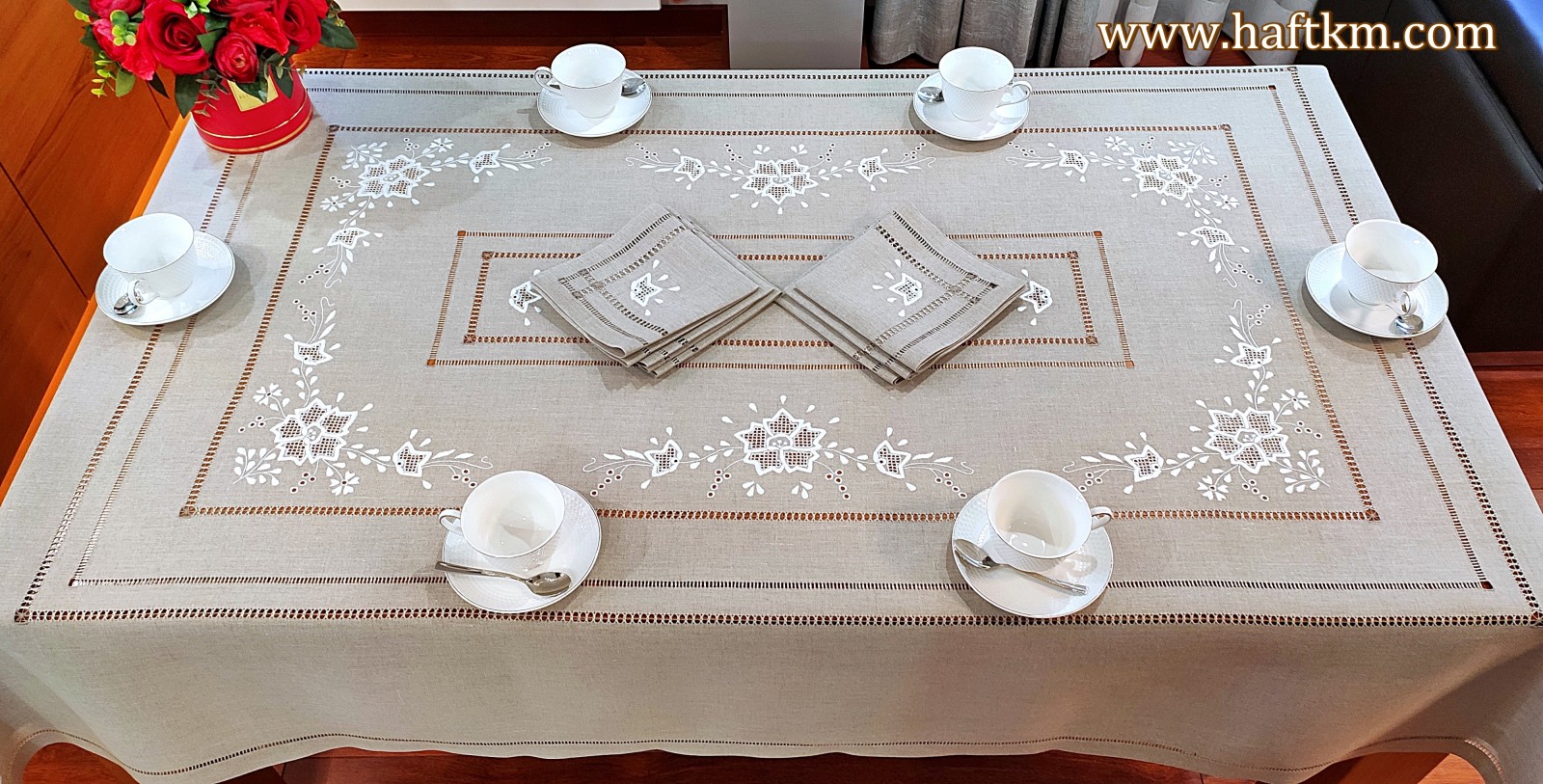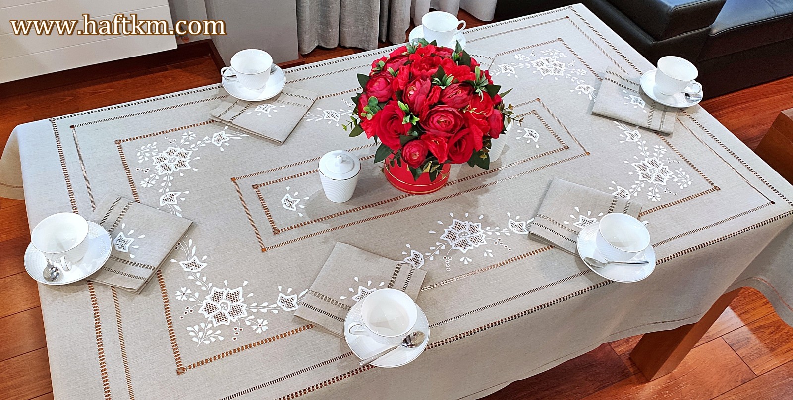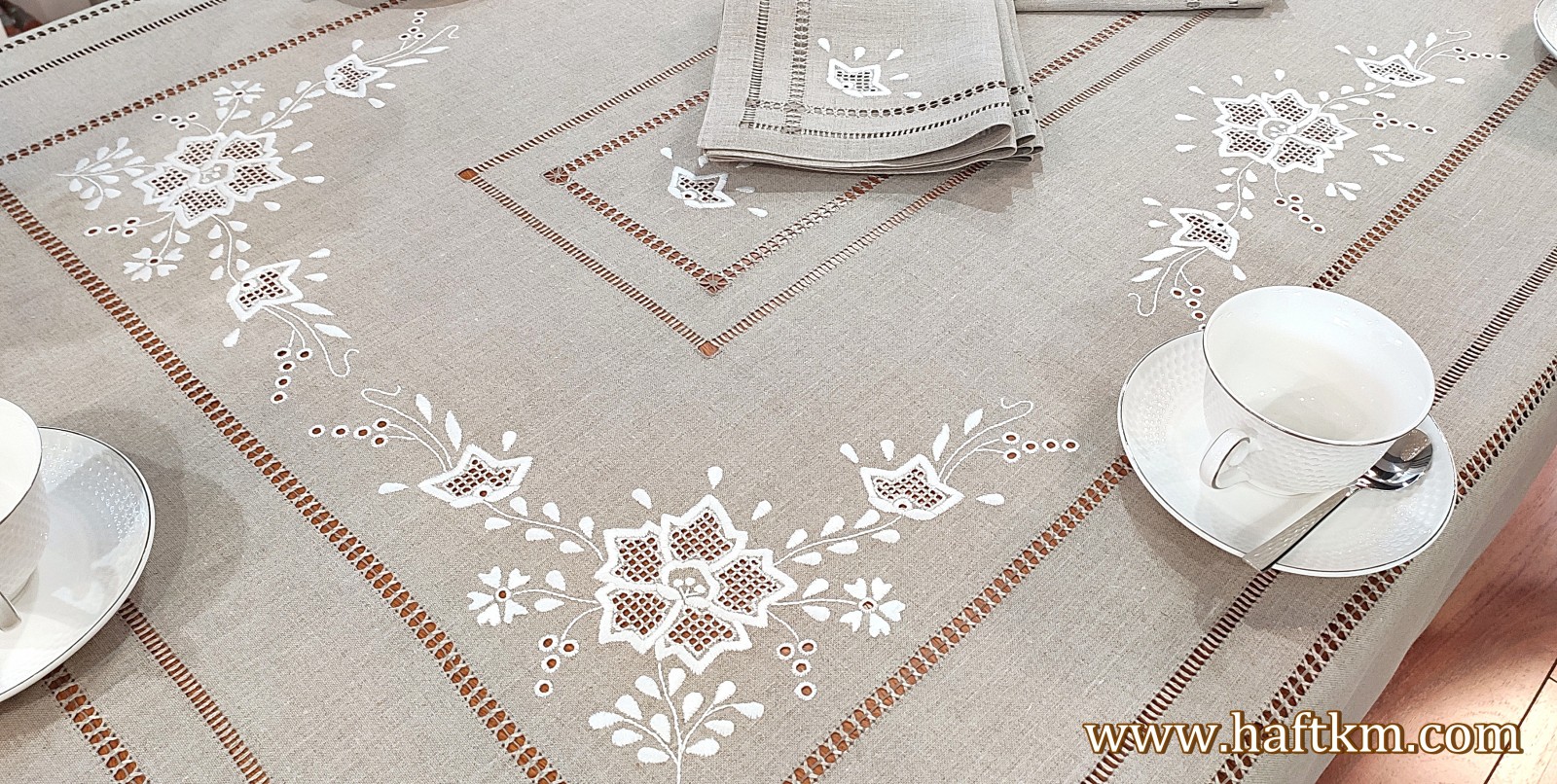 techniką hafciarską - haft wypukły, haft toledo. Ponadto obrus został misternie ozdobiony elegancką i estetyczną mereżką.