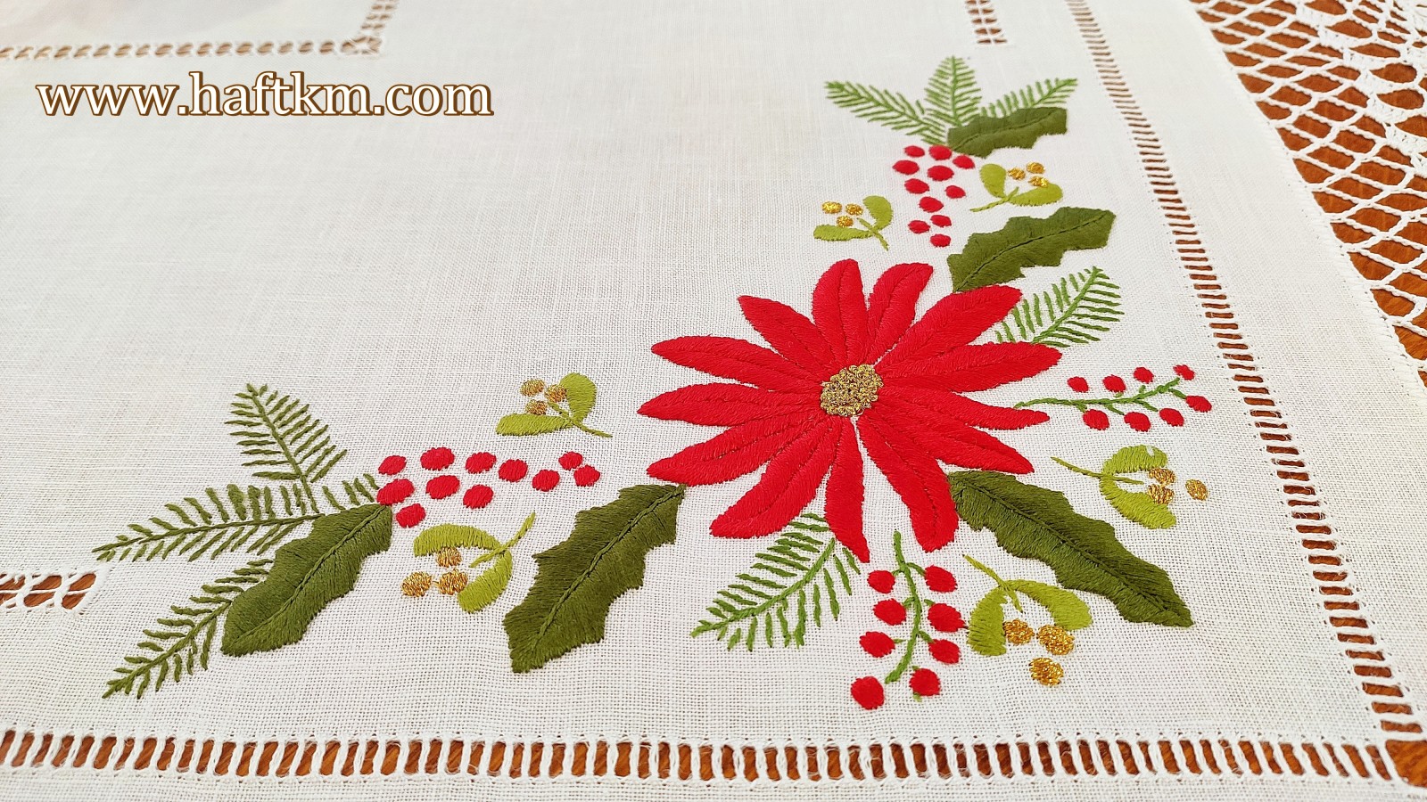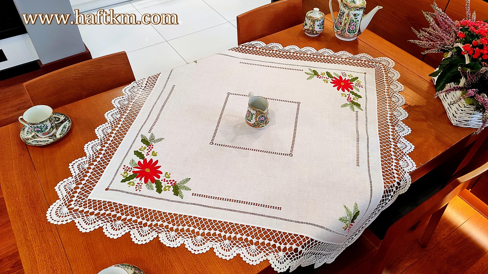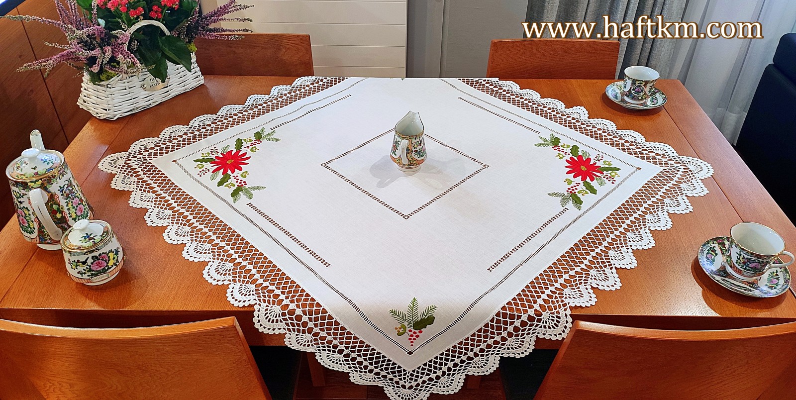 techniką hafciarską - haft wypukły, haft toledo. Serweta został misternie ozdobiony elegancką i estetyczną mereżką. Brzegi serwety ozdabia, elegancka koronka szydełkowa.