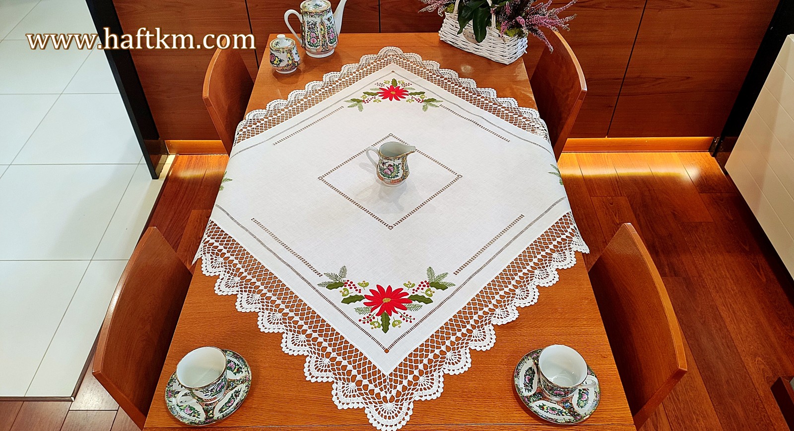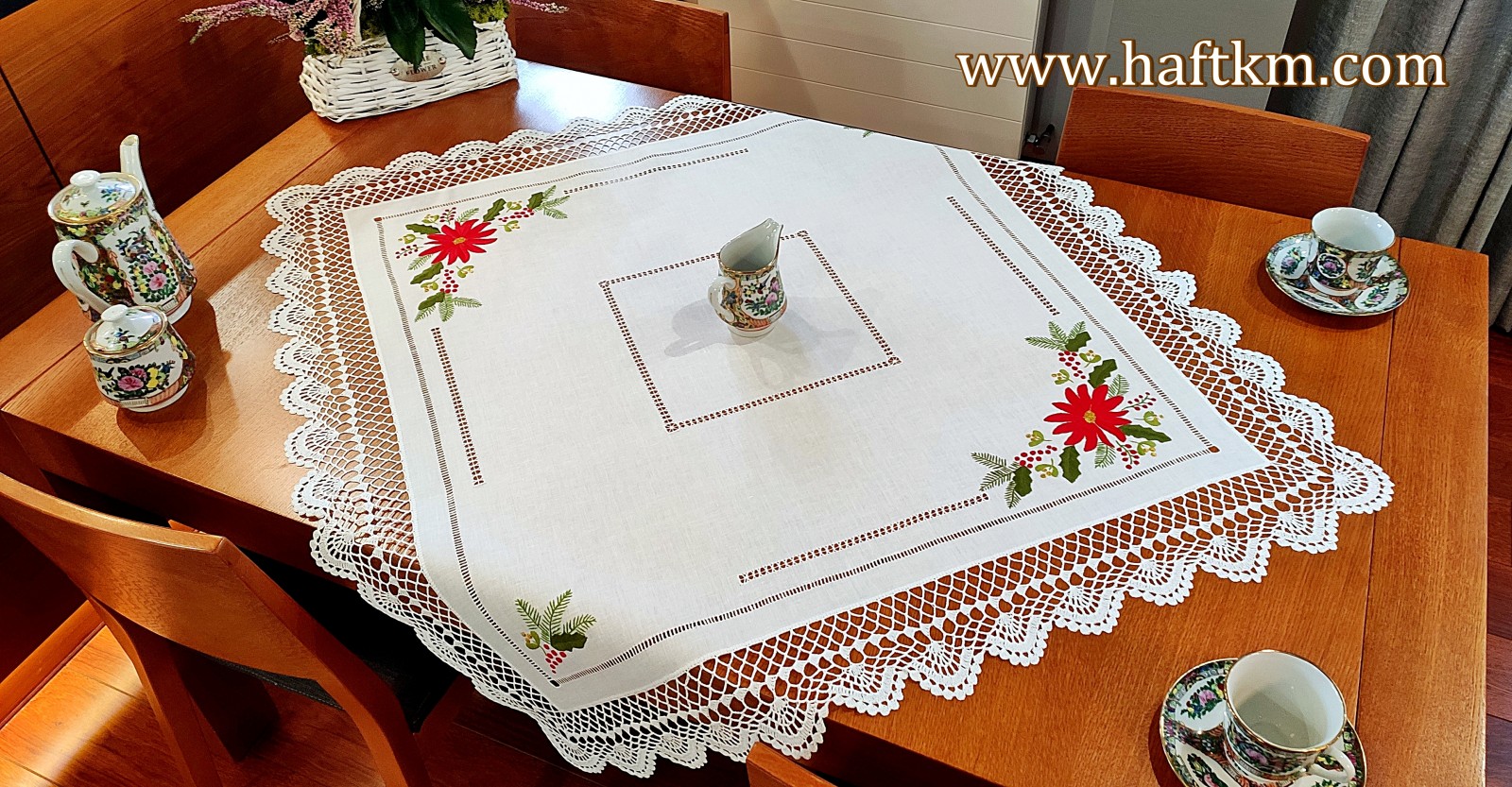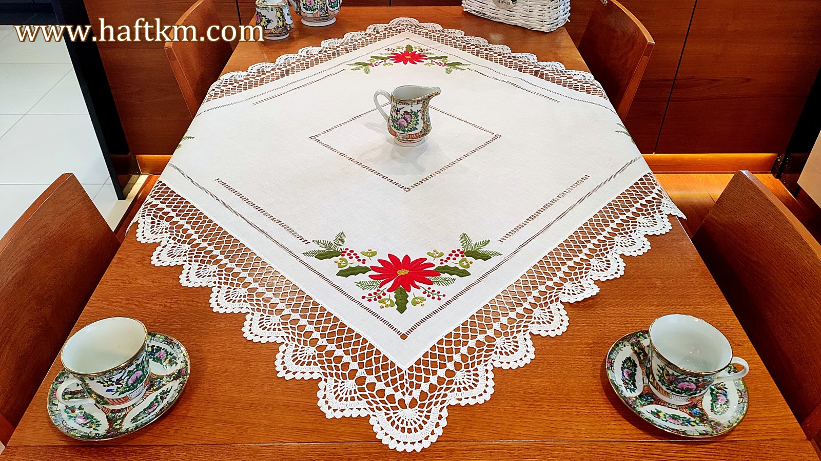 techniką hafciarską - haft wypukły, haft toledo. Serweta został misternie ozdobiony elegancką i estetyczną mereżką. Brzegi serwety ozdabia, elegancka koronka szydełkowa.
