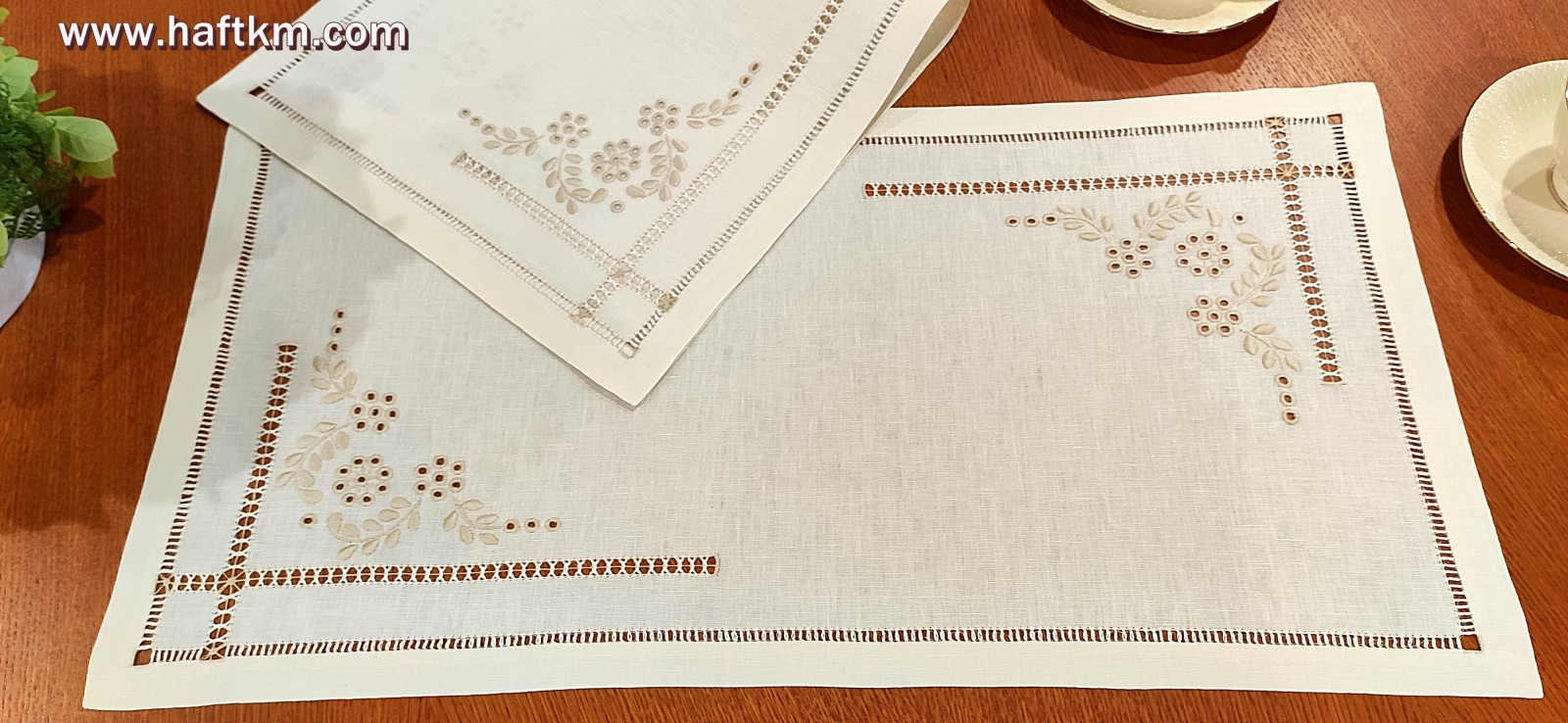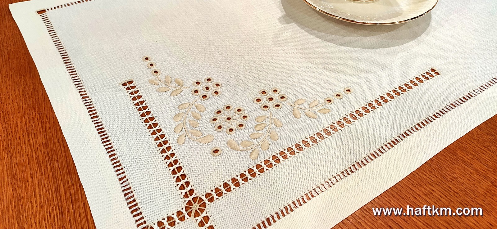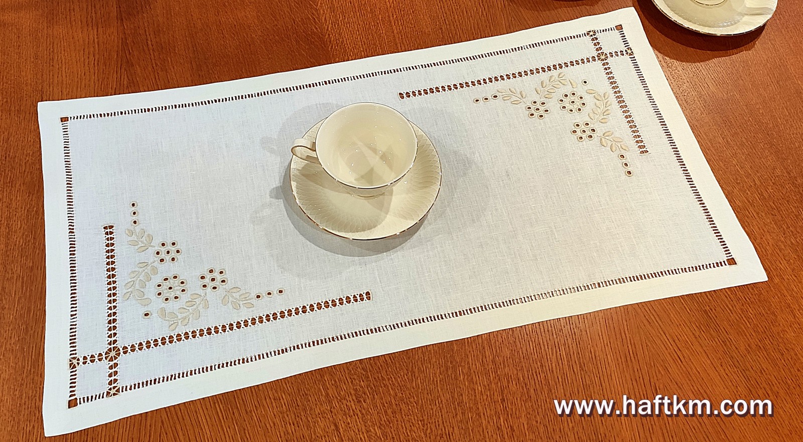 techniką hafciarską, haft wypukły., haft angielski. Ponadto bieżnik został misternie ozdobiony elegancką i estetyczną mereżką.