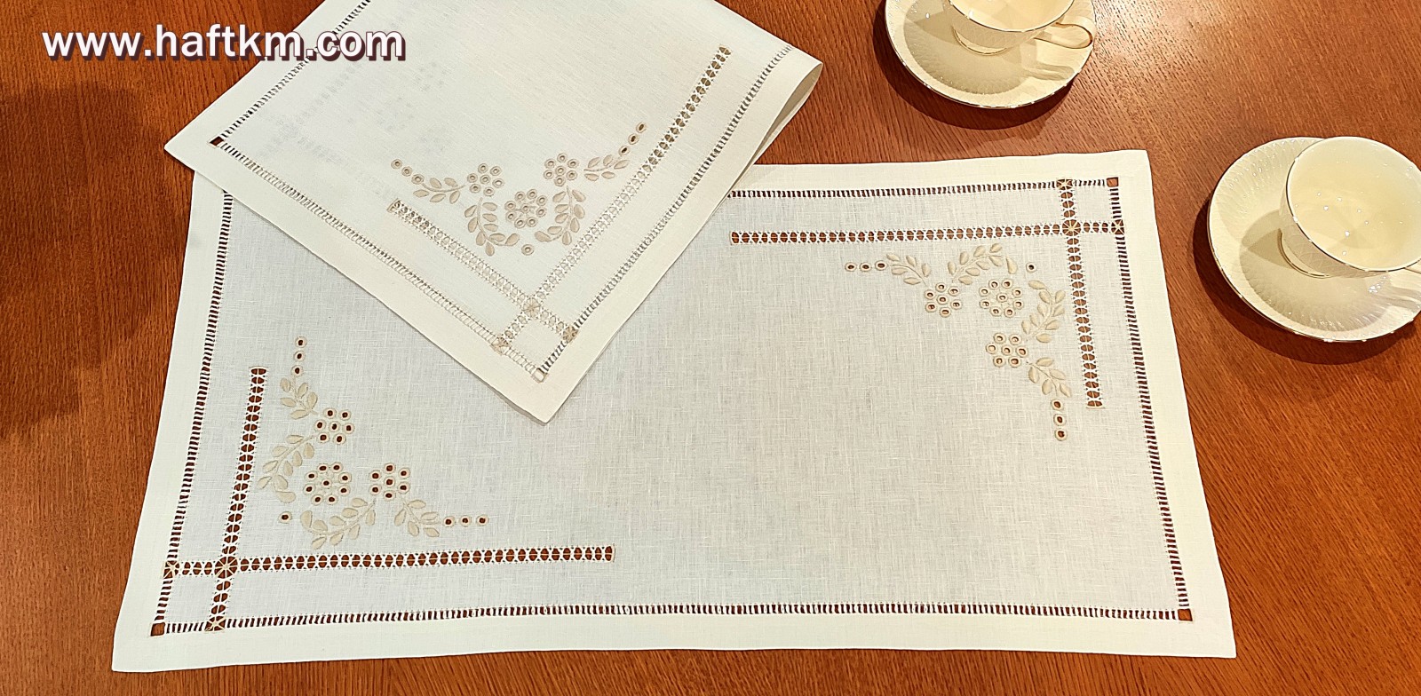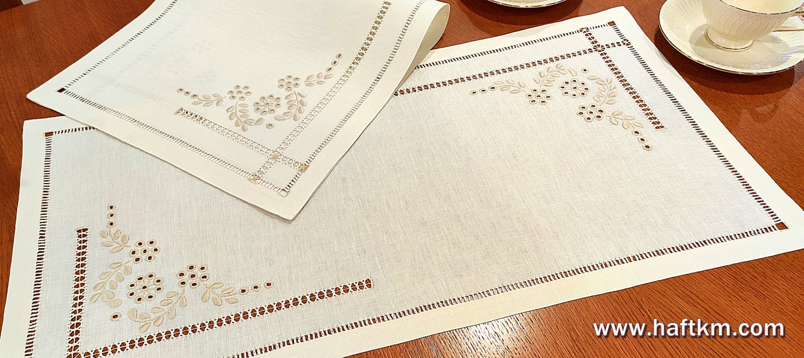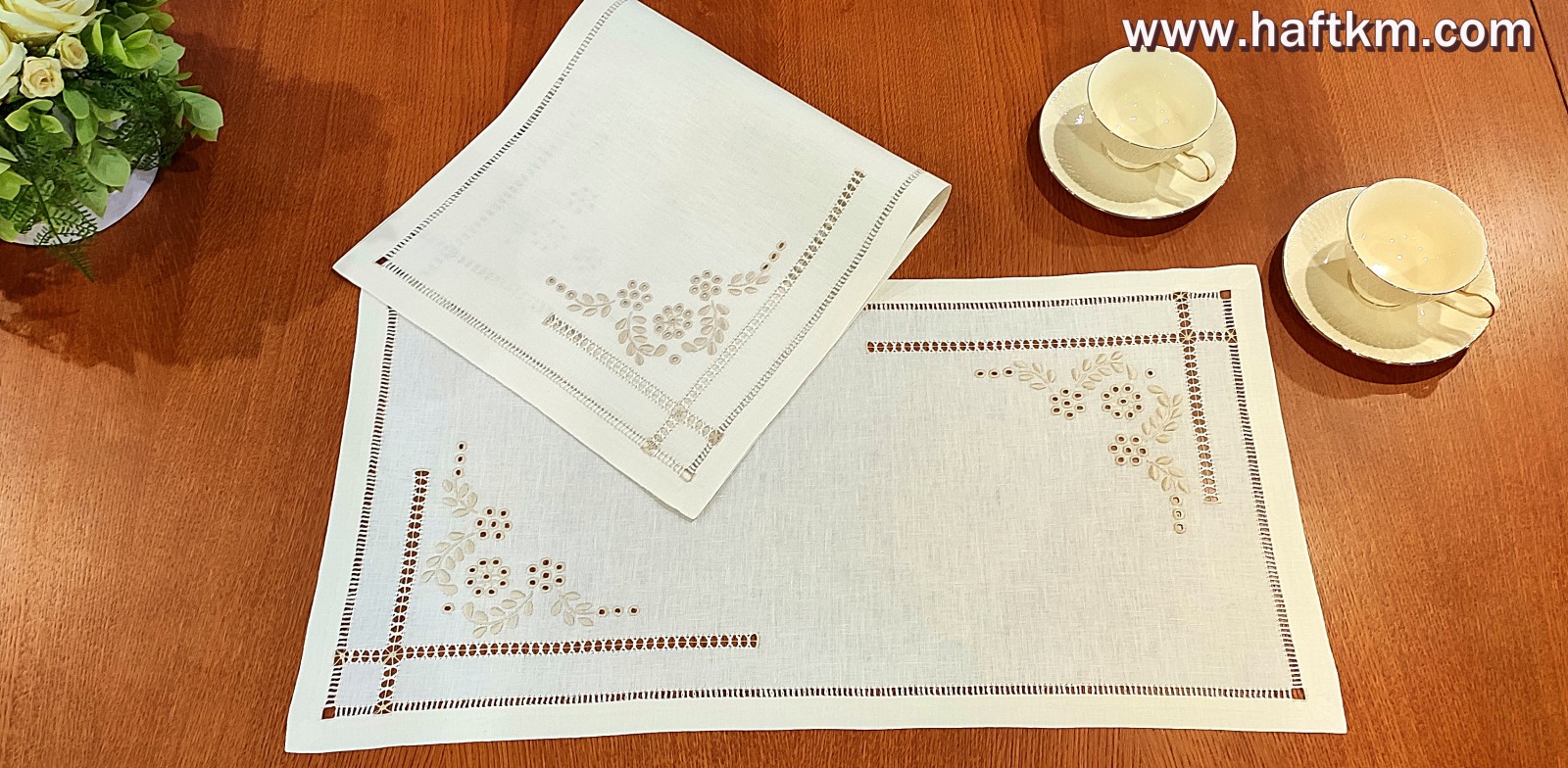 techniką hafciarską, haft wypukły., haft angielski. Ponadto bieżnik został misternie ozdobiony elegancką i estetyczną mereżką.