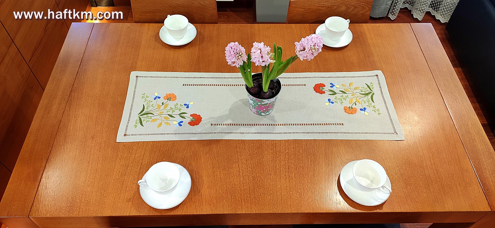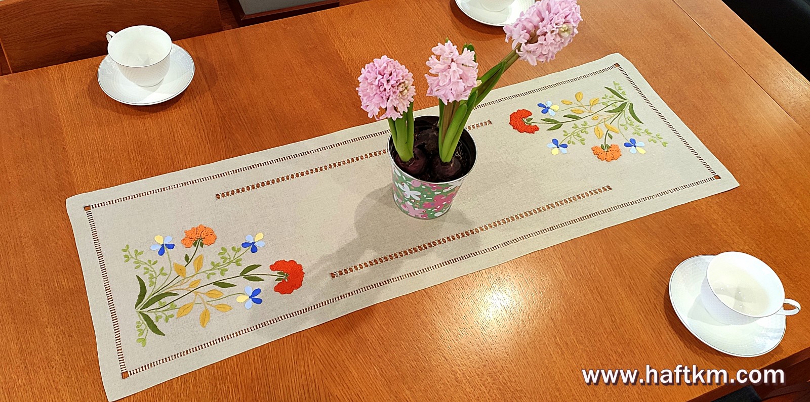 techniką hafciarską - haft wypukły. Ponadto bieżnik został misternie ozdobiony elegancką i estetyczną mereżką.