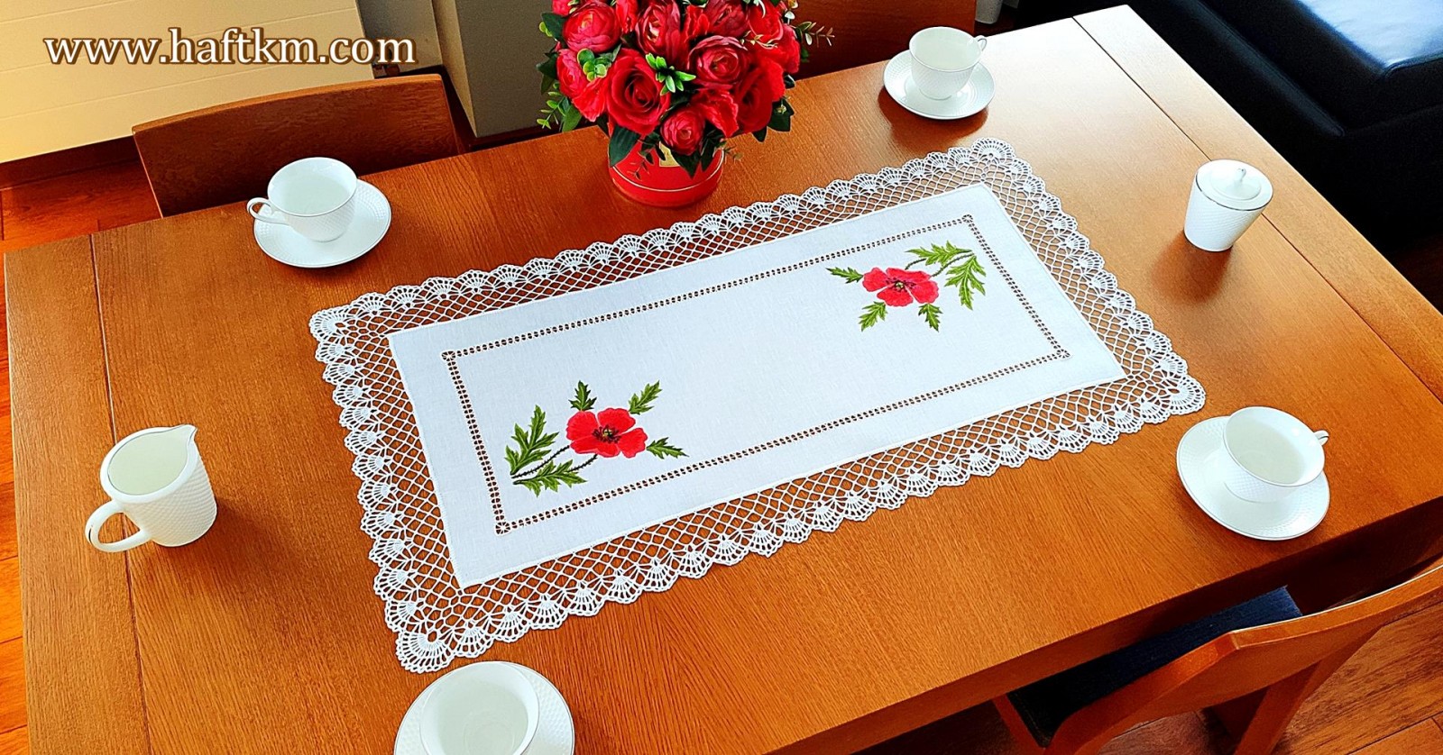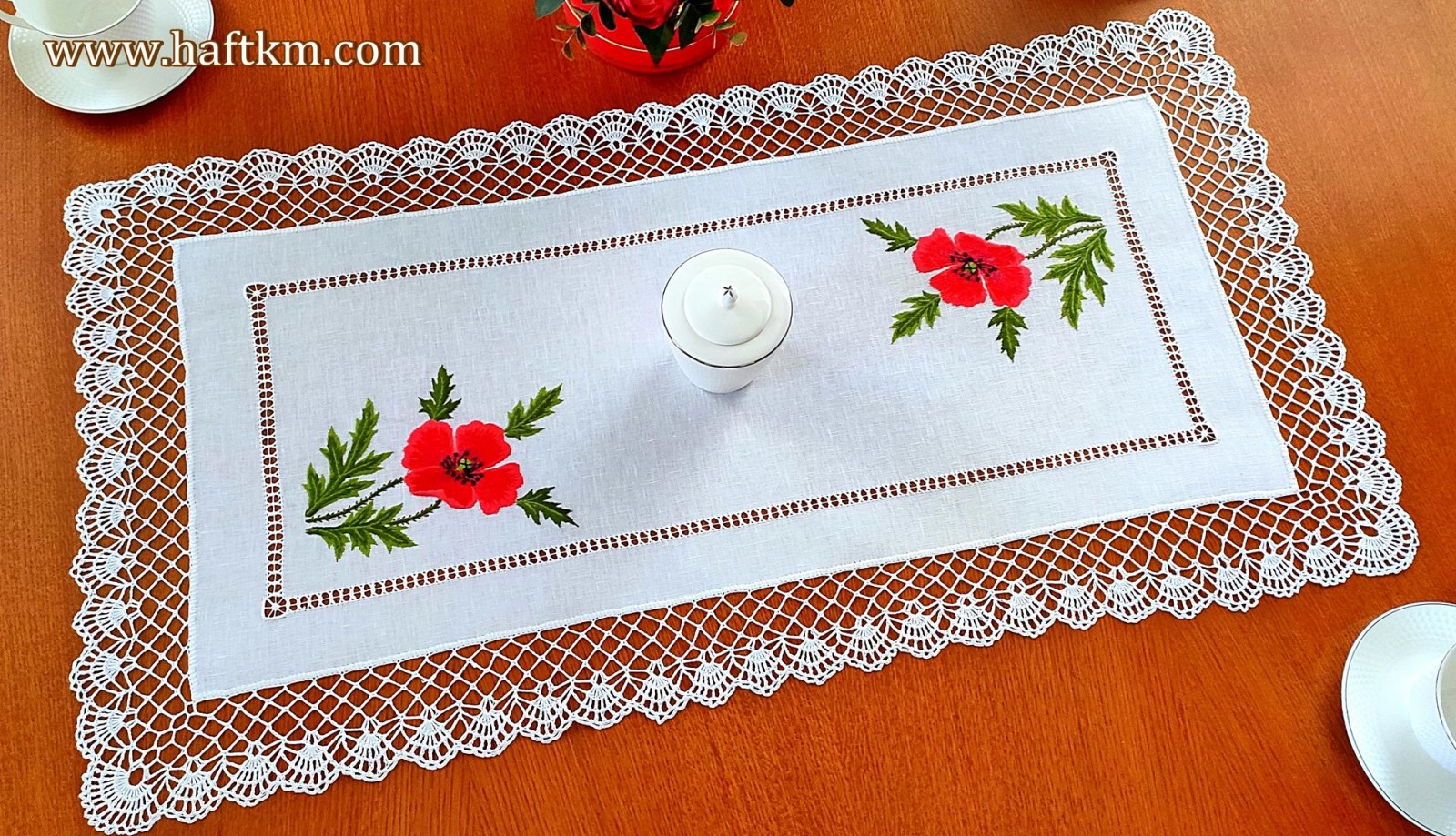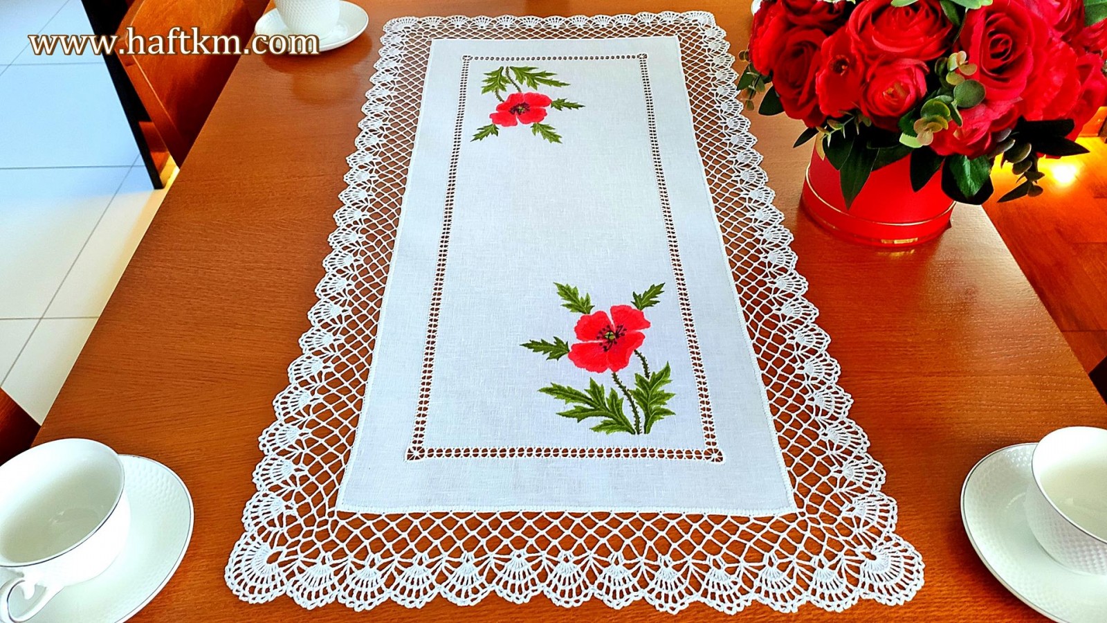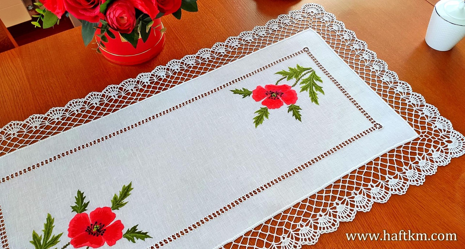 Ponadto bieżnik został misternie ozdobiony elegancką i misterną koronką szydełkową.