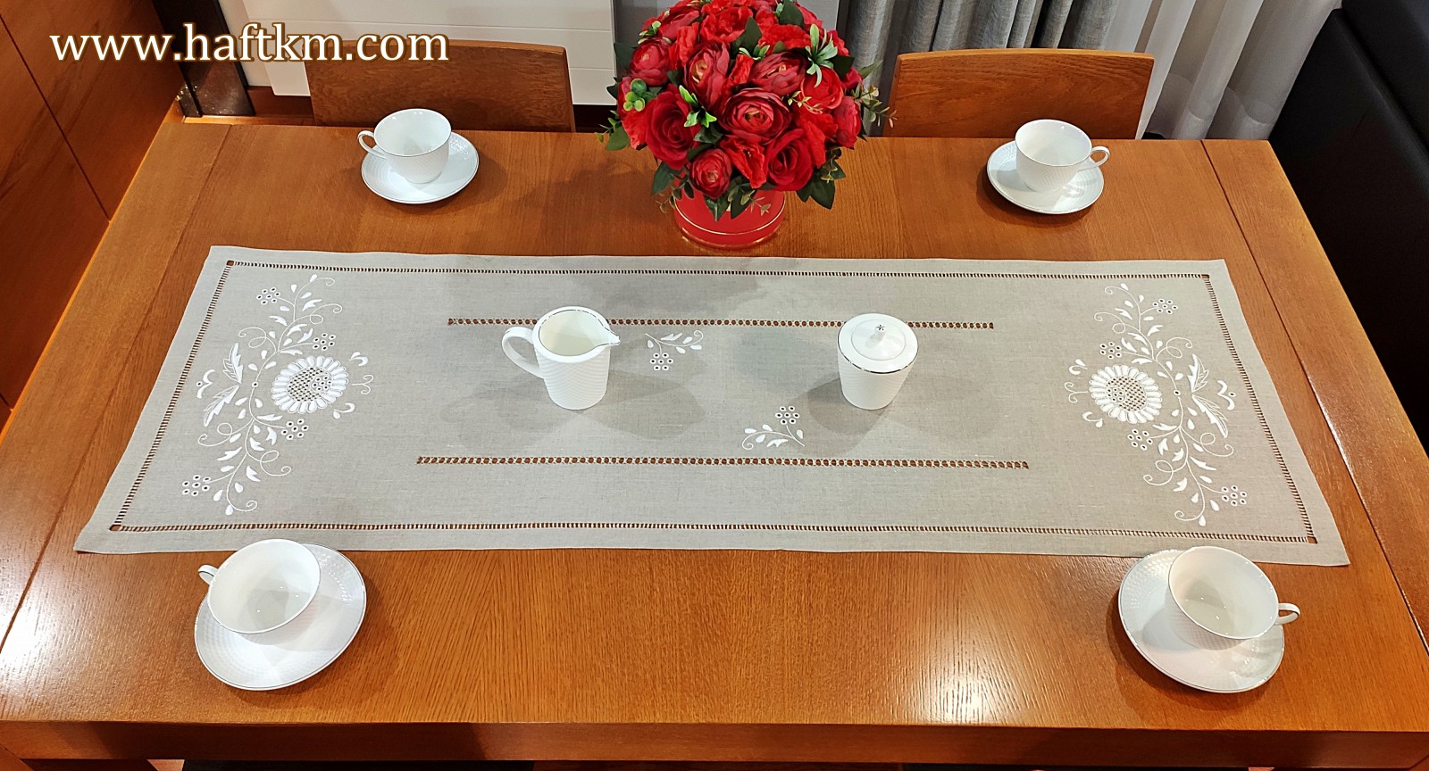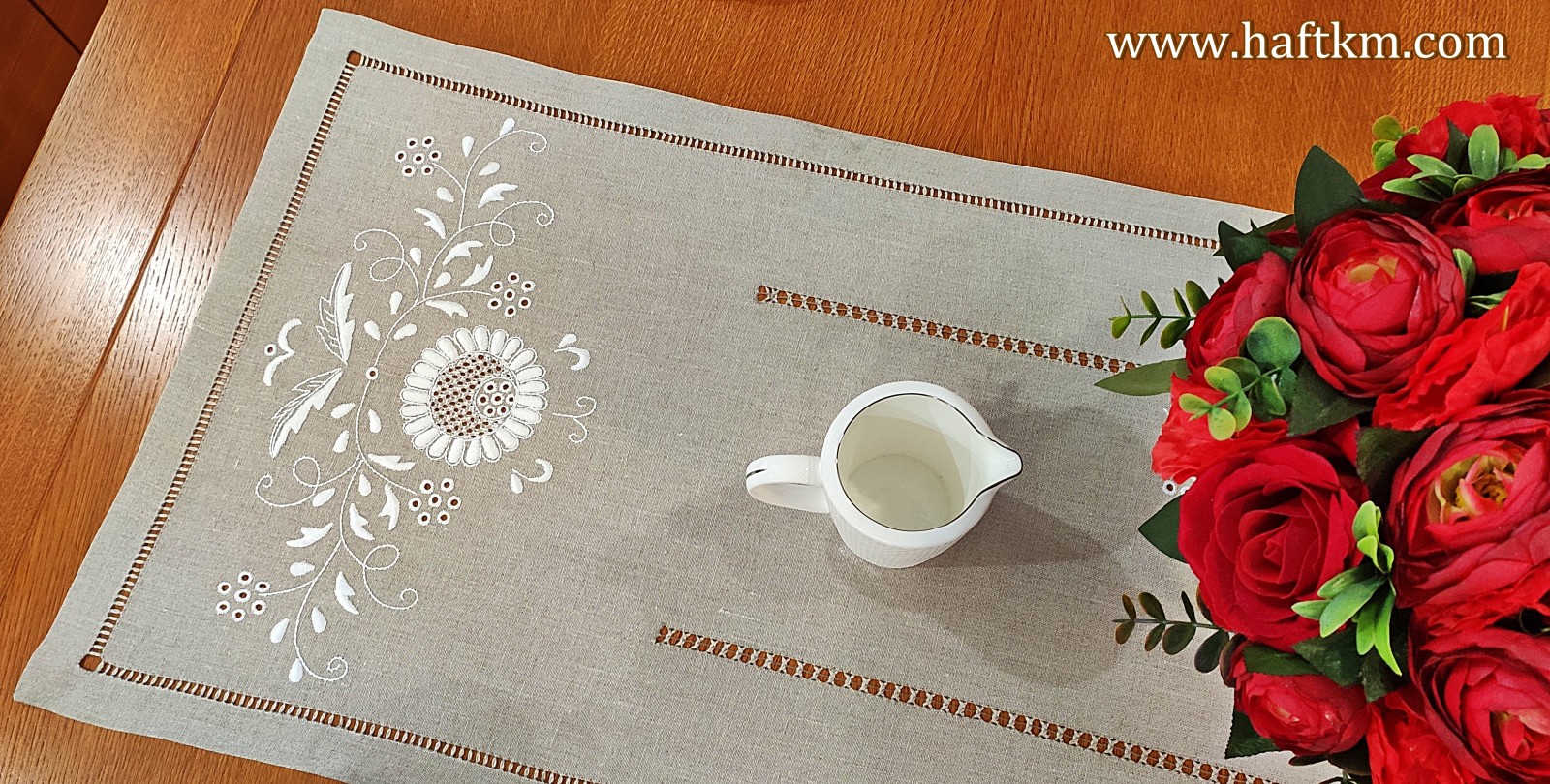 techniką hafciarską, haft wypukły, haft toledo. Ponadto bieżnik został misternie ozdobiony elegancką i estetyczną mereżką.