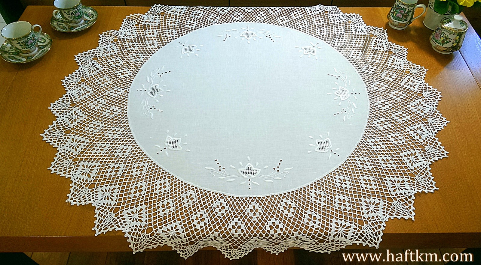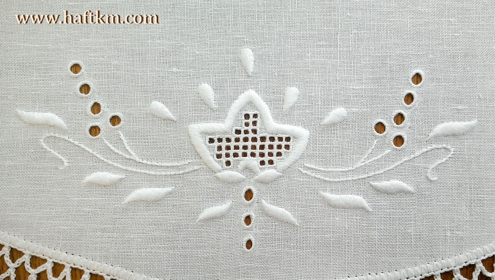 techniką hafciarską, haft wypukły, haft toledo. Ponadto serweta została misternie ozdobiona elegancką i misterną koronką szydełkową.