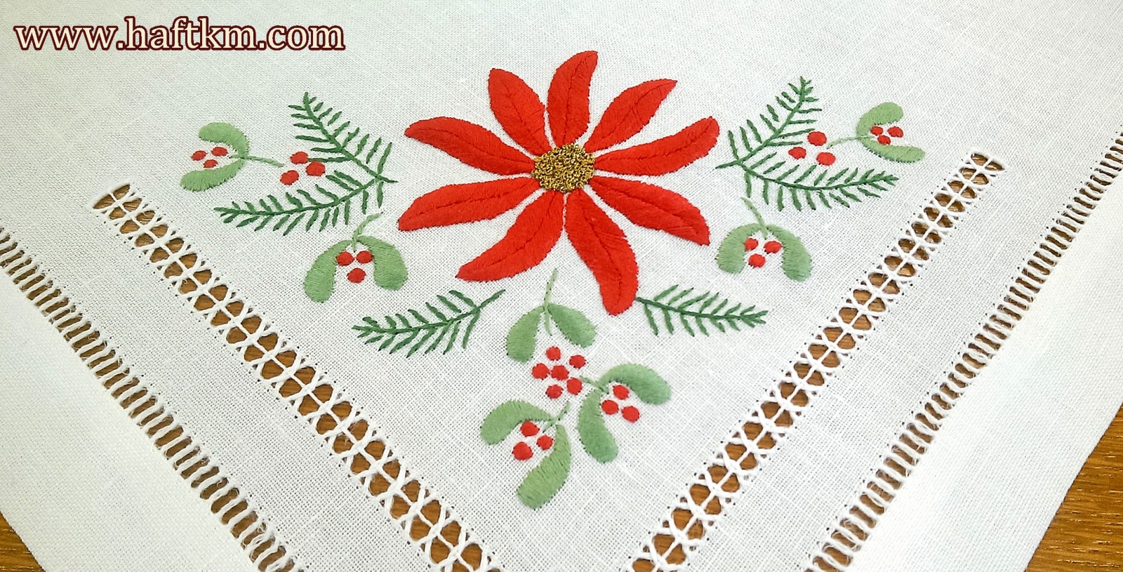 techniką hafciarską haft wypukły. Ponadto serweta została, misternie ozdobiona, elegancką i estetyczną mereżką.