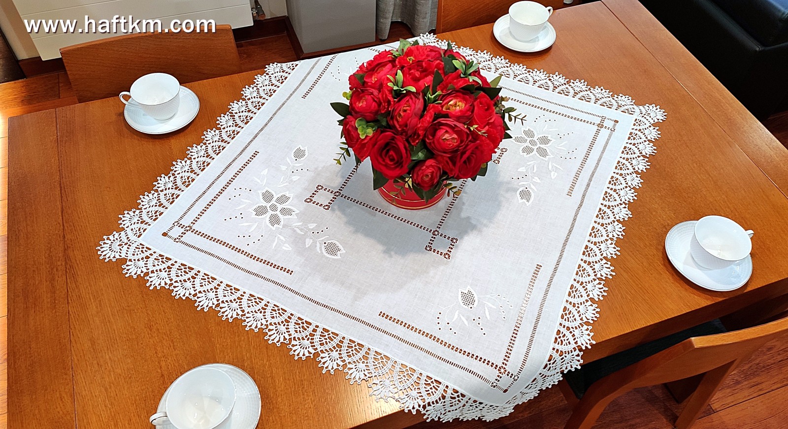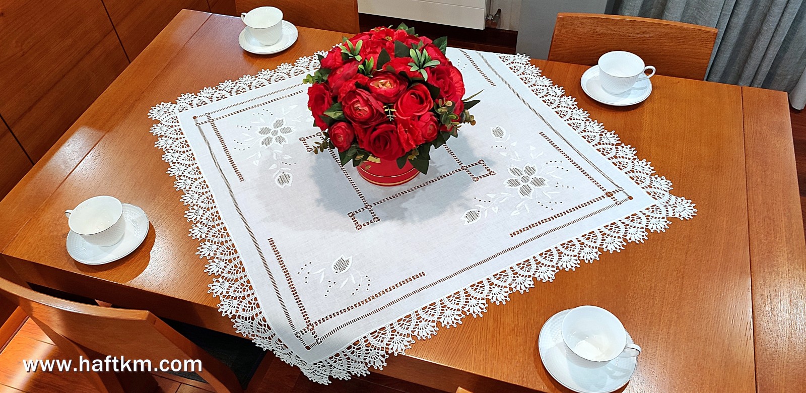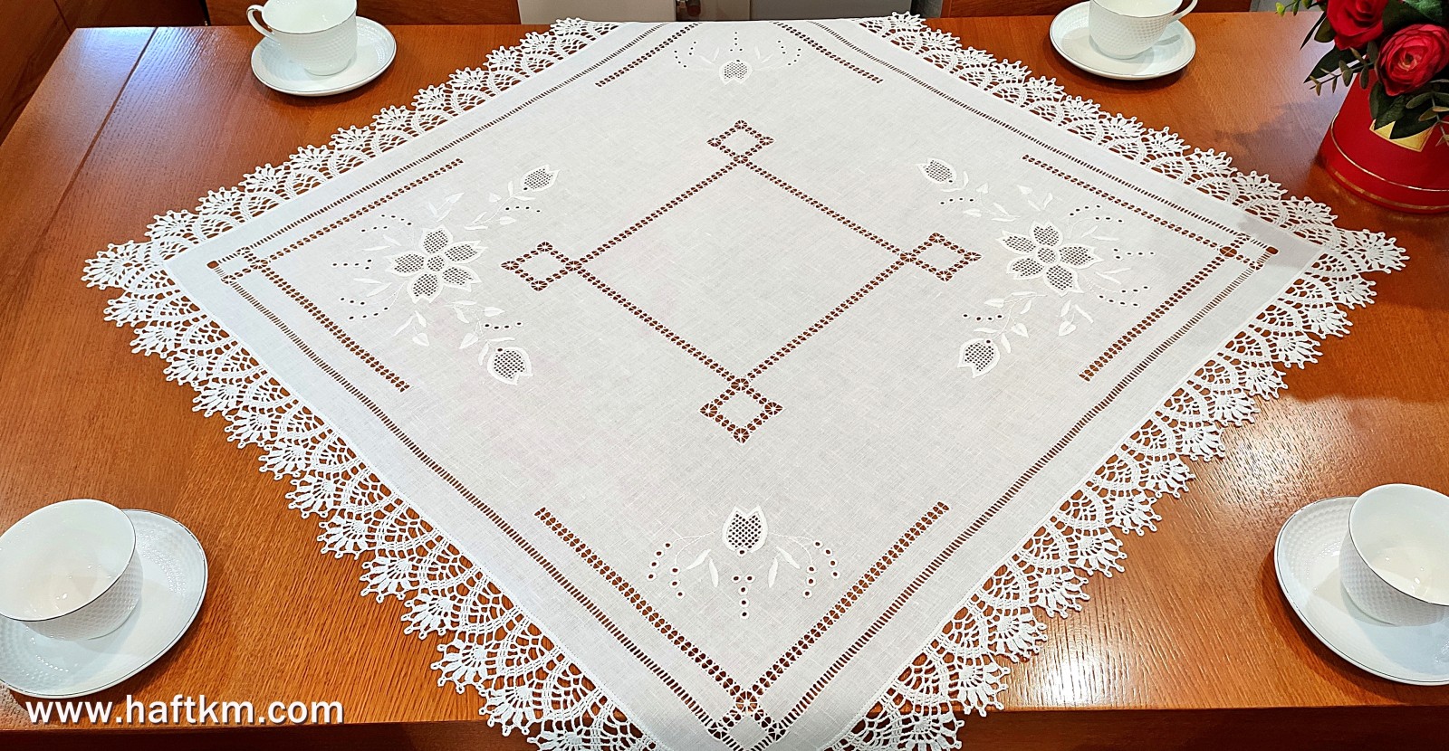 techniką hafciarską - haft wypukły, haft toledo. Serweta został misternie ozdobiony elegancką i estetyczną mereżką. Brzegi serwety ozdabia, elegancka koronka szydełkowa.
