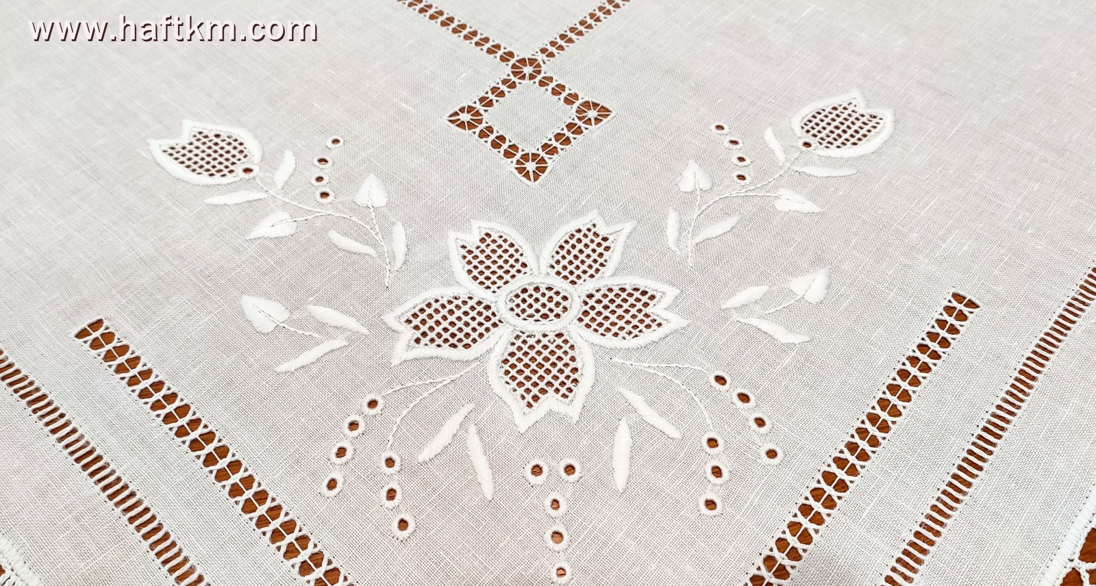 Technika wykonania: haft wypukły, haft toledo, mereżka wiązana i mereżka prosta.