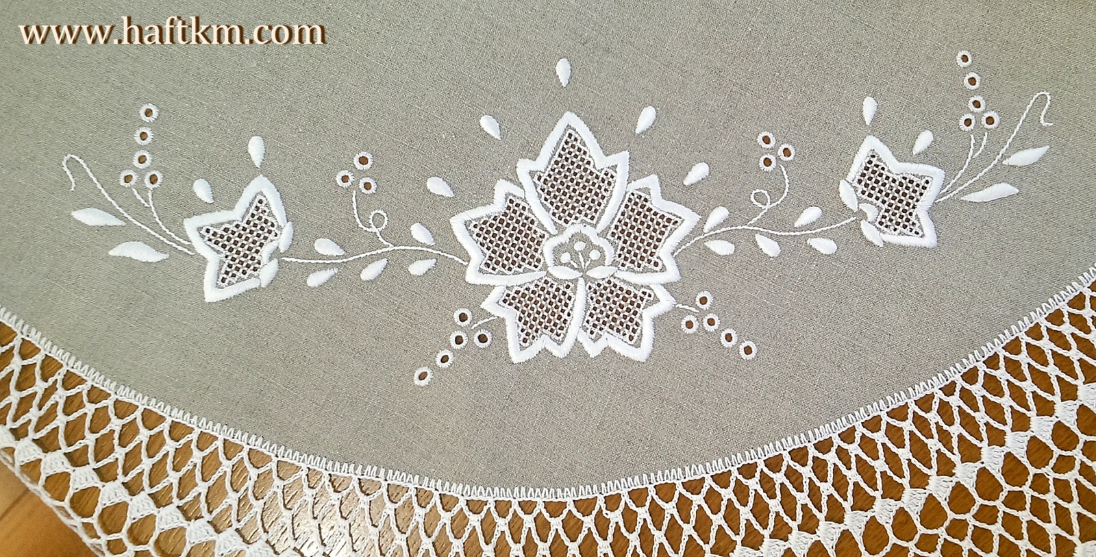 techniką hafciarską, haft wypukły, haft toledo. Ponadto serweta została misternie ozdobiona elegancką i misterną koronką szydełkową.