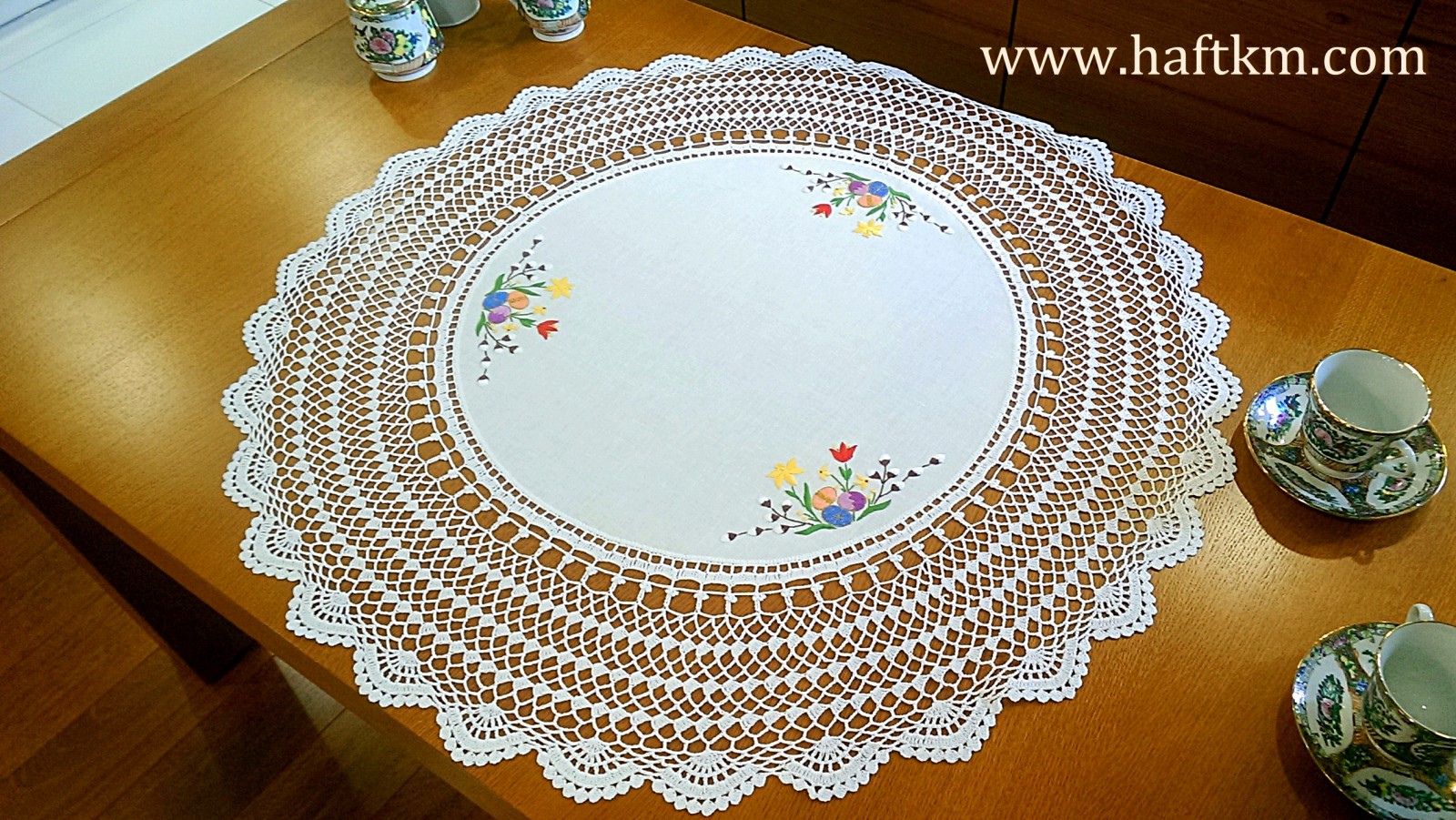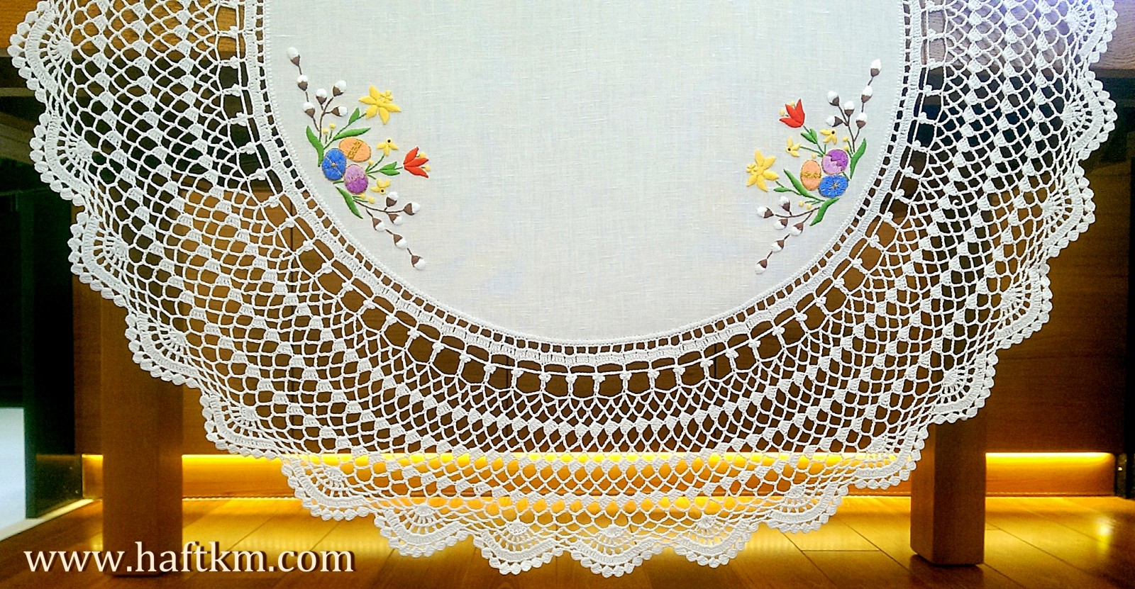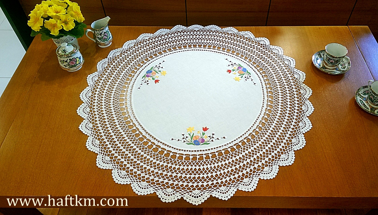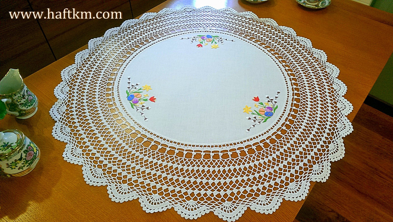 techniką hafciarską, haft wypukły. Ponadto serweta została misternie ozdobiona elegancką i misterną koronką szydełkową.