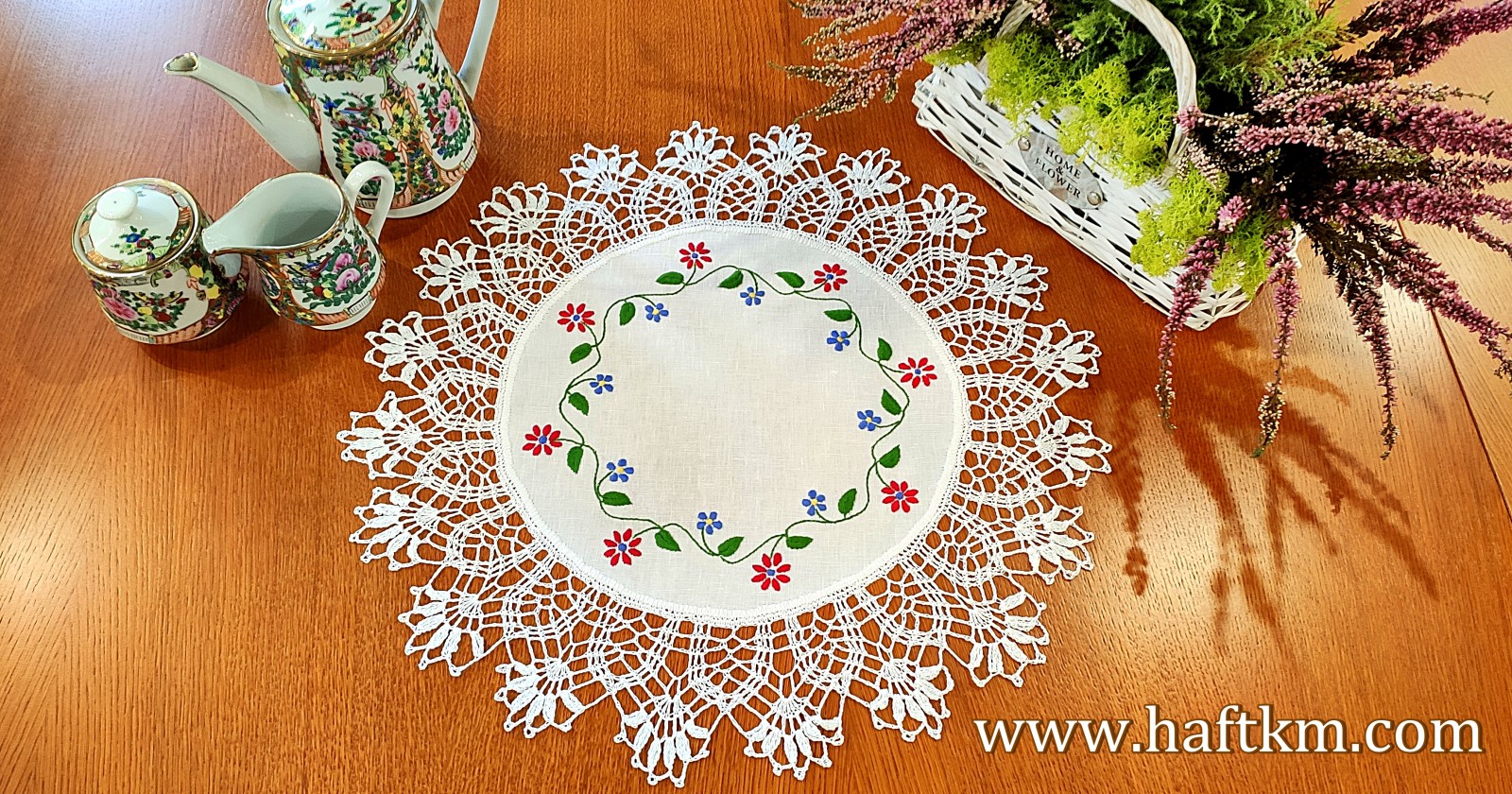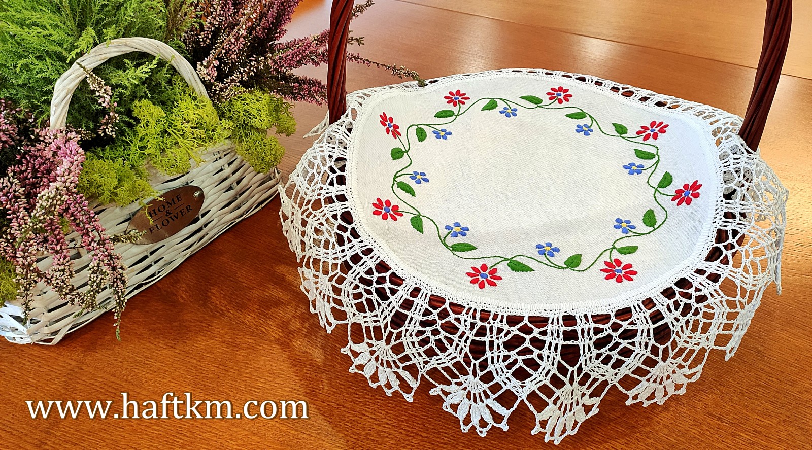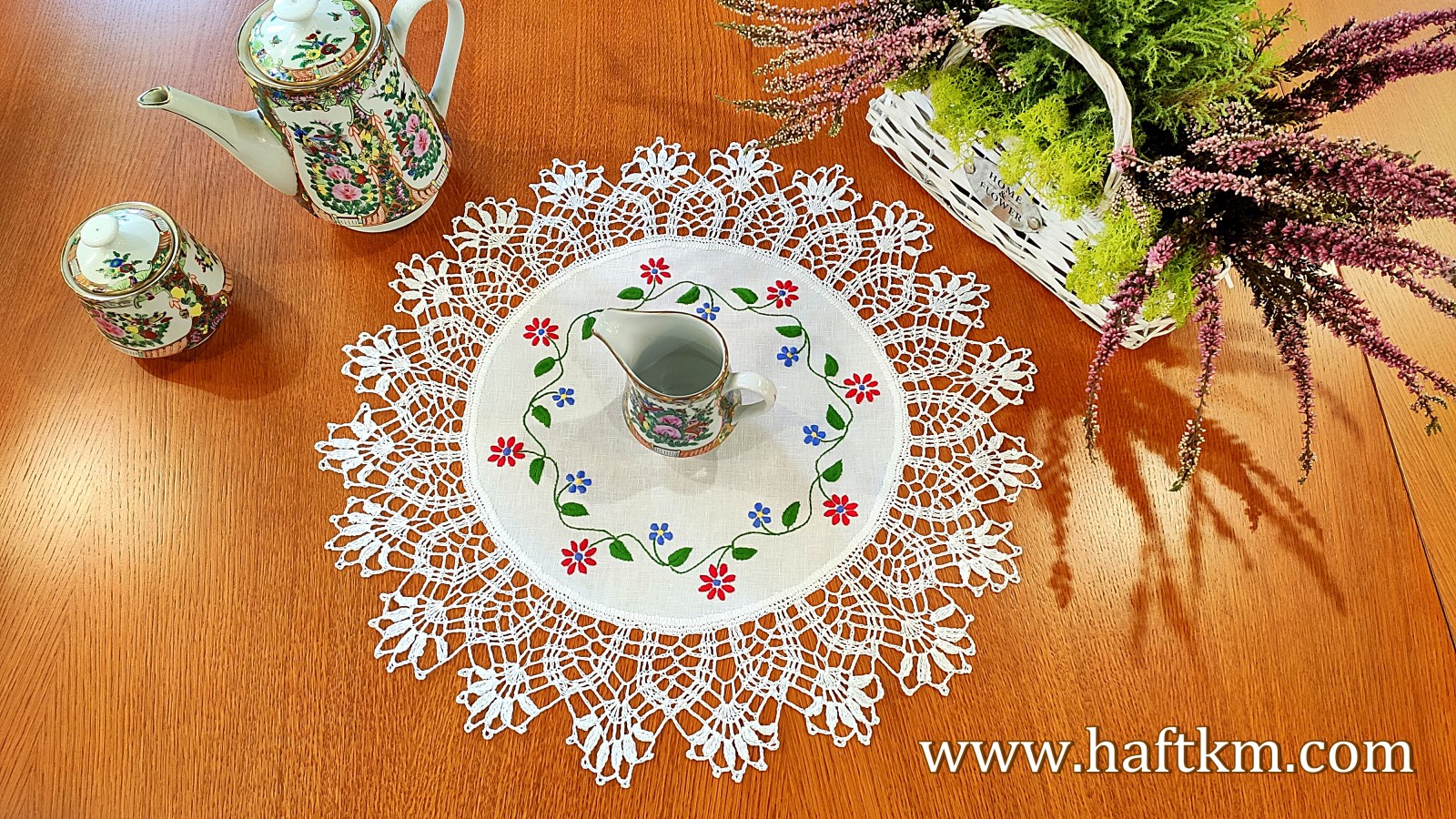 techniką hafciarską, haft wypukły. Ponadto serweta została misternie ozdobiona elegancką i misterną koronką szydełkową.