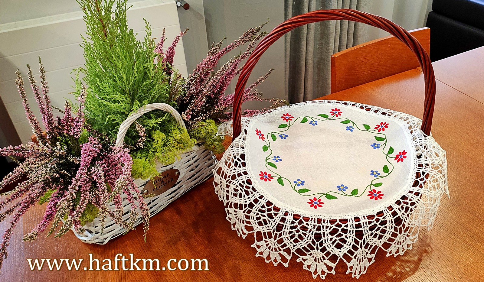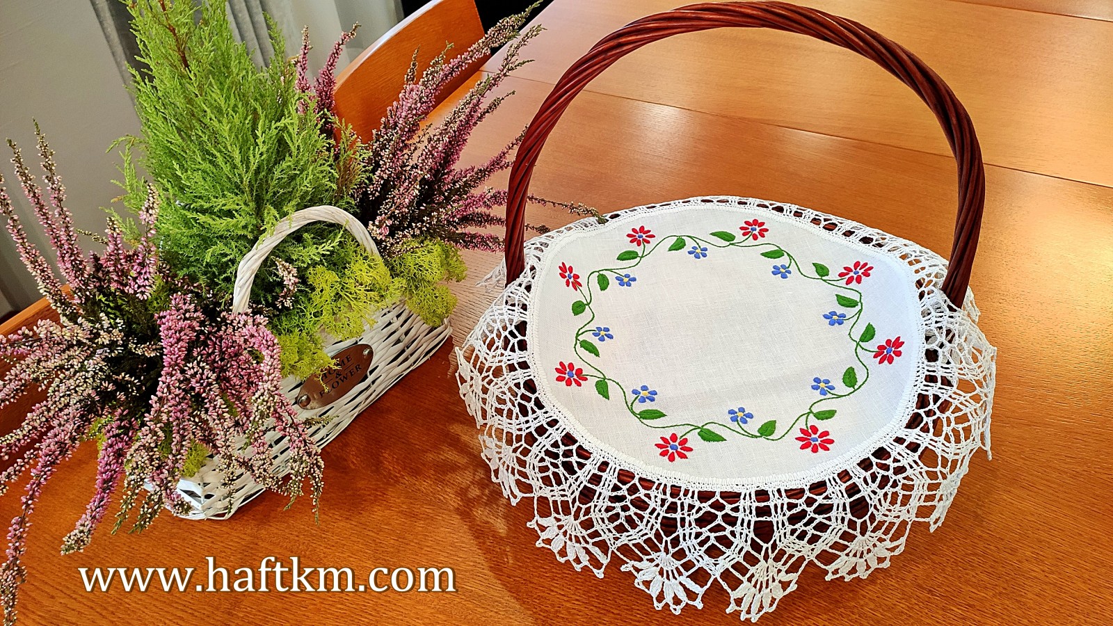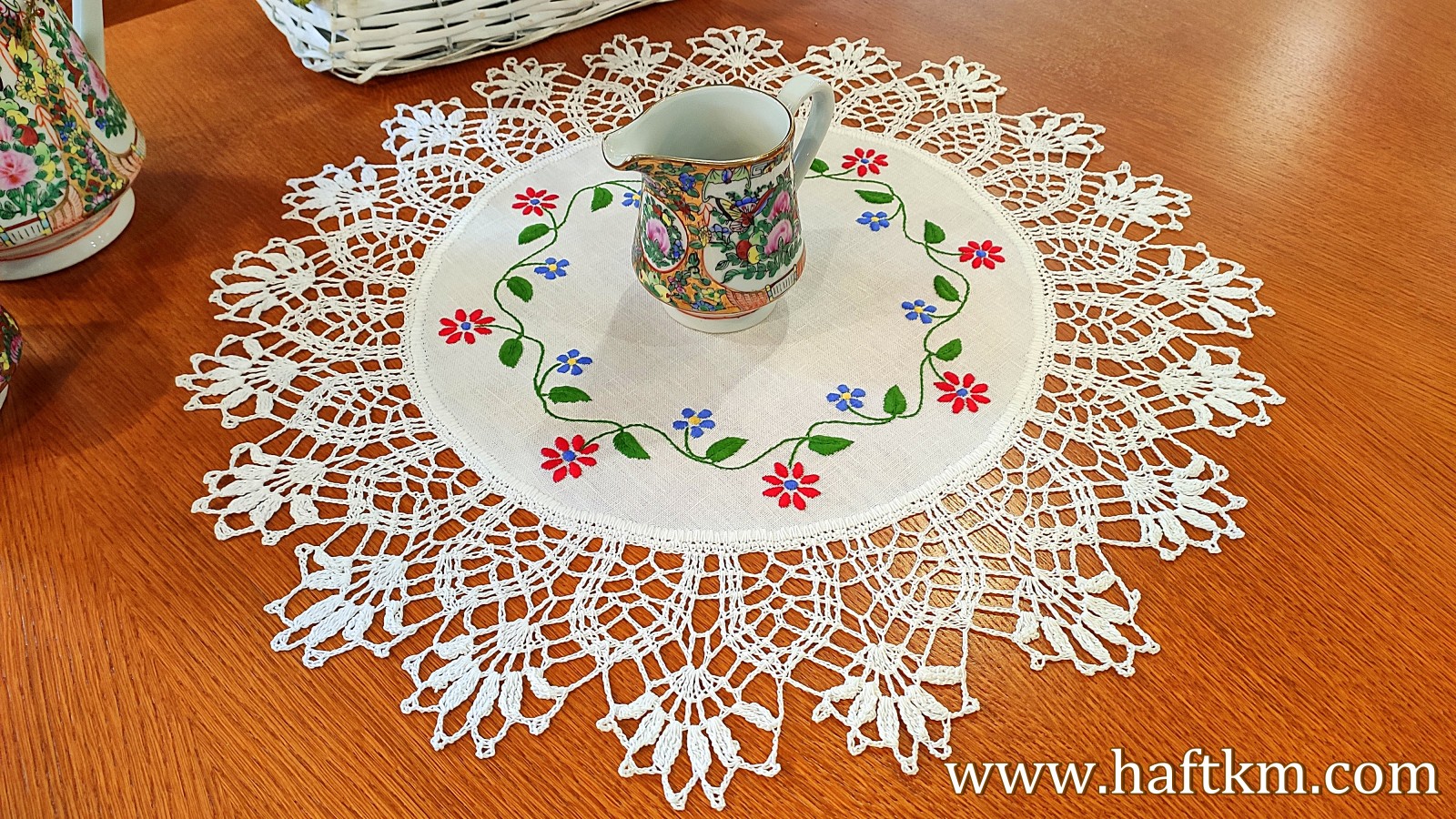 techniką hafciarską, haft wypukły. Ponadto serweta została misternie ozdobiona elegancką i misterną koronką szydełkową.
