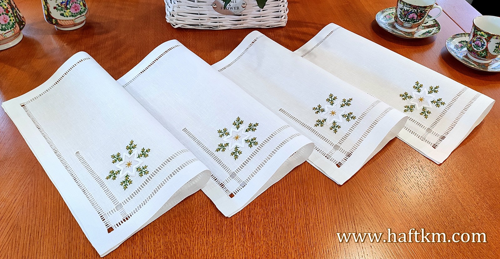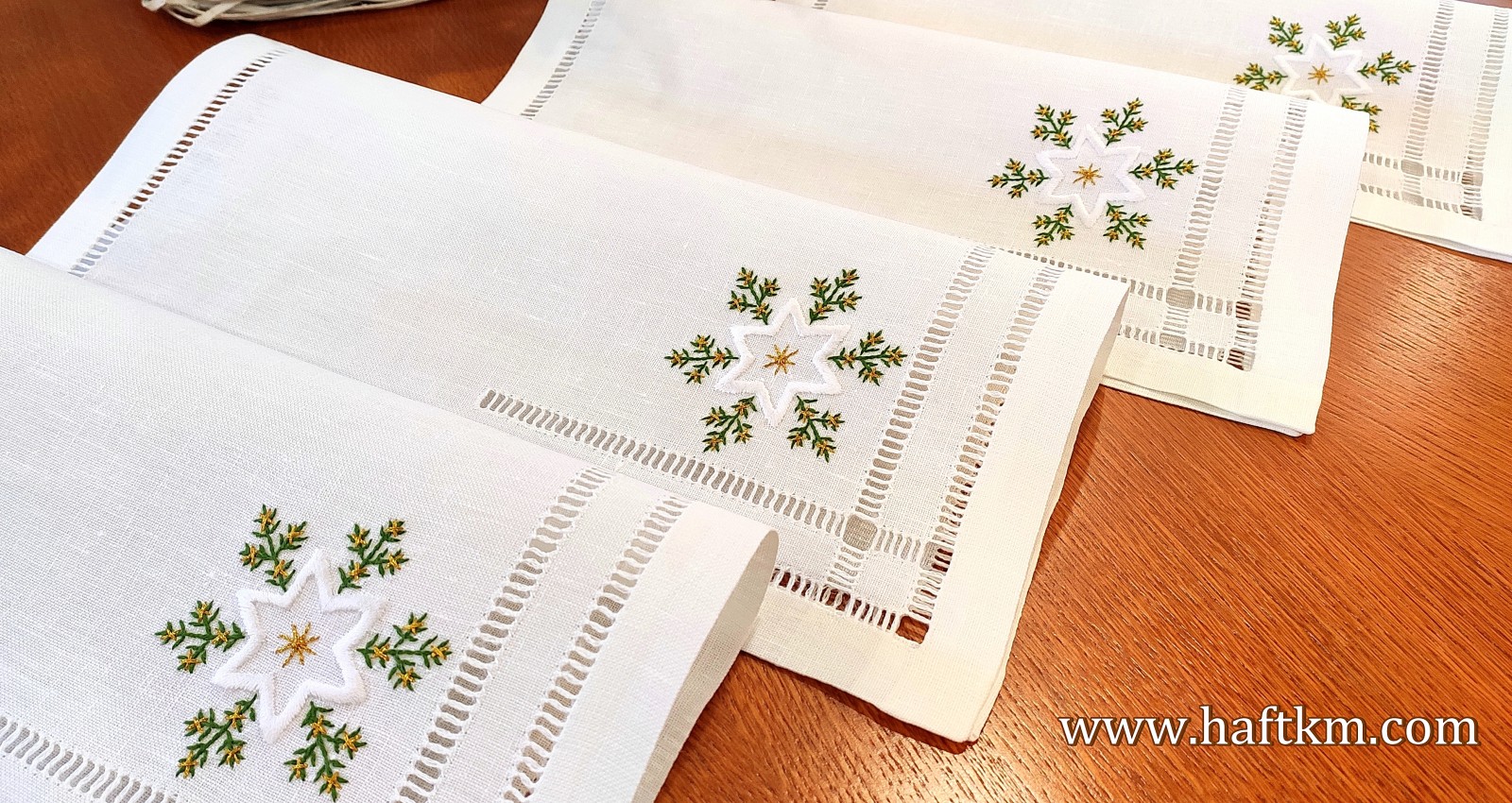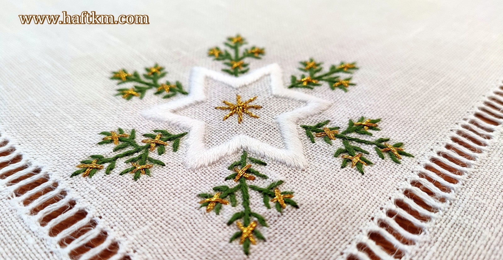 techniką haft wypukły. Ponadto serweta została misternie ozdobiona elegancką i estetyczną mereżką.