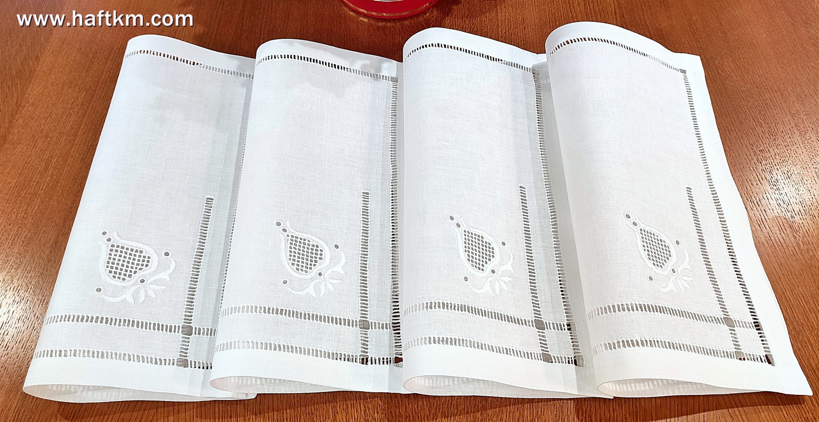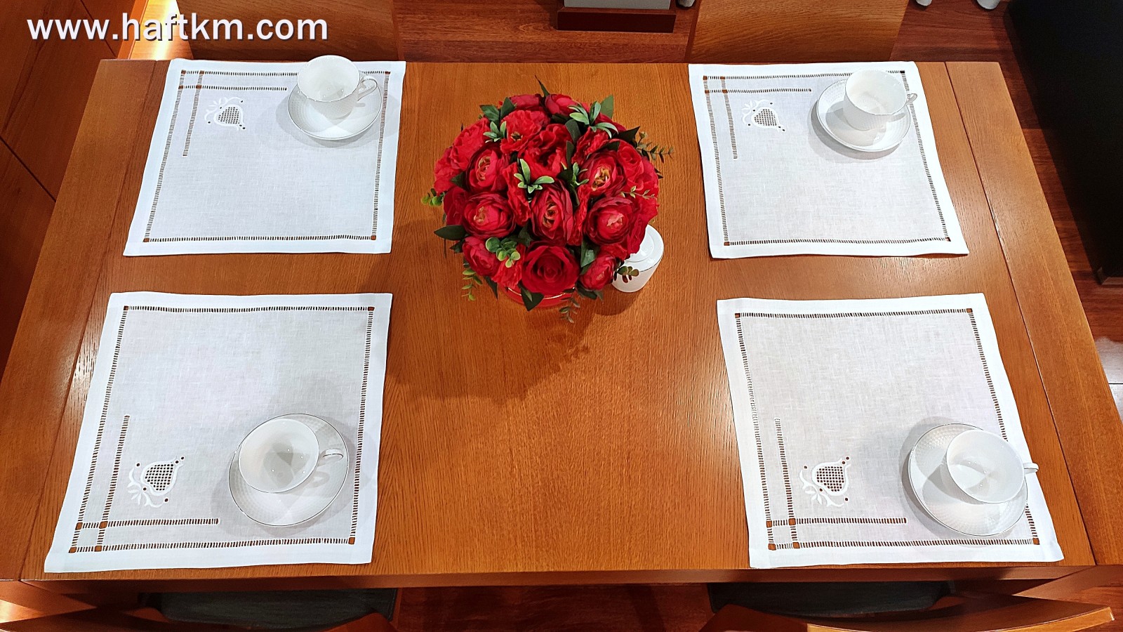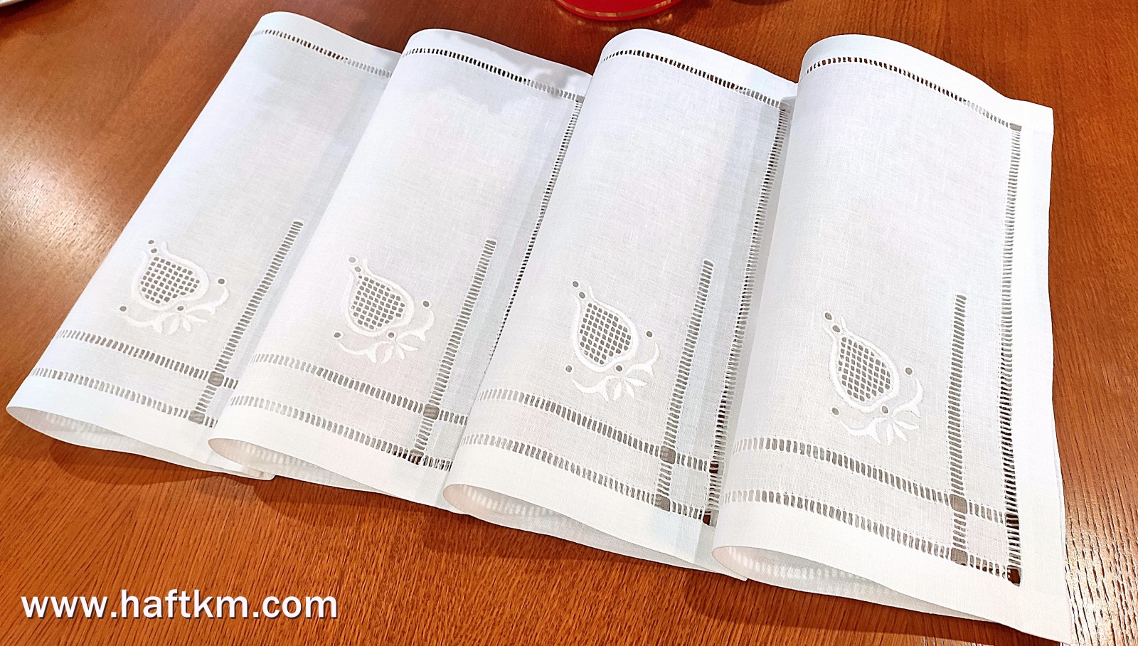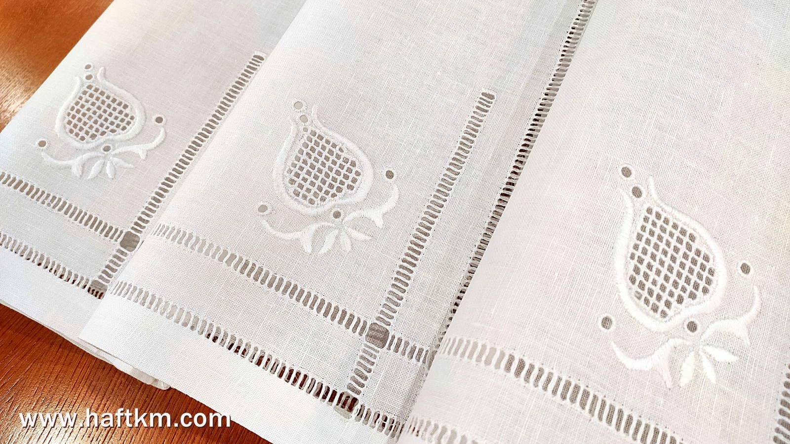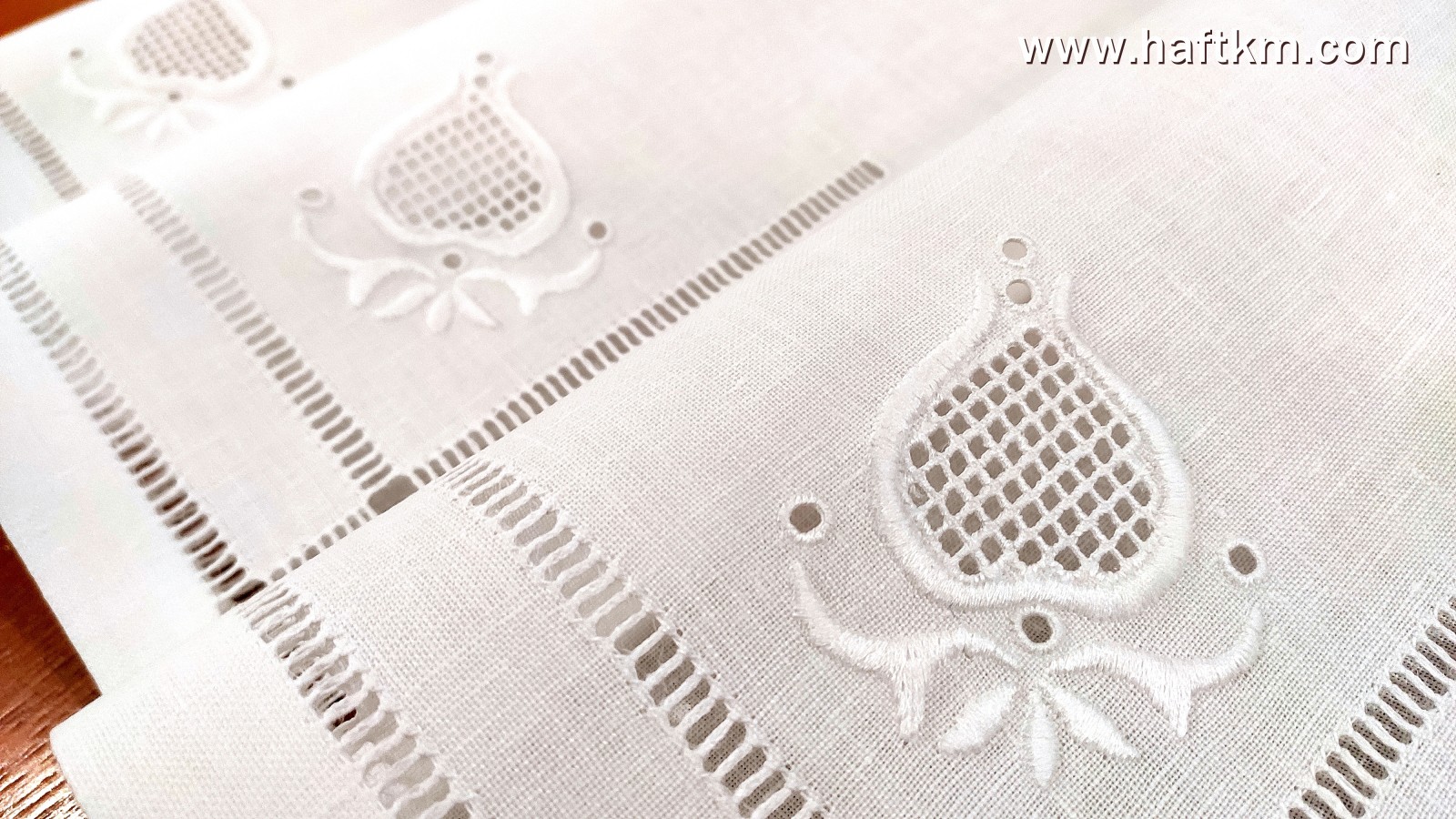 techniką haft wypukły, haft toledo. Ponadto serweta została misternie ozdobiona elegancką i estetyczną mereżką.