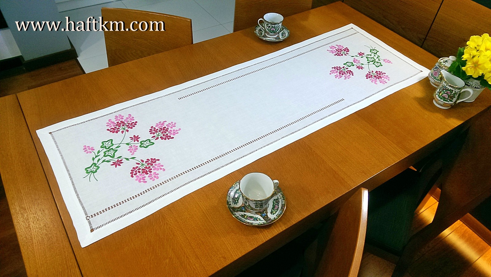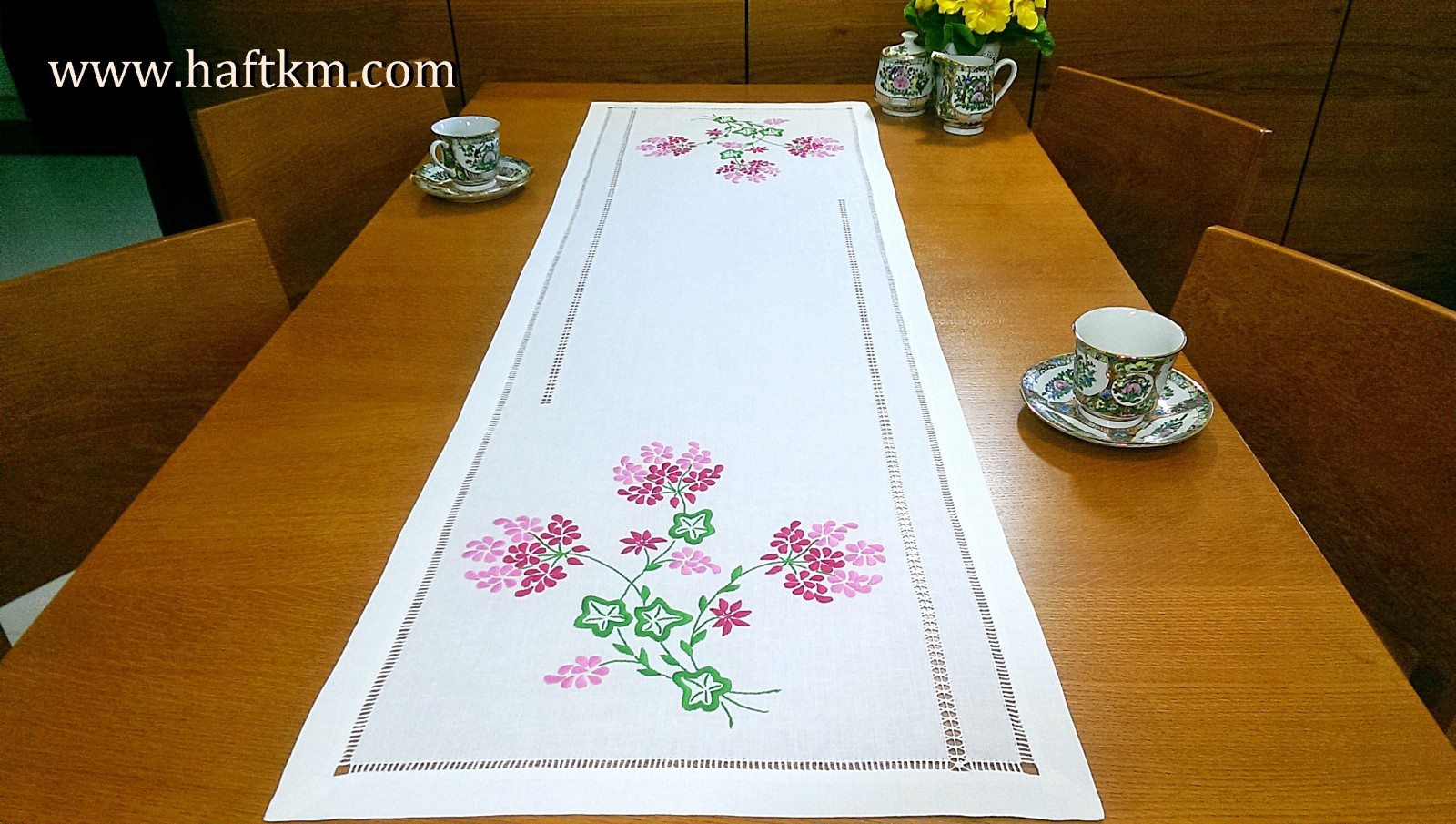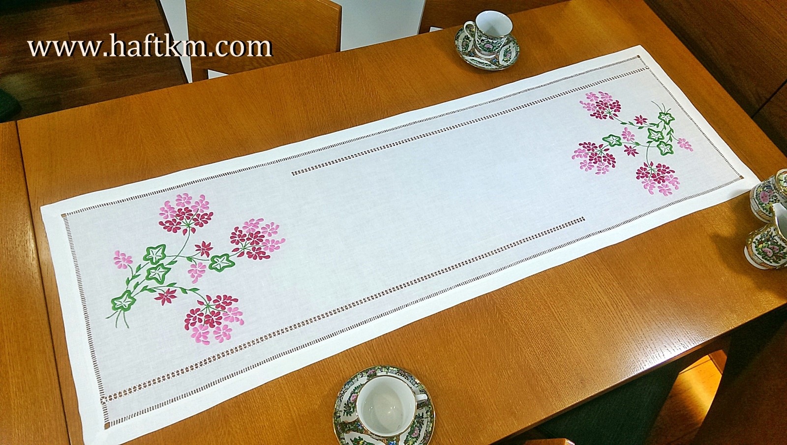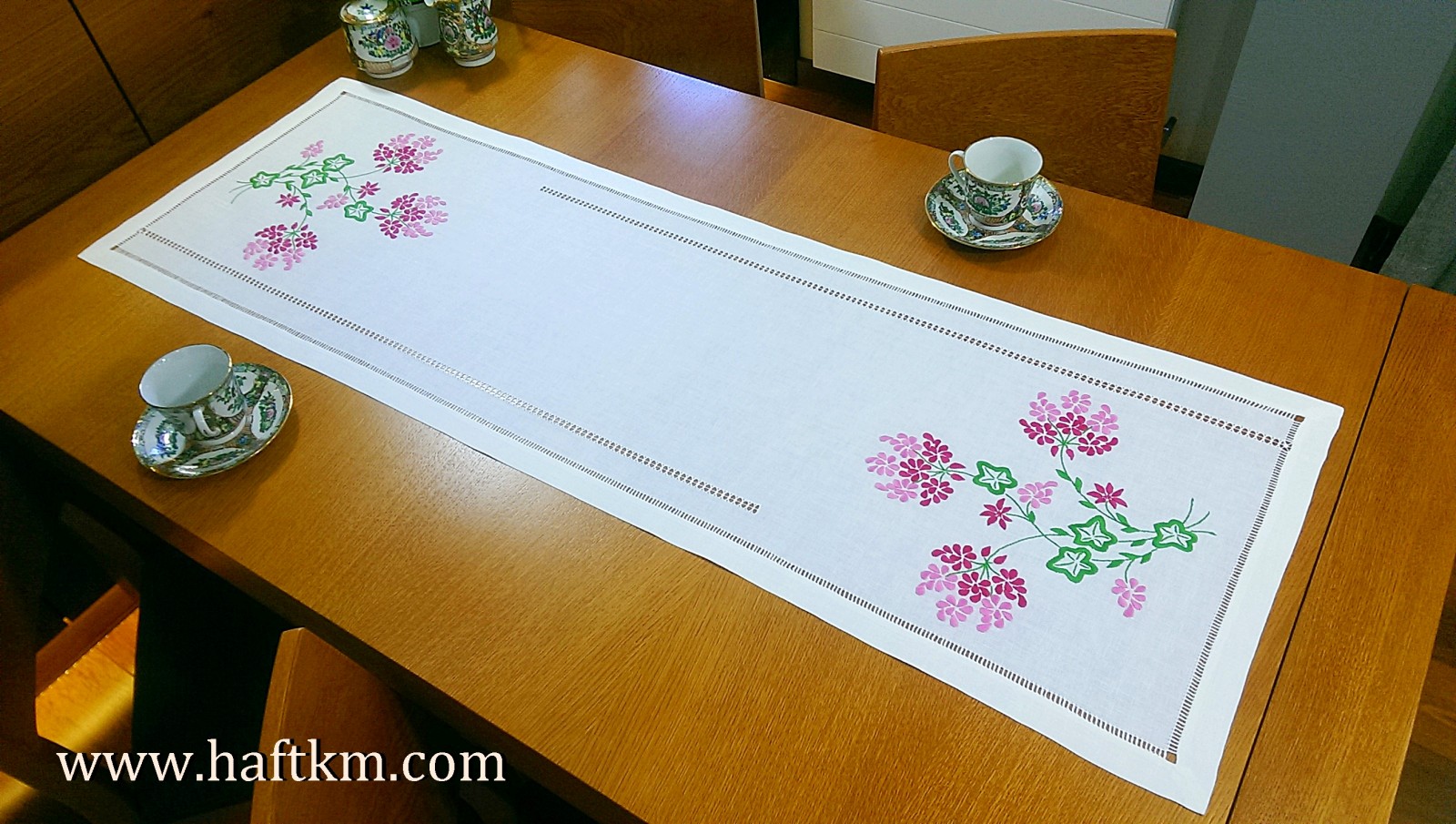 techniką hafciarską - haft wypukły. Ponadto bieżnik został misternie ozdobiony elegancką i estetyczną mereżką.