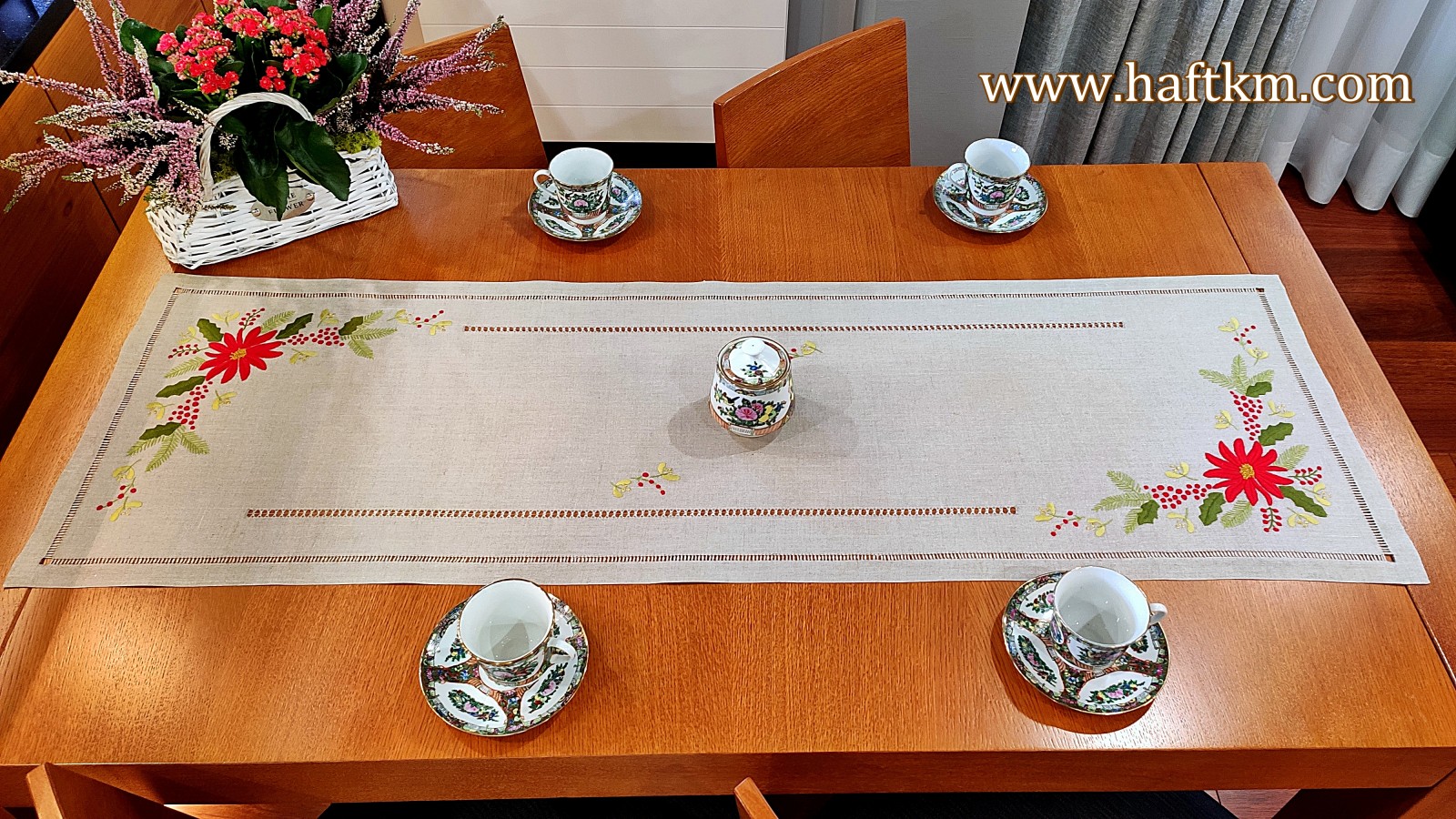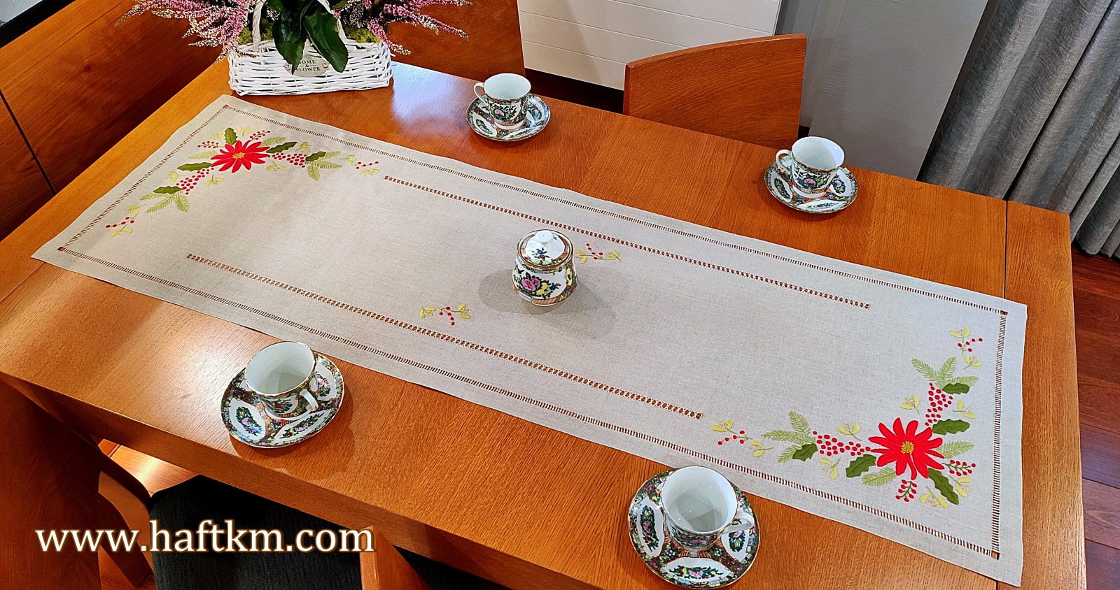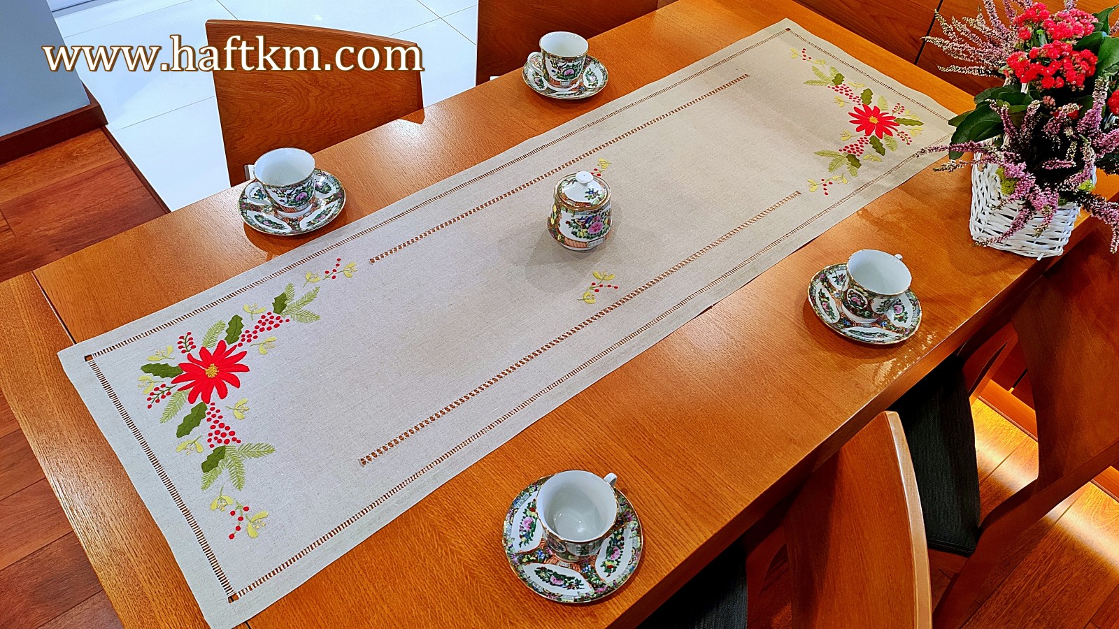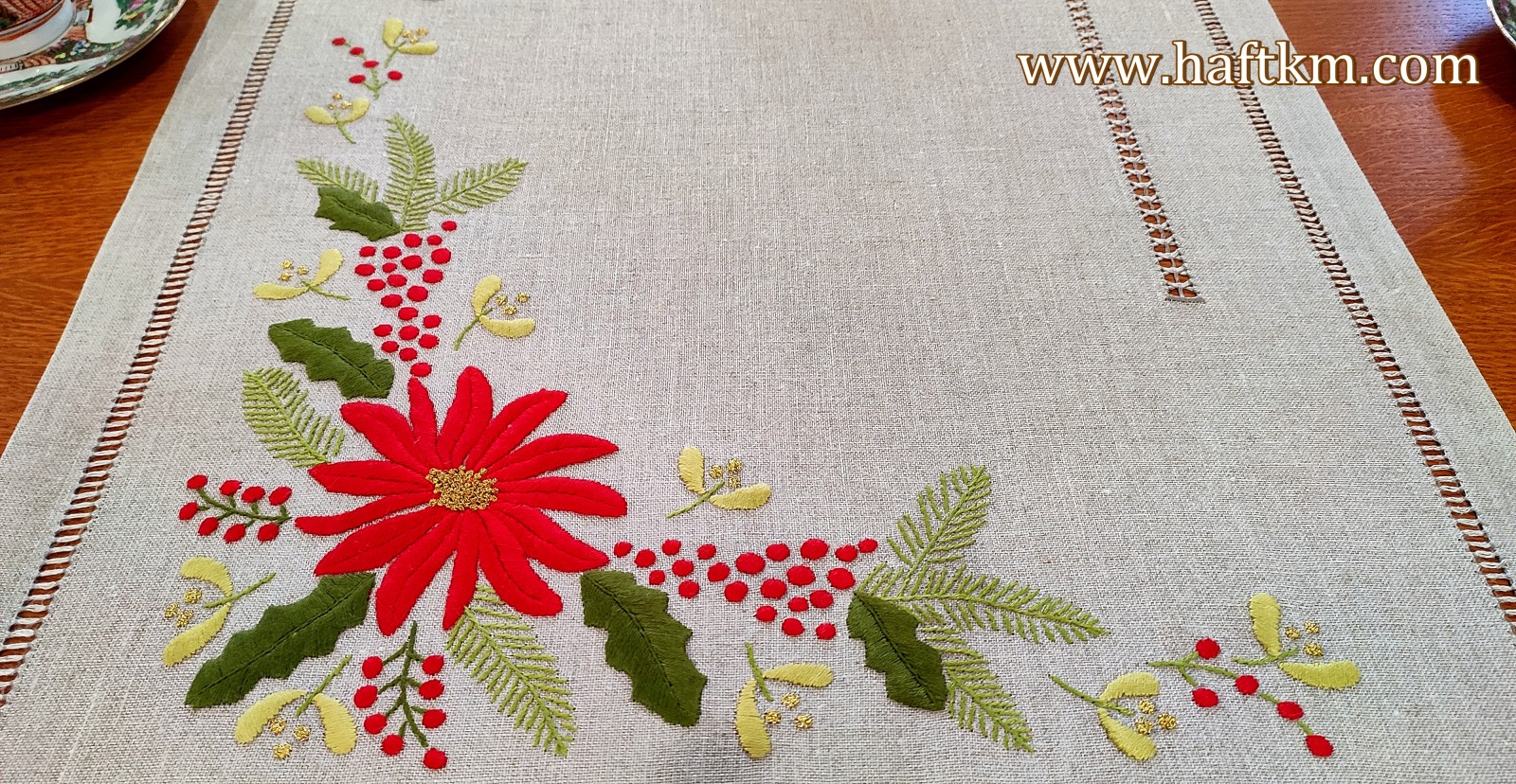 techniką hafciarską, haft wypukły. Ponadto bieżnik został misternie ozdobiony elegancką i estetyczną mereżką.