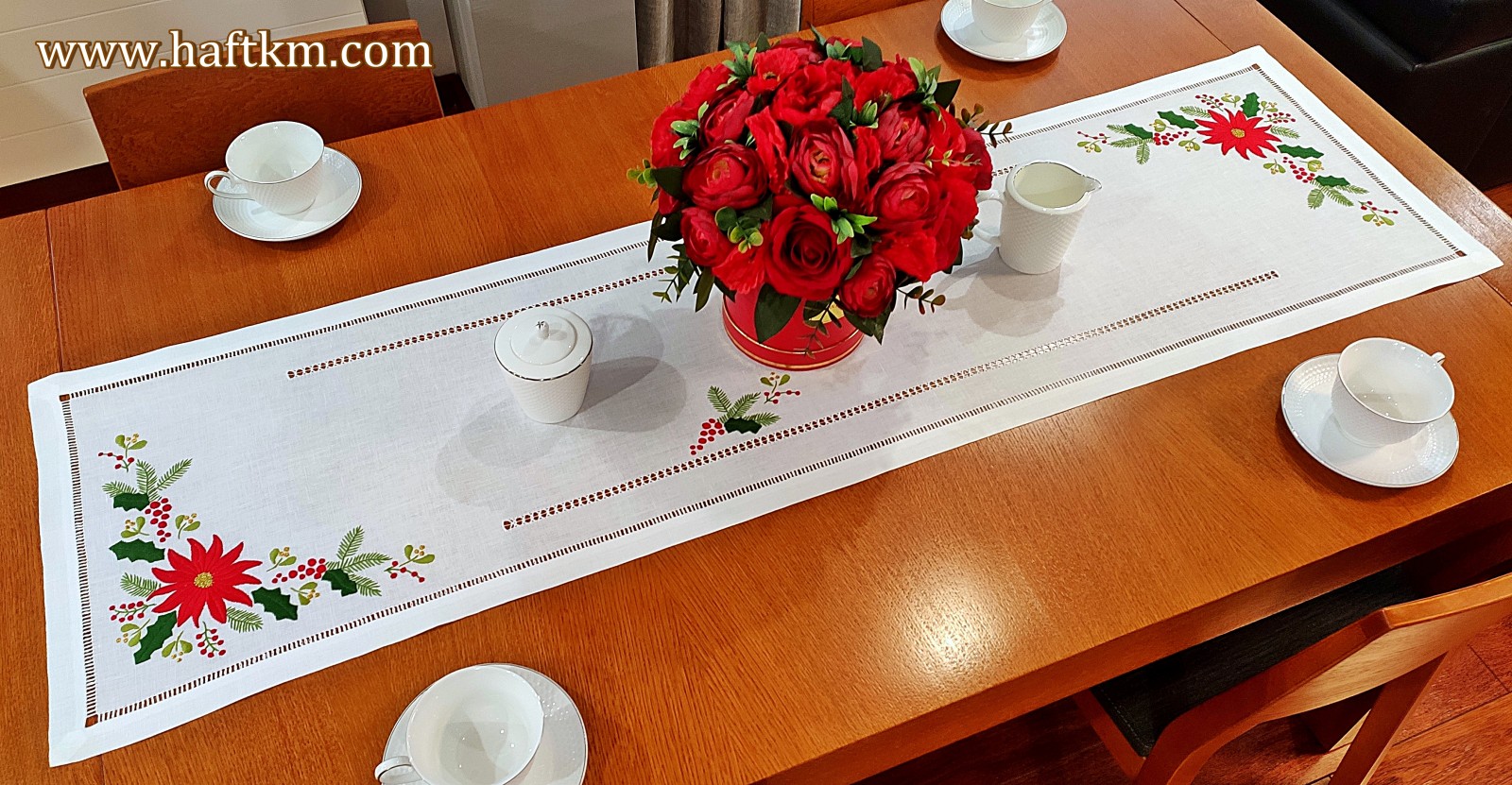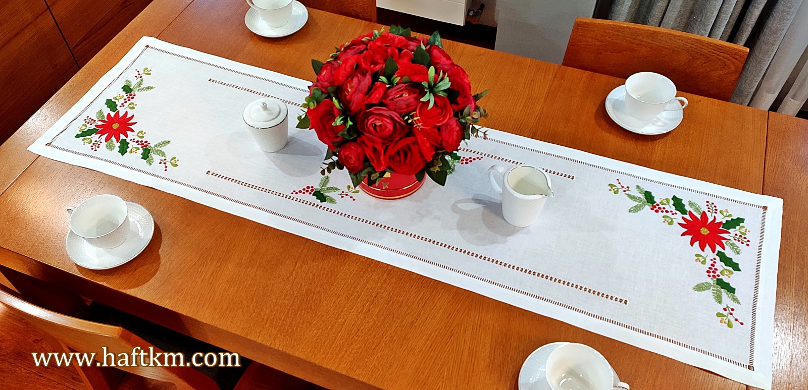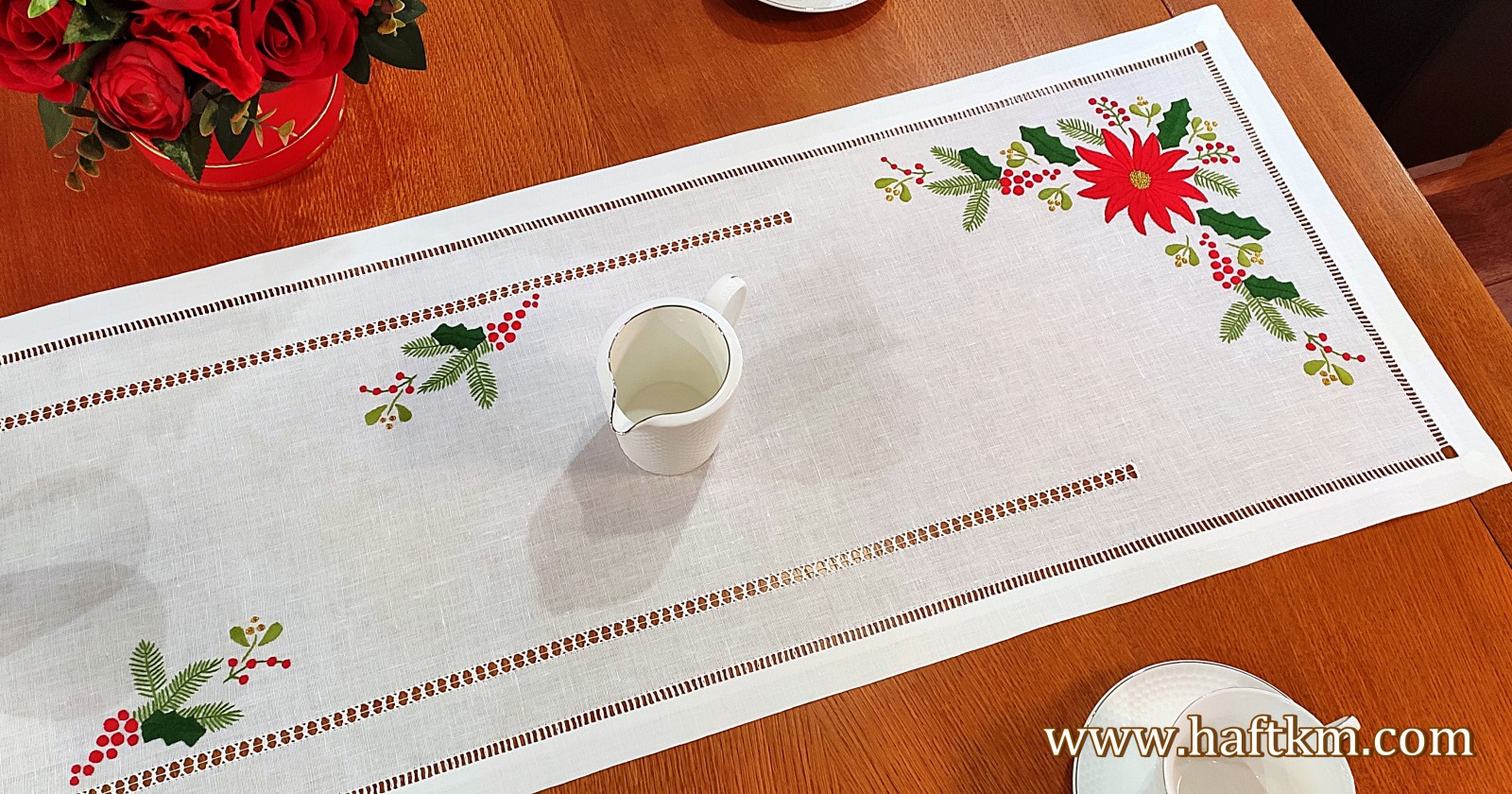 techniką hafciarską, haft wypukły. Ponadto bieżnik został misternie ozdobiony elegancką i estetyczną mereżką.