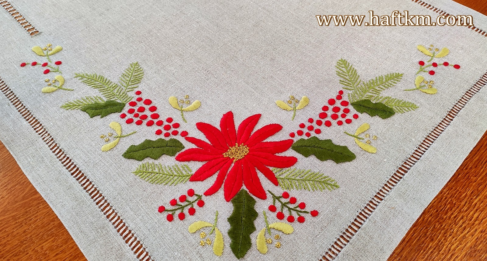Materiał: naturalny len 100 %, nici bawełniane 100% mulina, nici metalizowane.