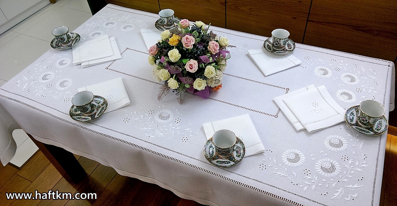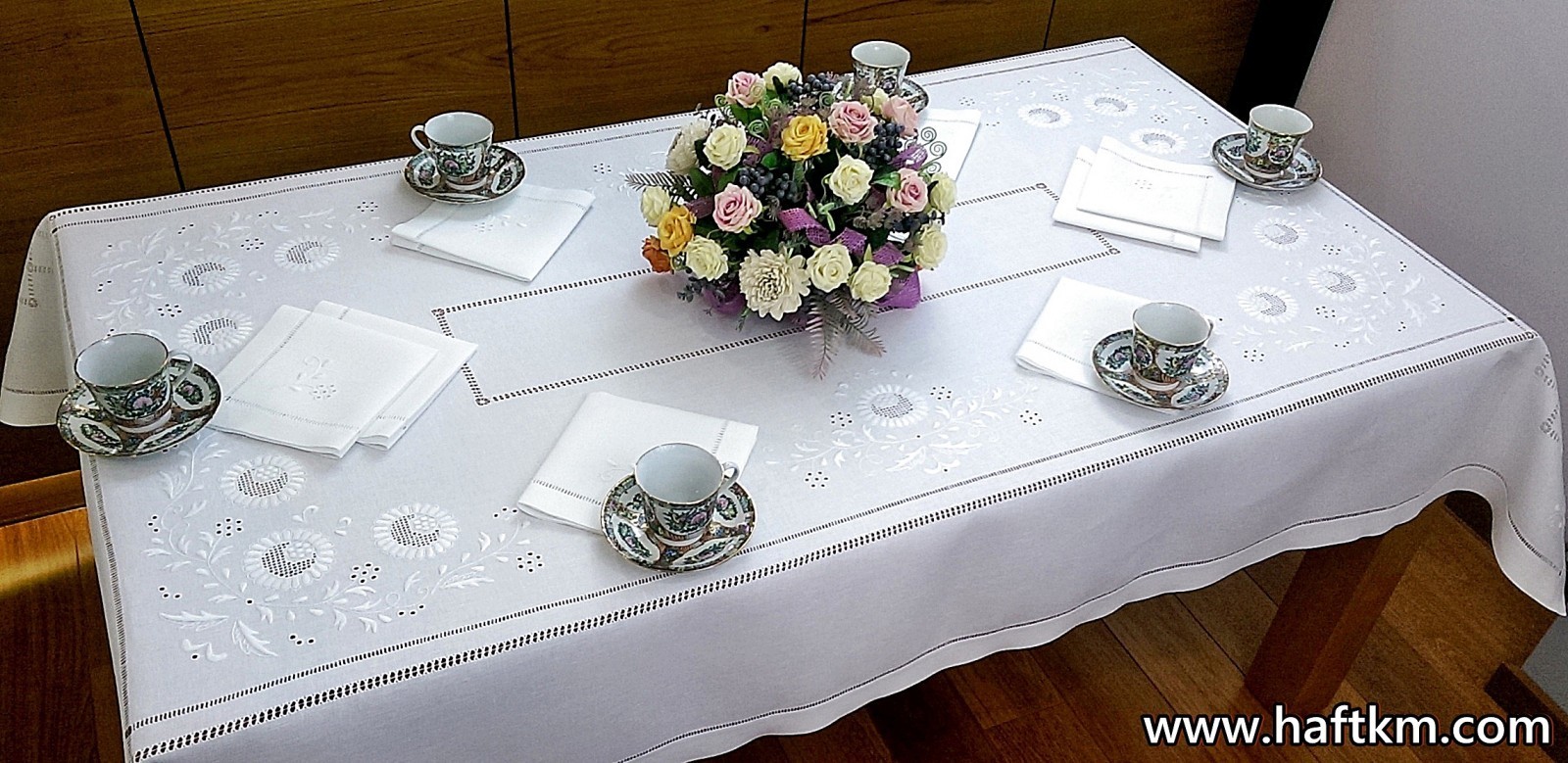 Komplet składa się z obrusa i ośmiu serwetek.