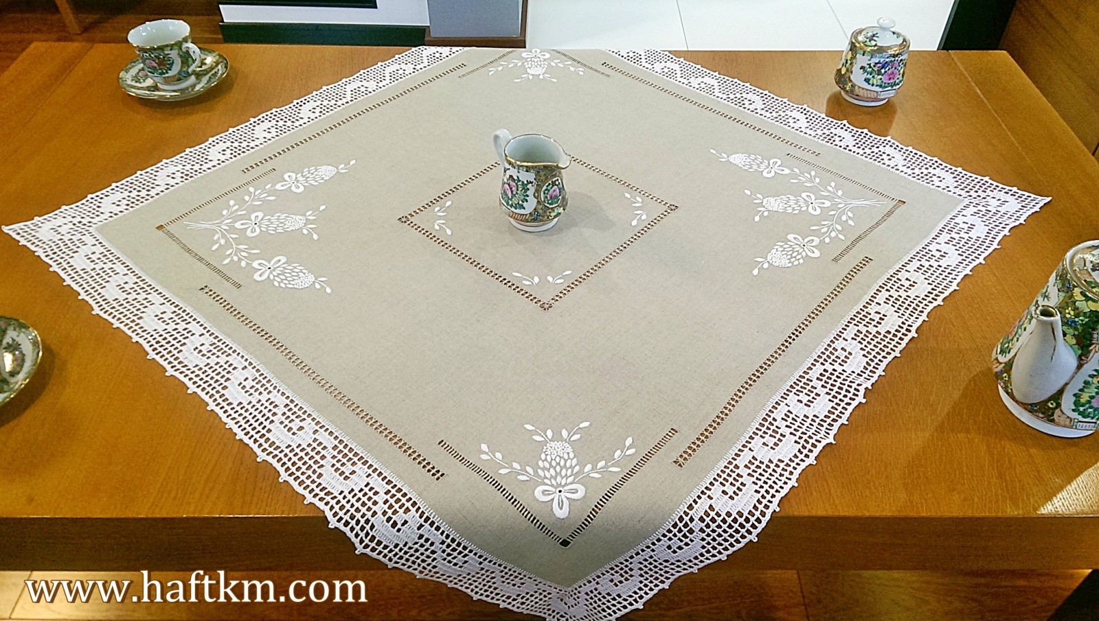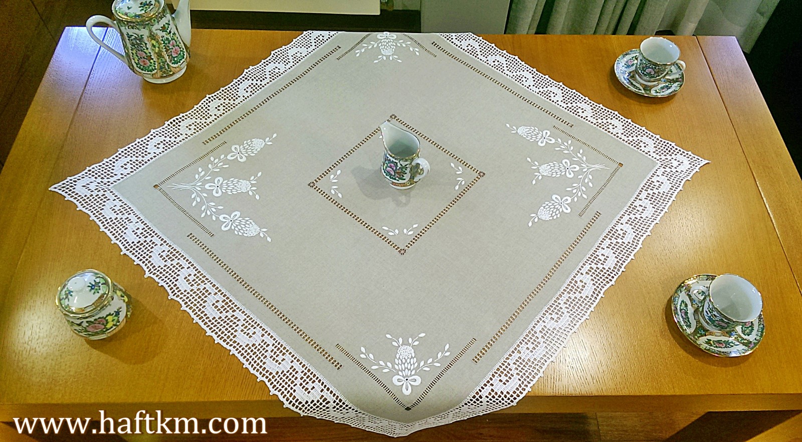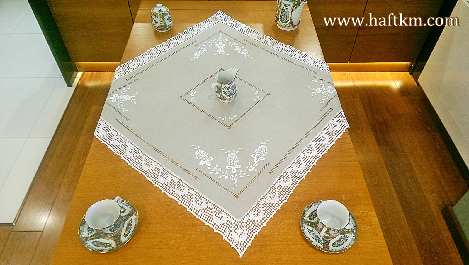 techniką hafciarską - haft wypukły, haft toledo. Obrus został misternie ozdobiony elegancką i estetyczną mereżką. Brzegi obrusa ozdabia, piękna koronka szydełkowa wykonana ręcznie.