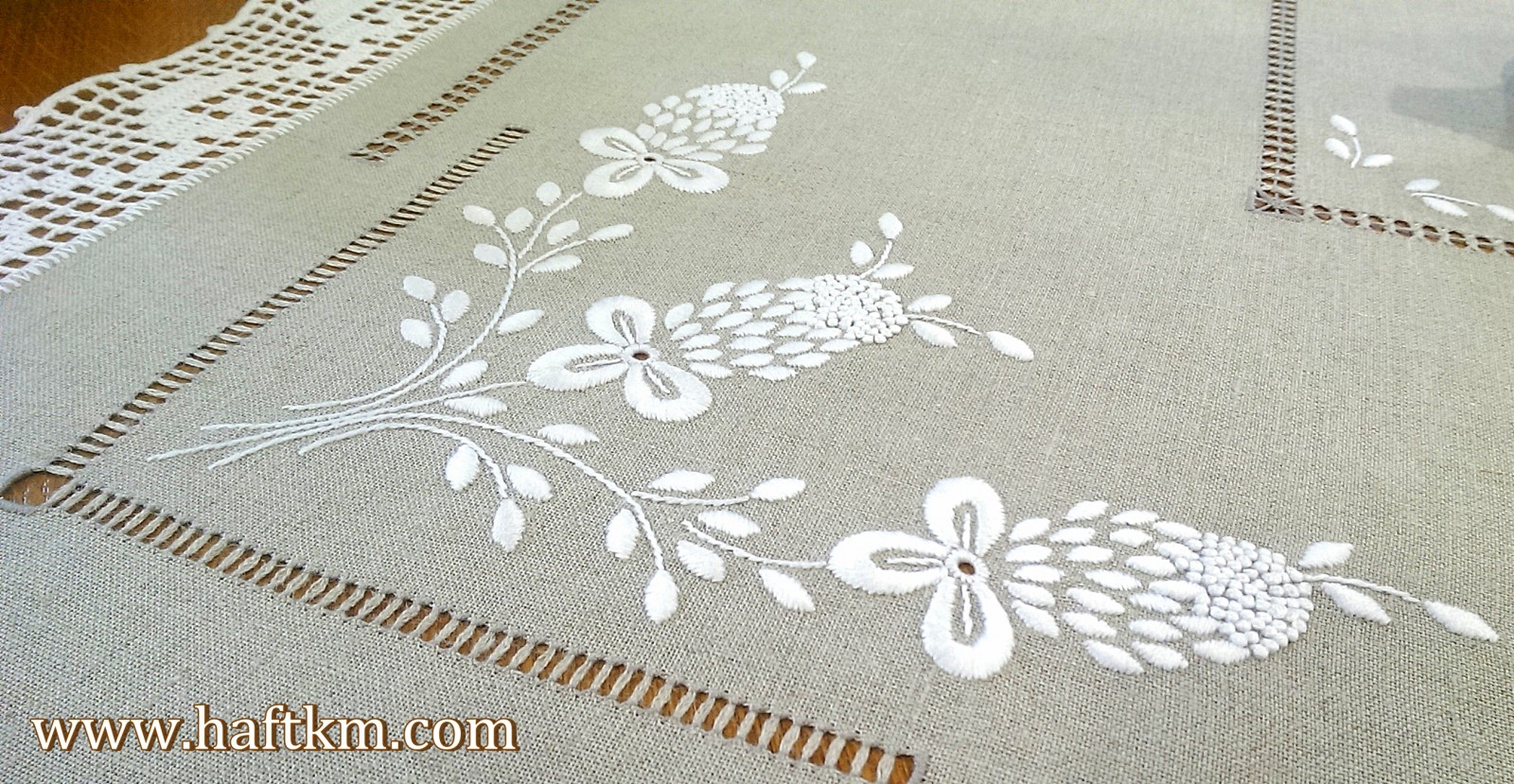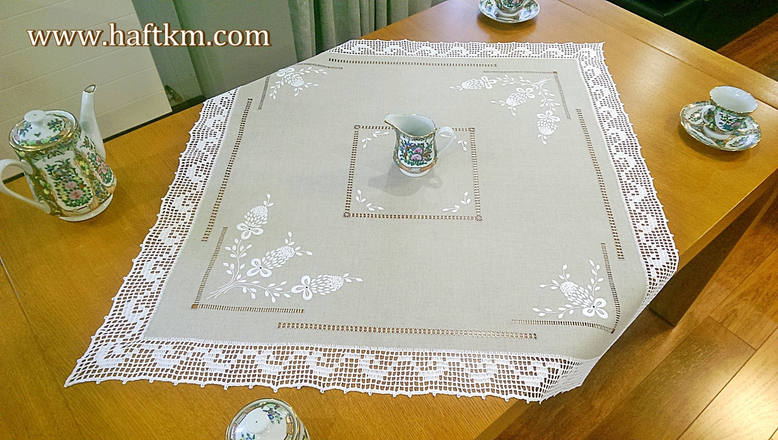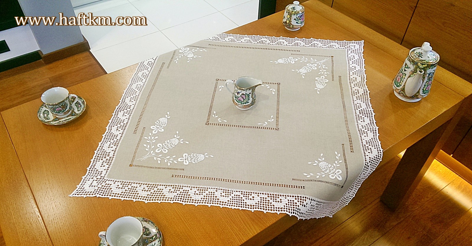 techniką hafciarską - haft wypukły, haft toledo. Obrus został misternie ozdobiony elegancką i estetyczną mereżką. Brzegi obrusa ozdabia, piękna koronka szydełkowa wykonana ręcznie.