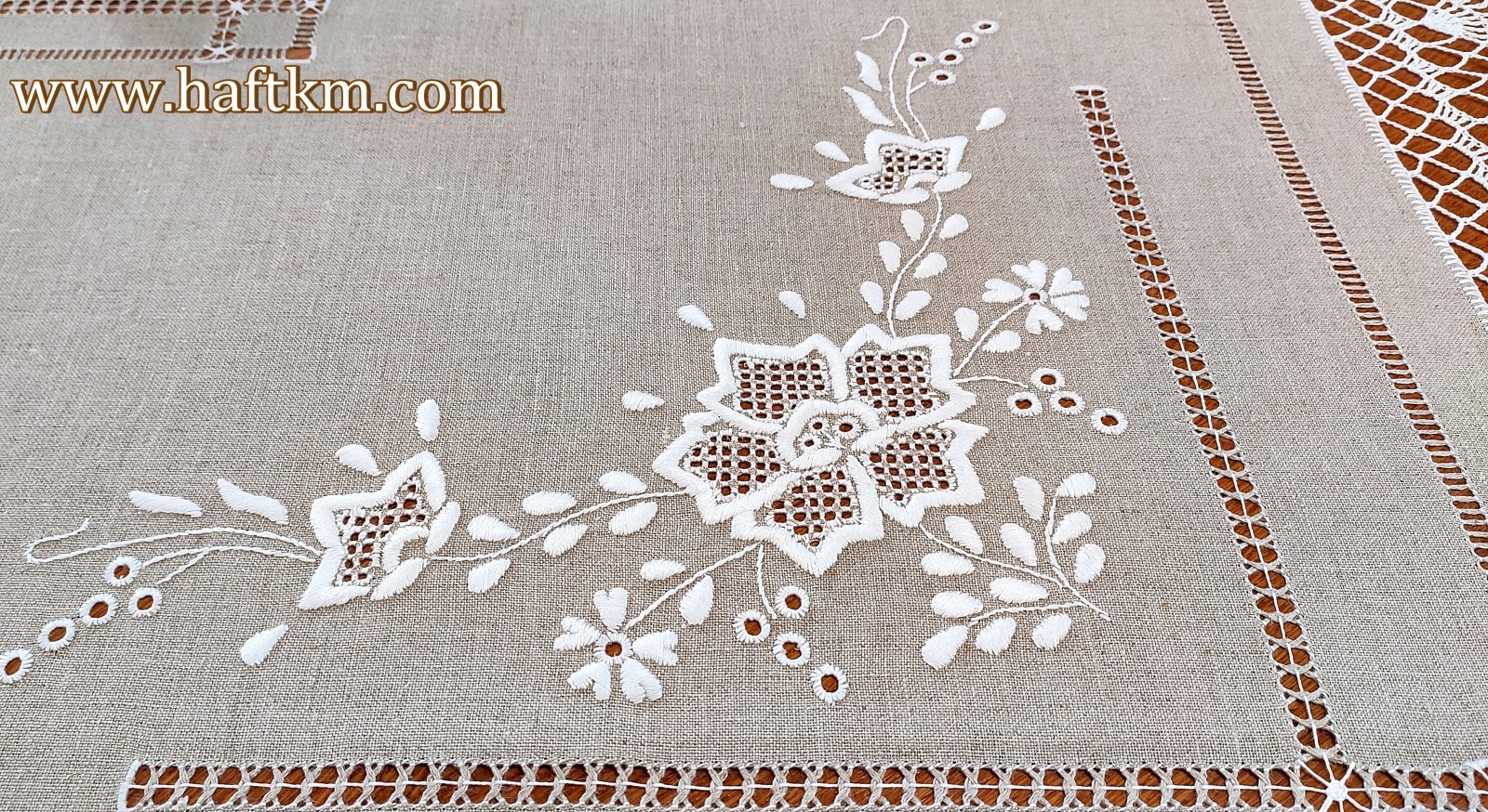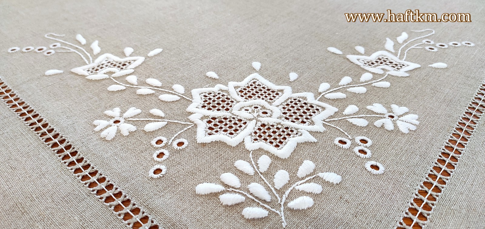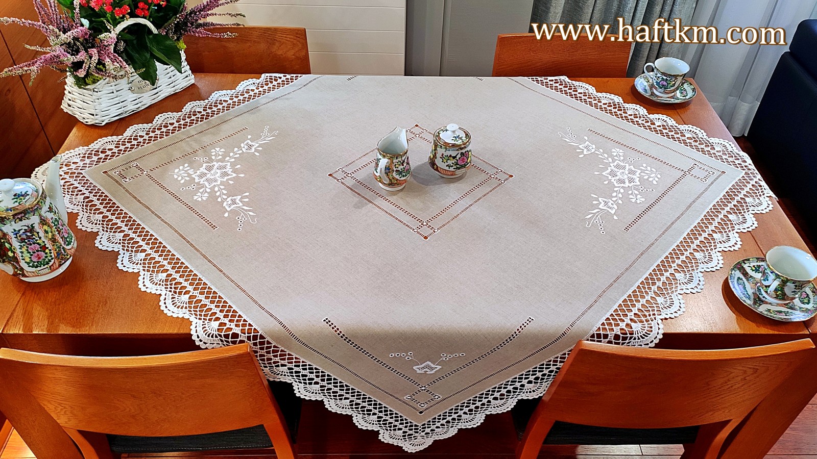 techniką hafciarską - haft wypukły, haft toledo. Obrus został misternie ozdobiony elegancką i estetyczną mereżką. Brzegi obrusa ozdabia, piękna koronka szydełkowa wykonana ręcznie.