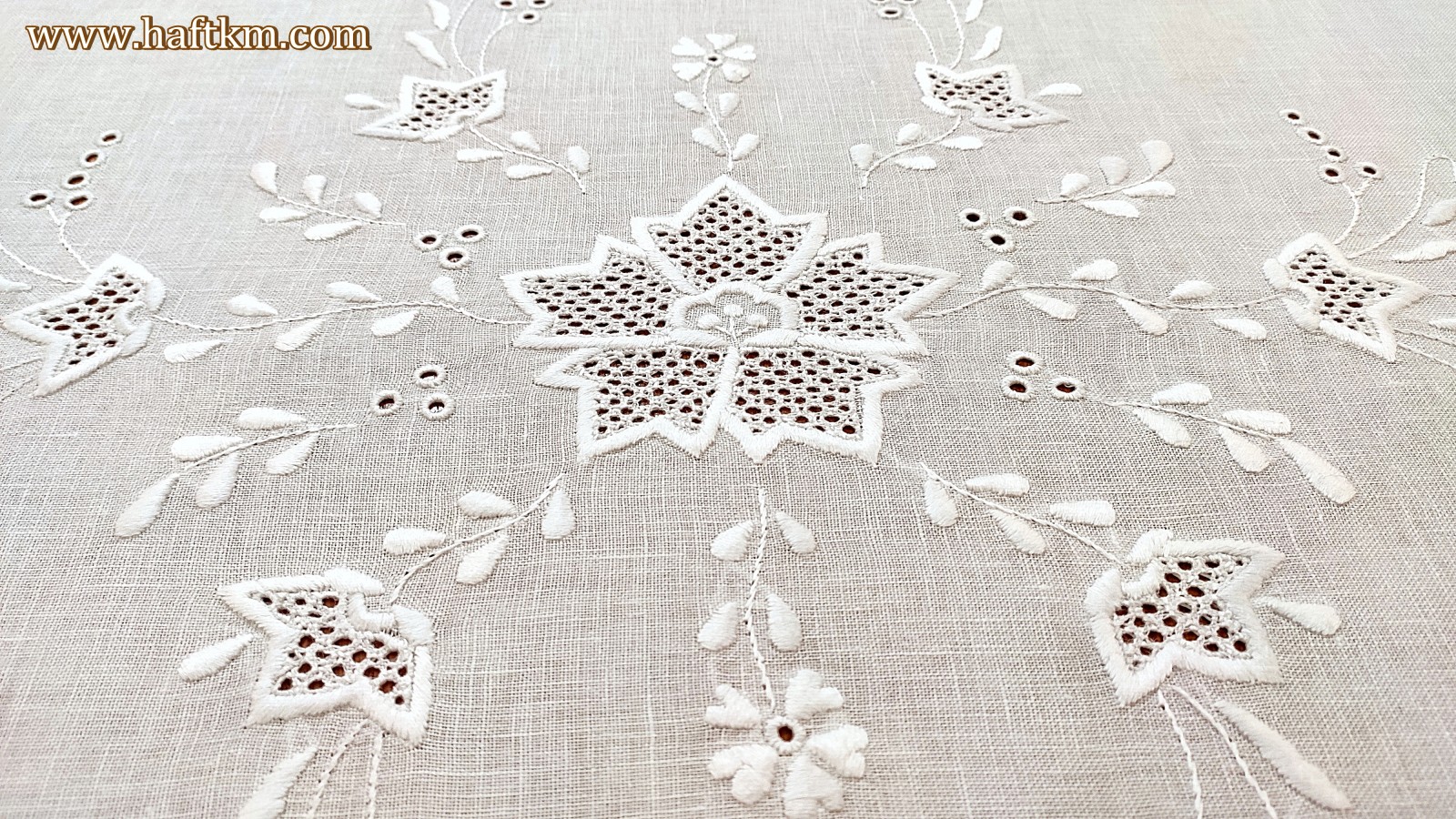 techniką hafciarską - haft wypukły, haft toledo. Ponadto obrus został misternie ozdobiony elegancką i estetyczną mereżką.