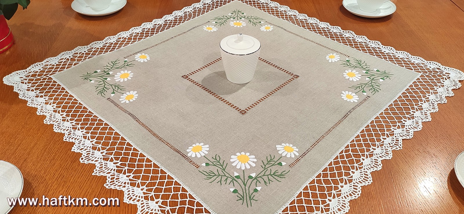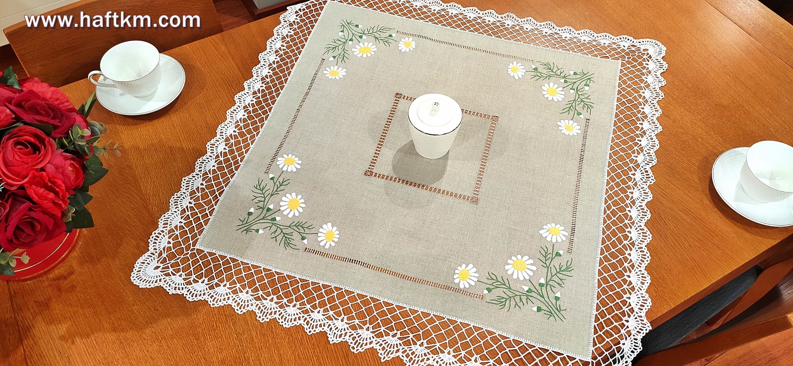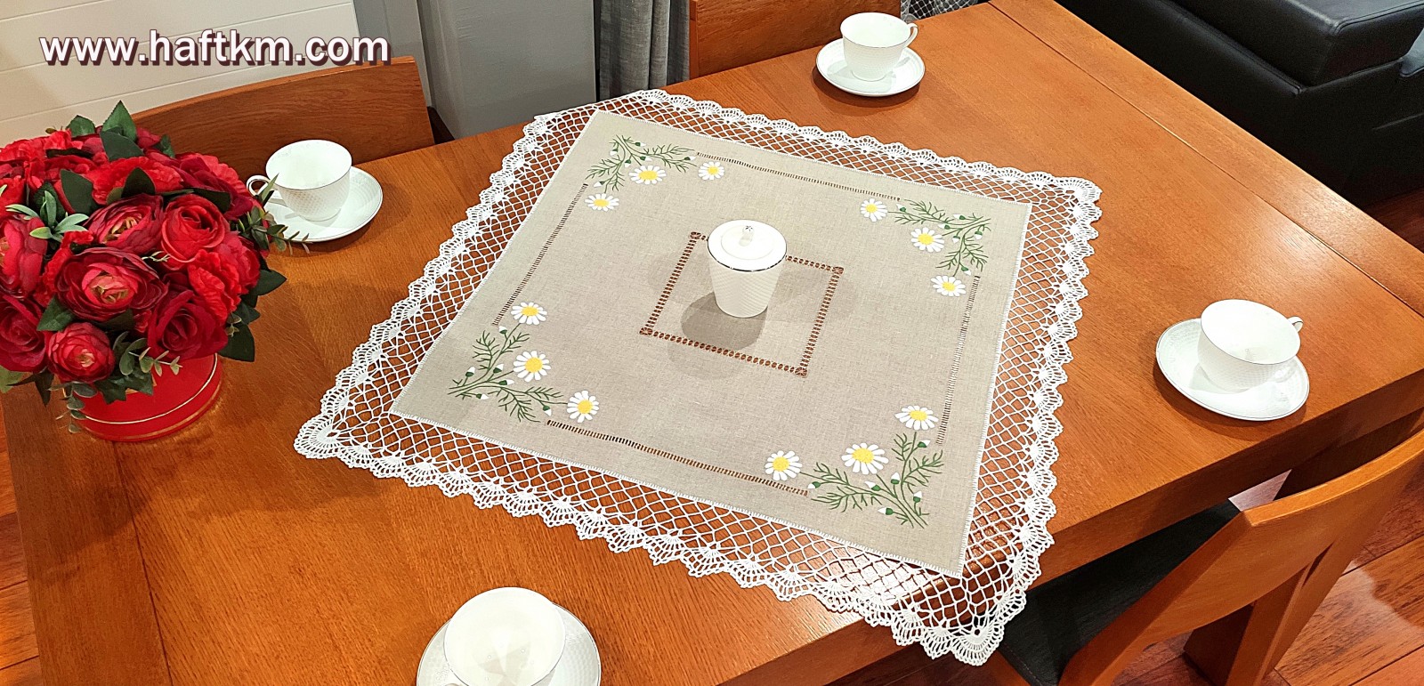 techniką hafciarską, haft angielski. Ponadto serweta została misternie ozdobiona elegancką i misterną koronką szydełkową.
