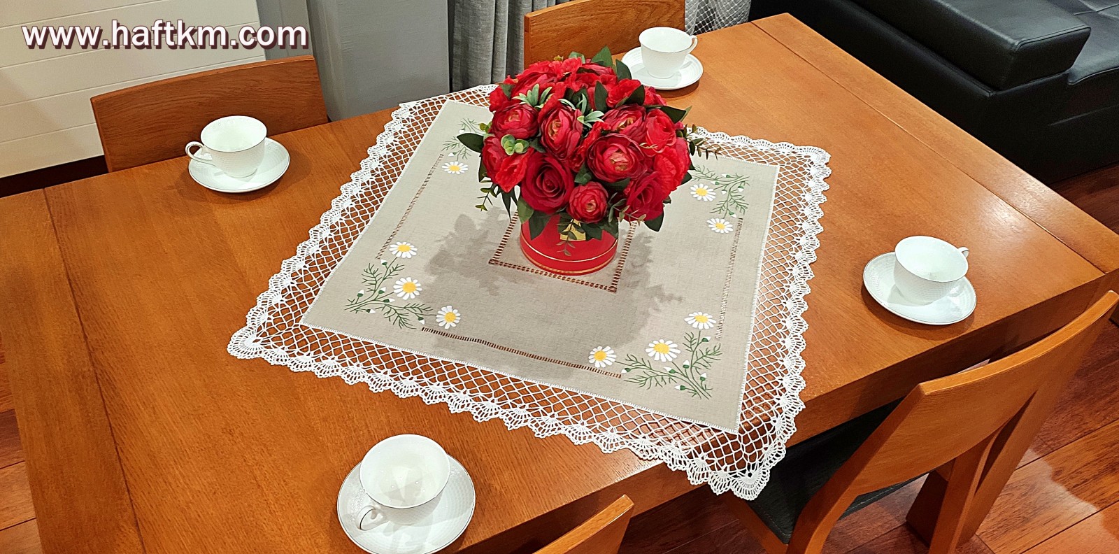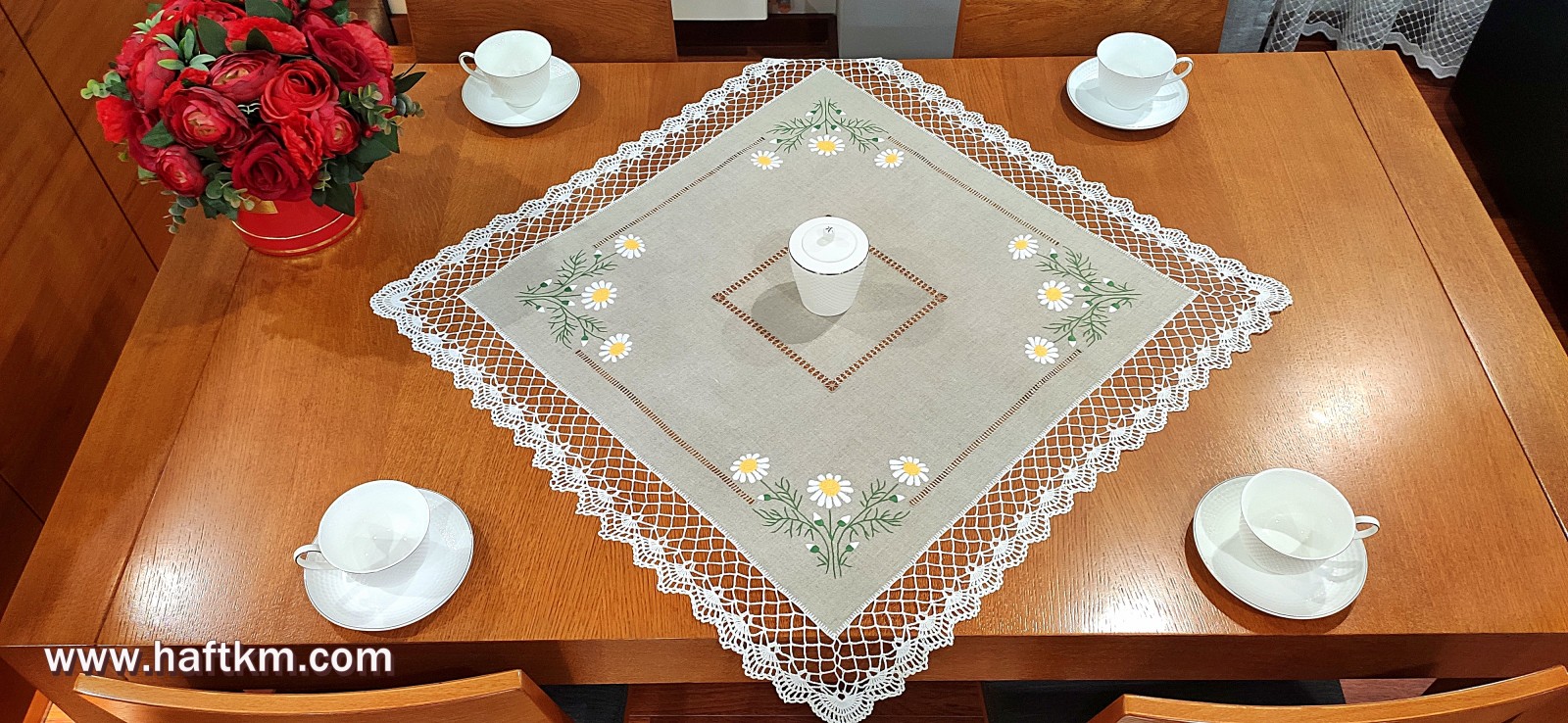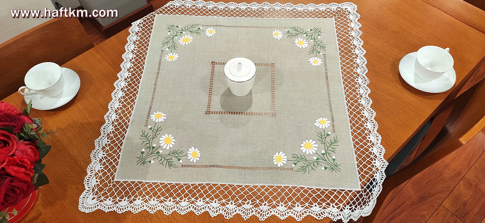 techniką hafciarską, haft angielski. Ponadto serweta została misternie ozdobiona elegancką i misterną koronką szydełkową.