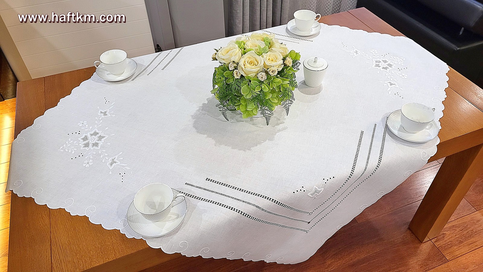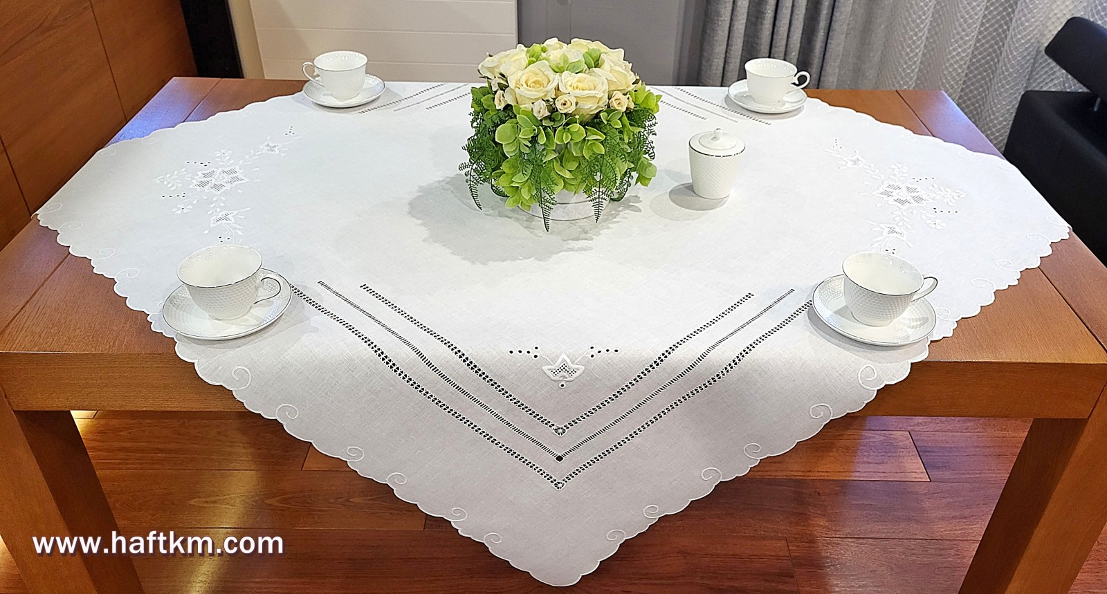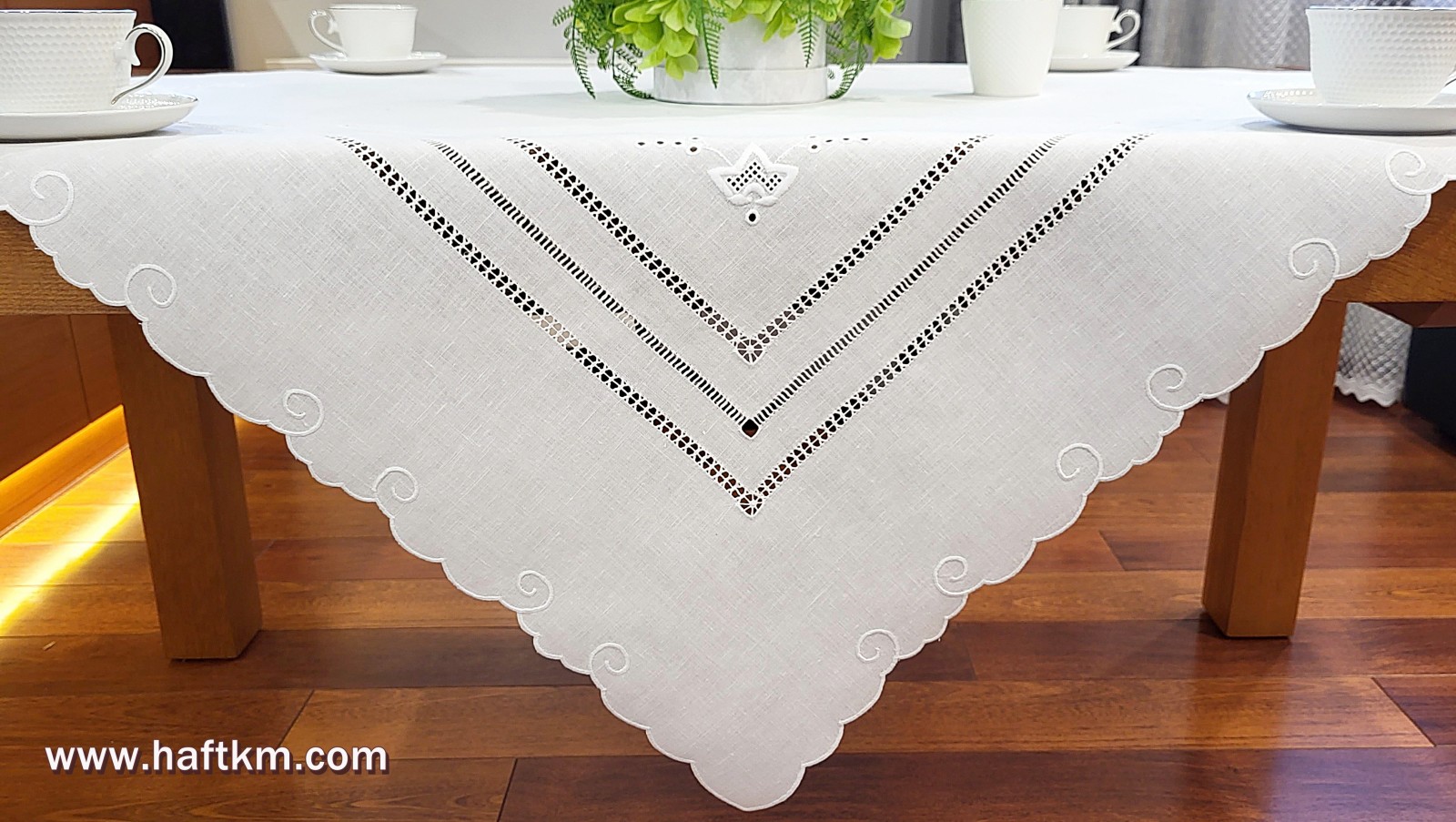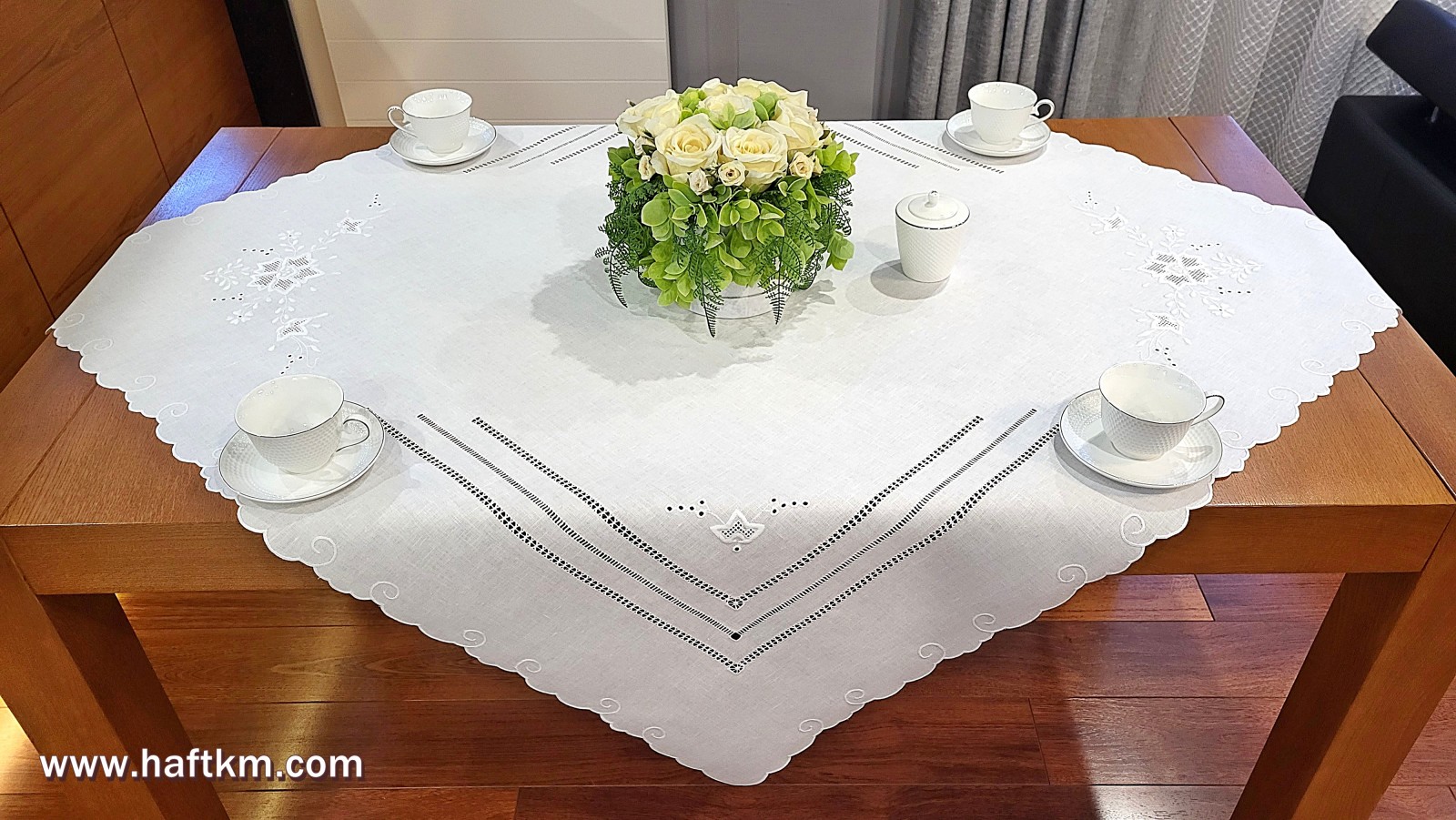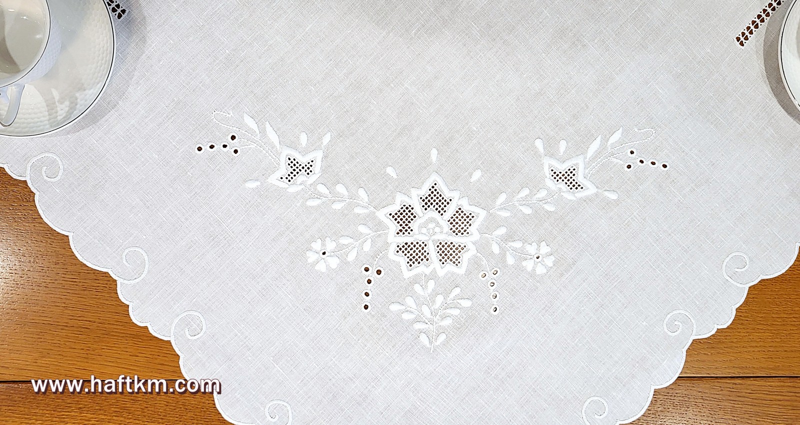 techniką hafciarską, haft wypukły, toledo. Ponadto serweta została misternie ozdobiona elegancką i estetyczną mereżką.