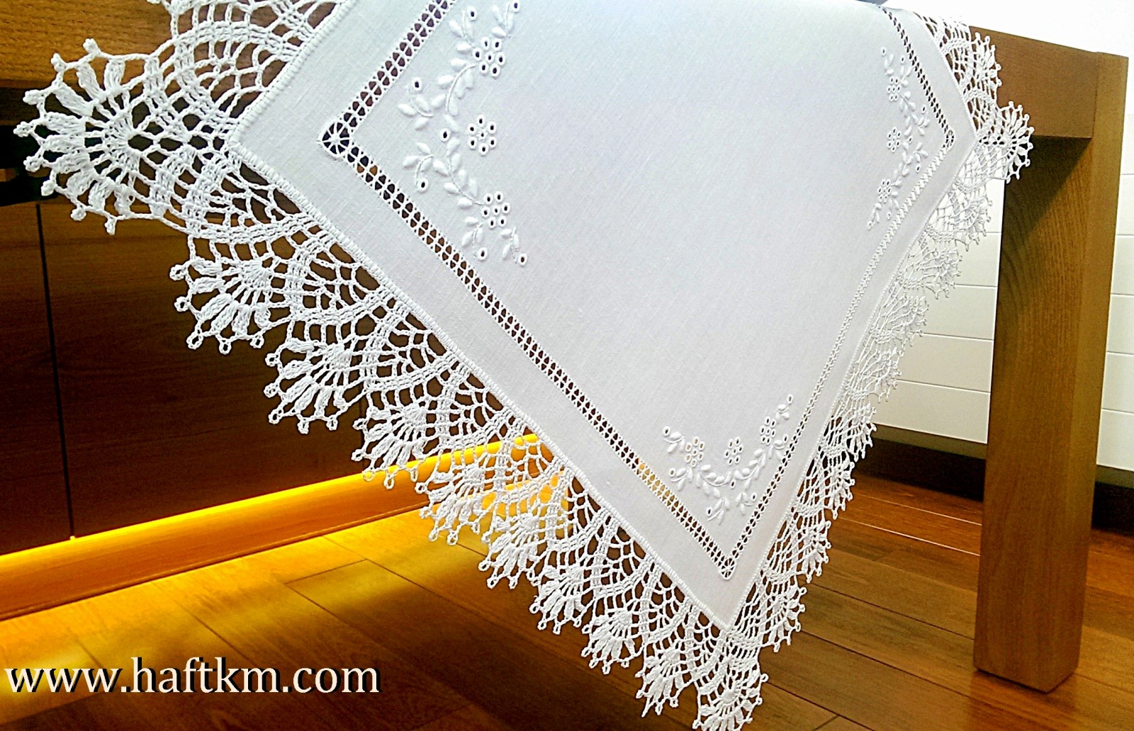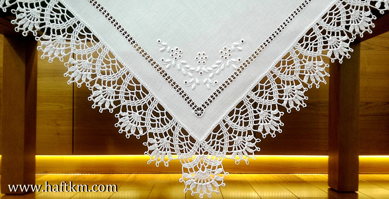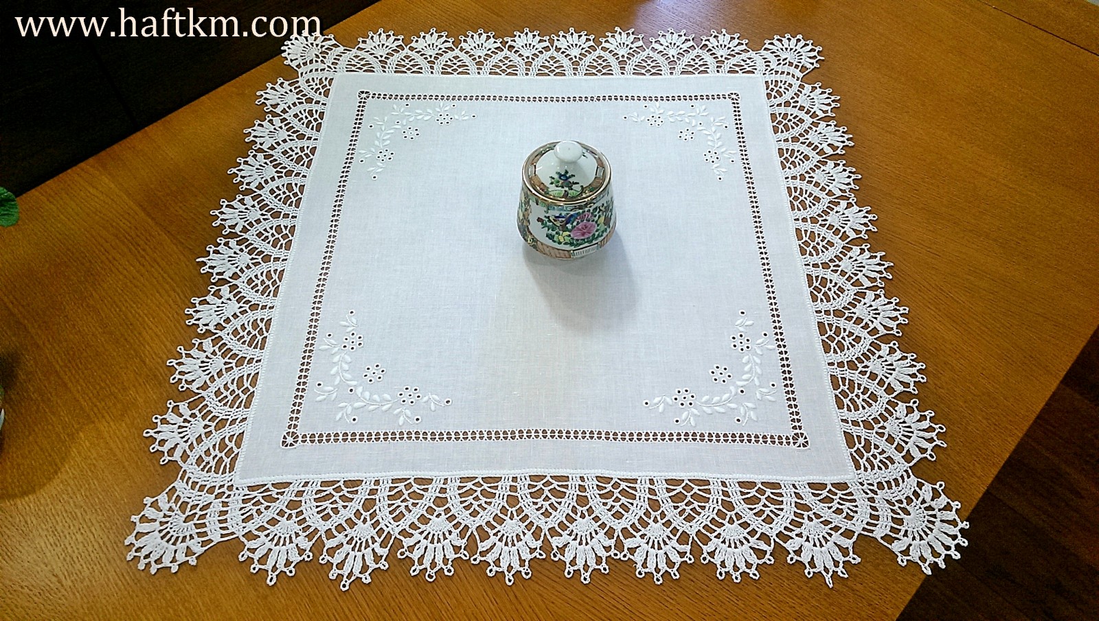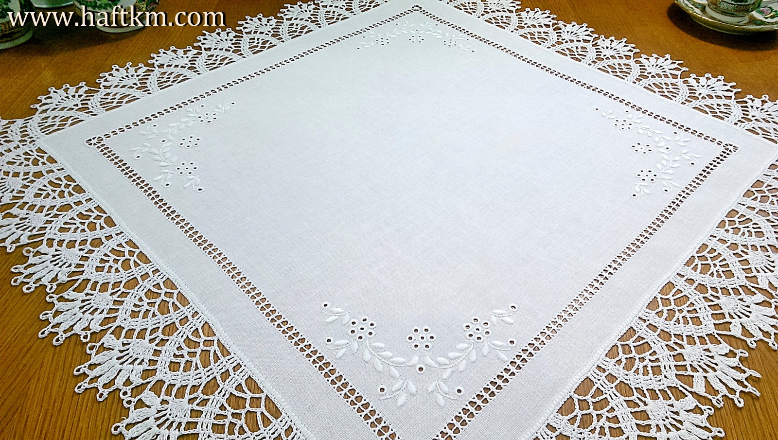 techniką hafciarską, haft angielski. Ponadto serweta została misternie ozdobiona elegancką i misterną koronką szydełkową.