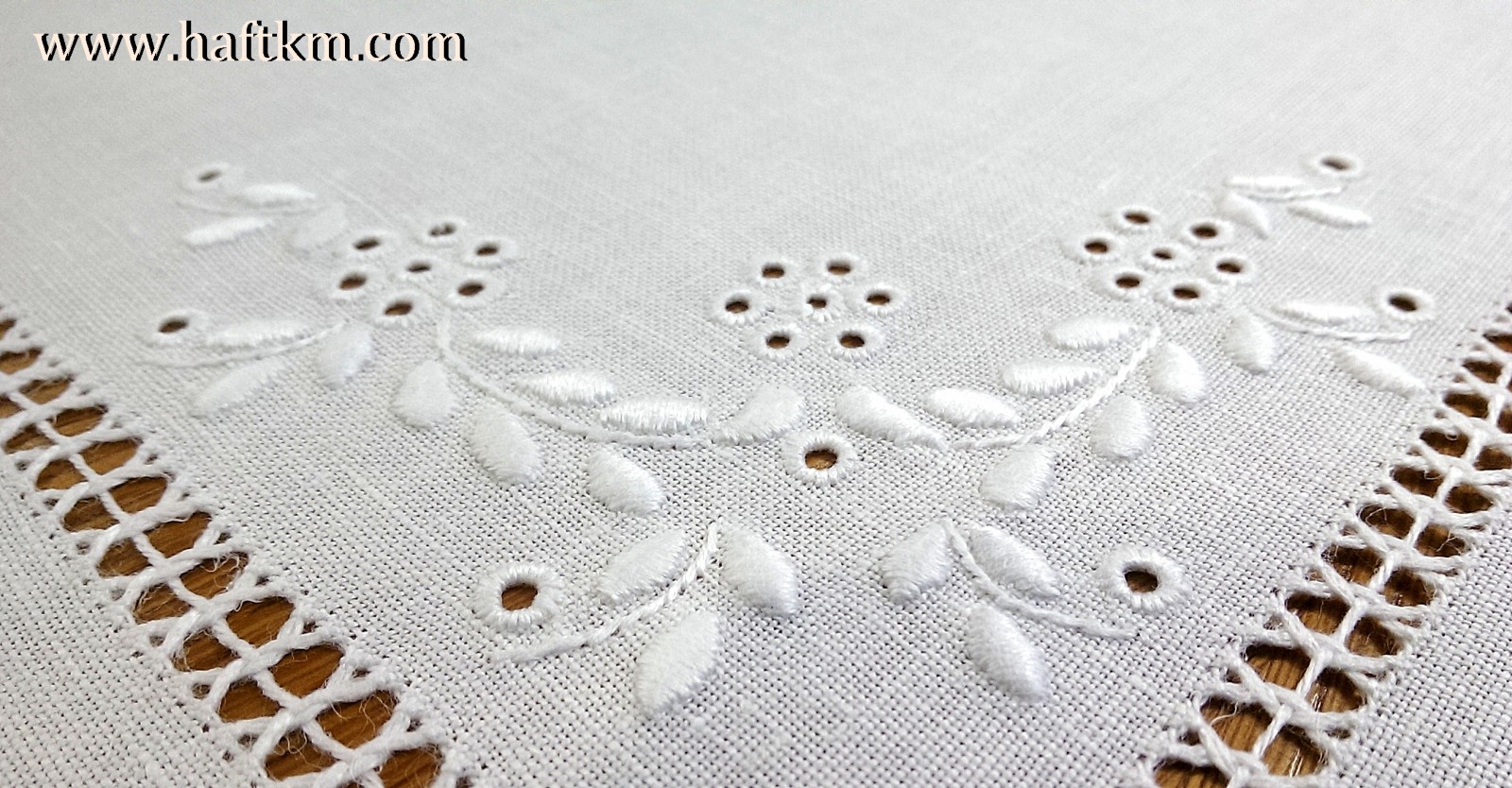 Technika wykonania: haft angielski, mereżka wiązana, koronka szydełkowa.