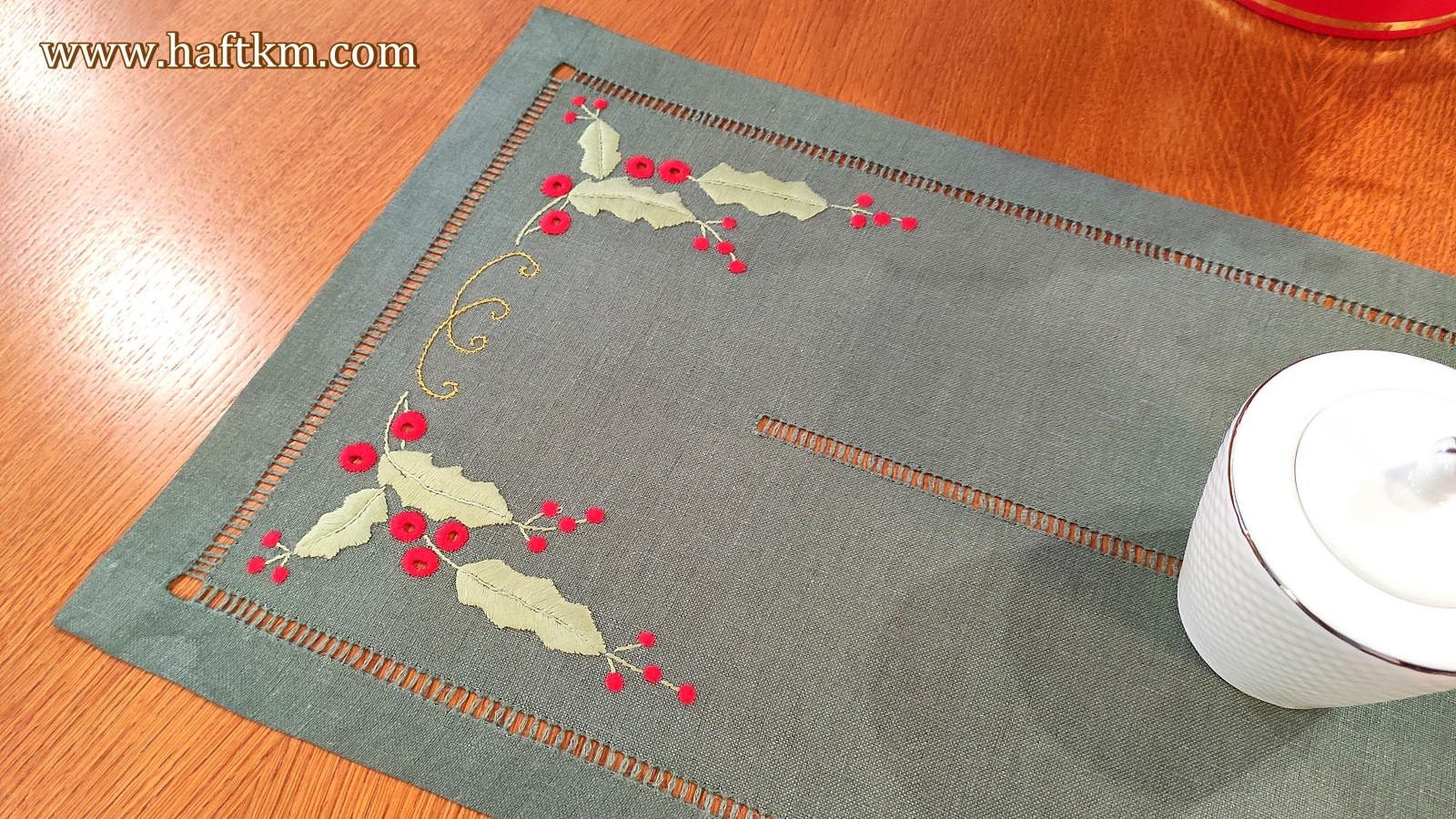 techniką hafciarską haft wypukły. Ponadto bieżnik został misternie ozdobiony elegancką i estetyczną mereżką.