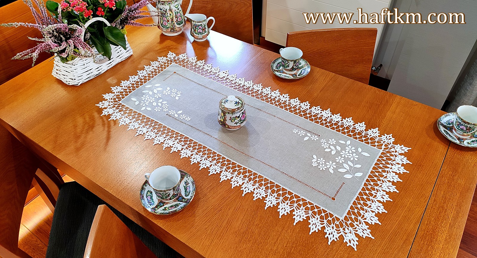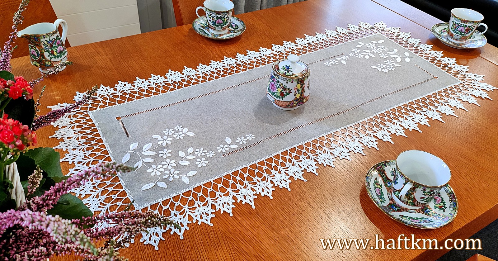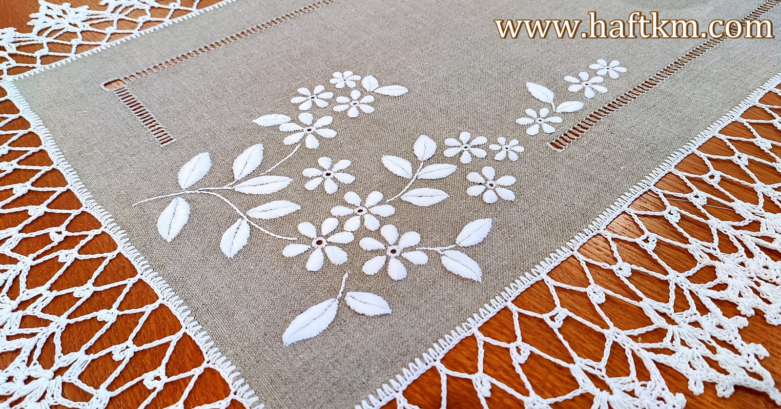 techniką hafciarską, haft wypukły i haft toledo . Ponadto bieżnik został misternie ozdobiony elegancką i misterną koronką szydełkową.