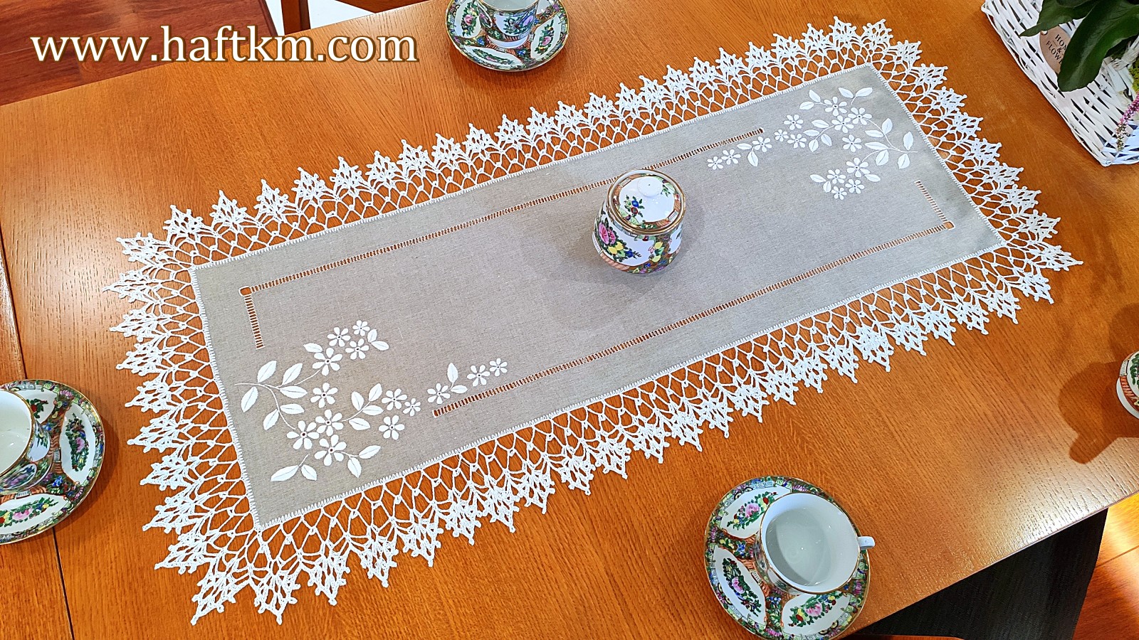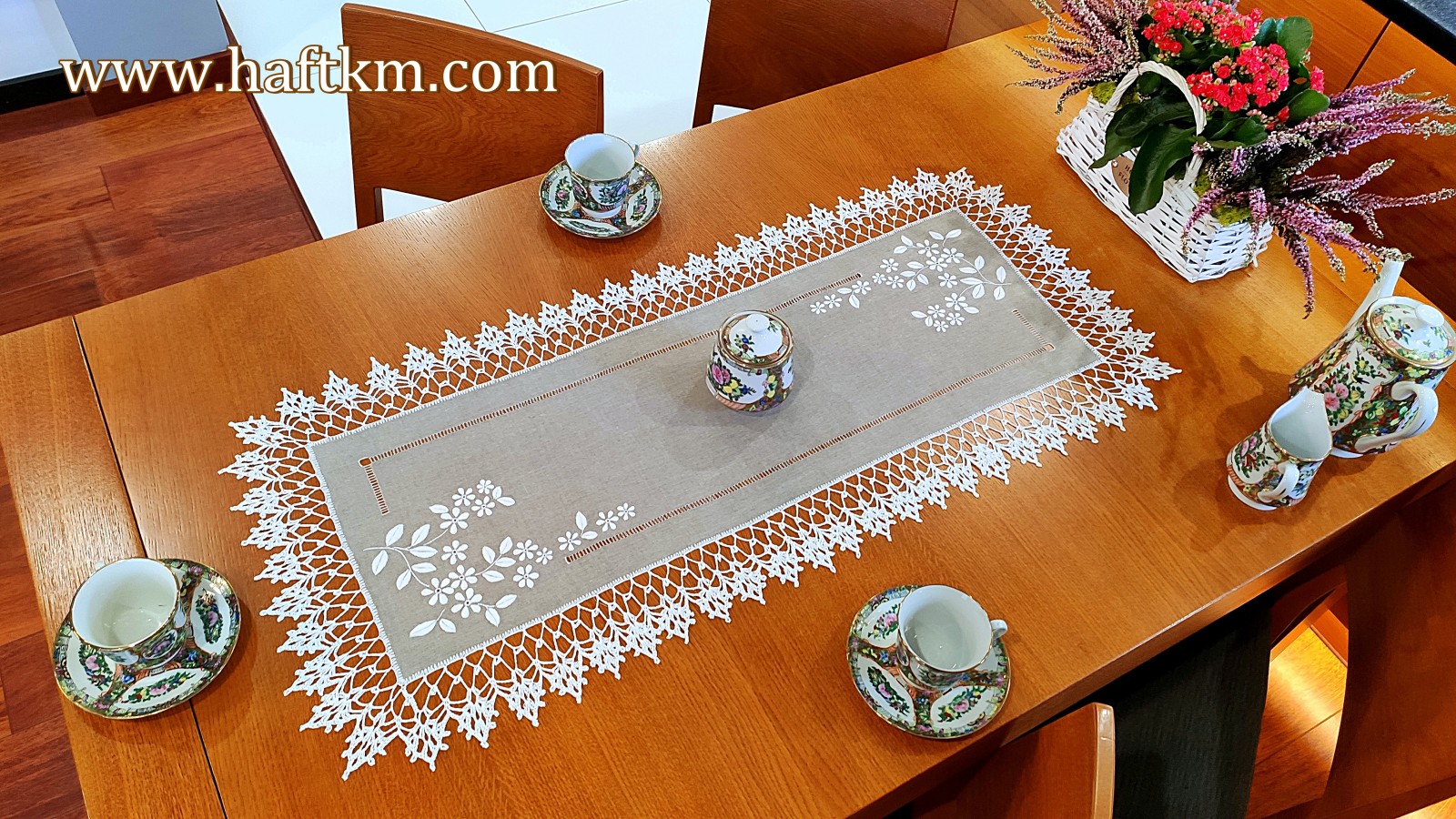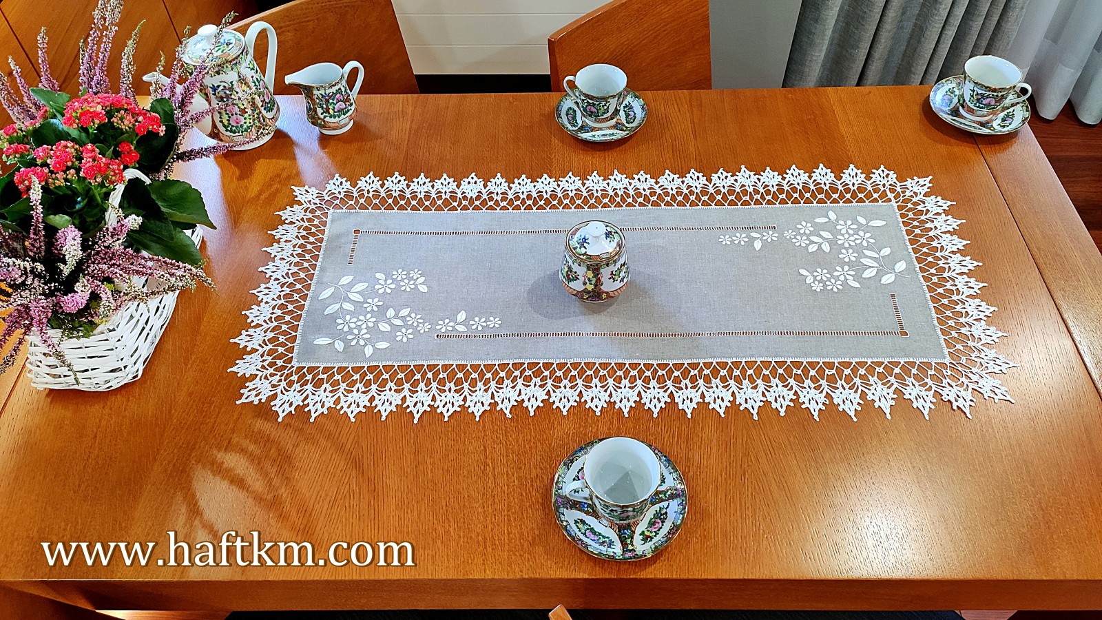 techniką hafciarską, haft wypukły i haft toledo . Ponadto bieżnik został misternie ozdobiony elegancką i misterną koronką szydełkową.