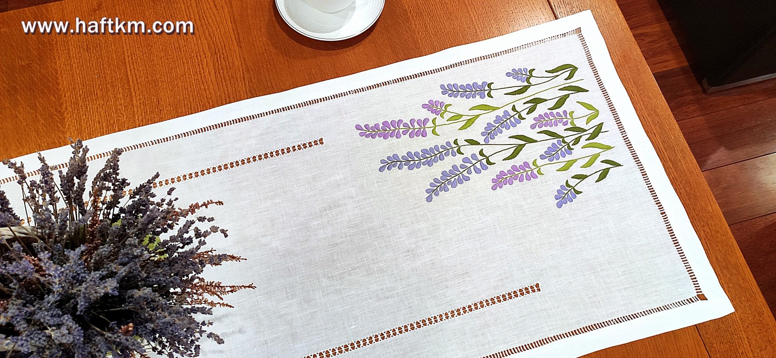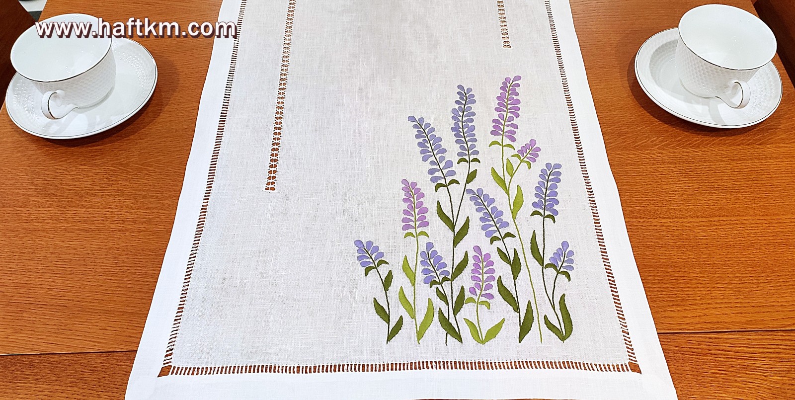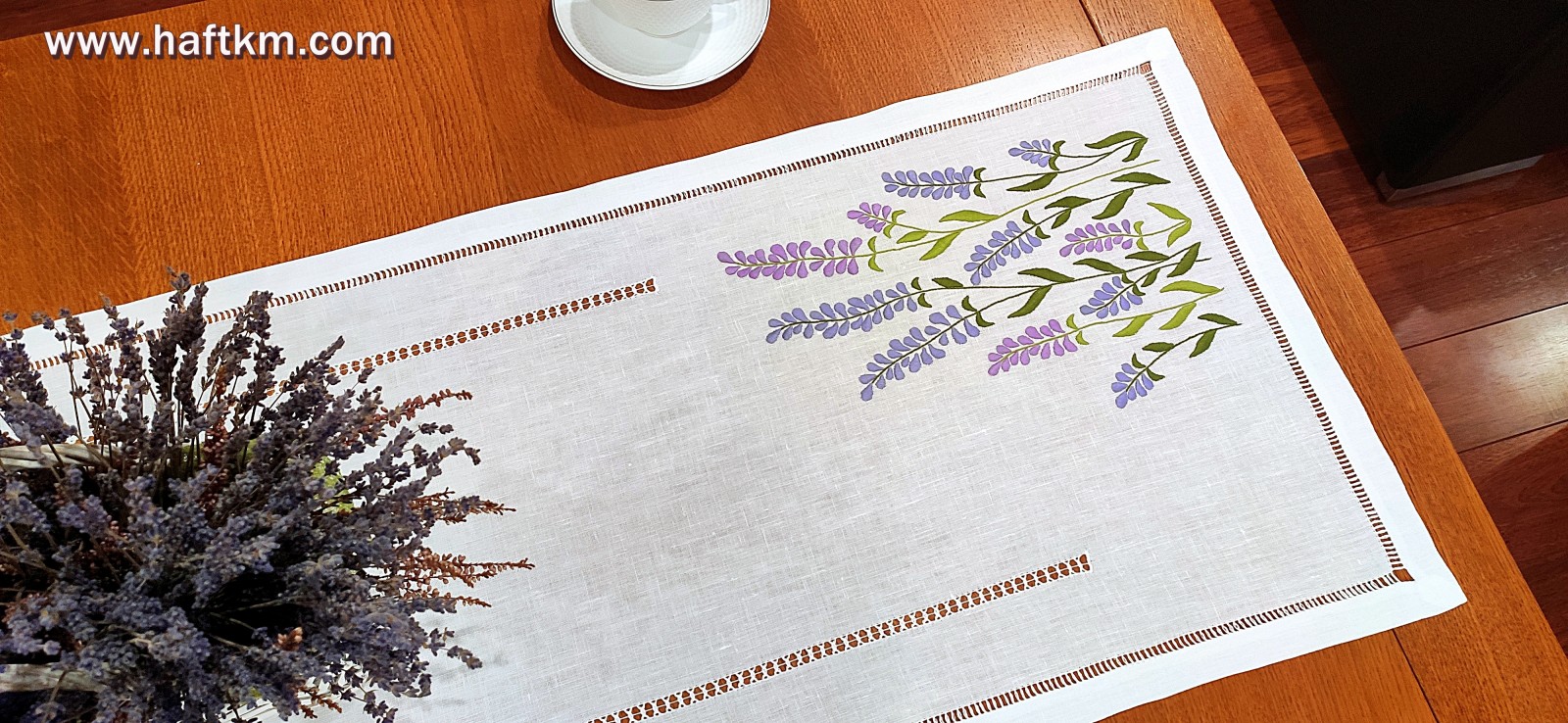 Lniany bieżnik ręcznie haftowany " Lawenda"