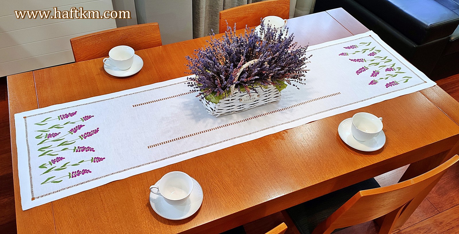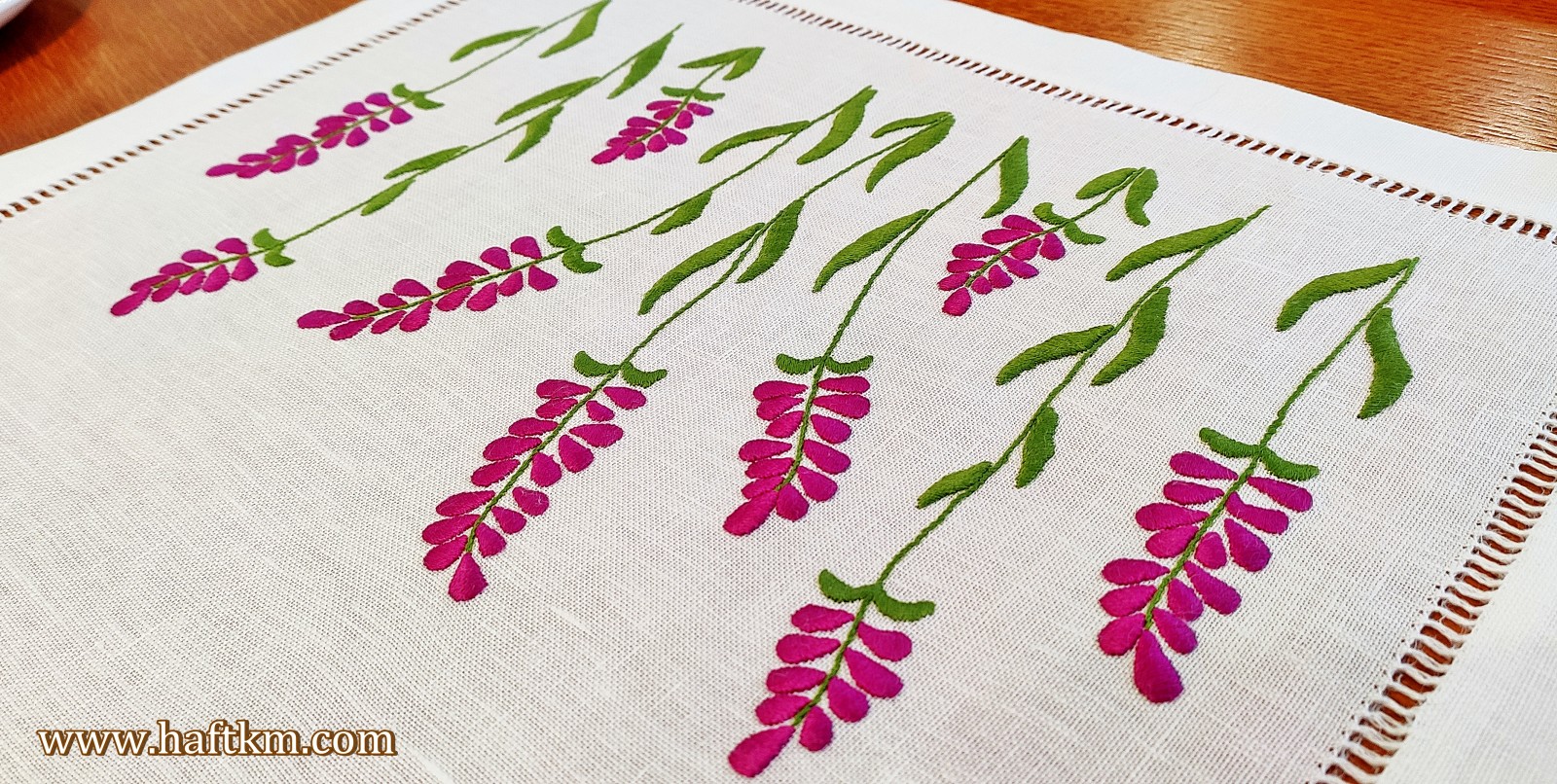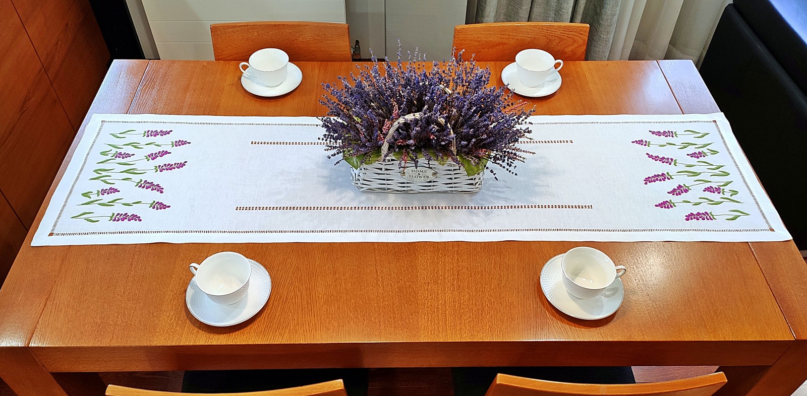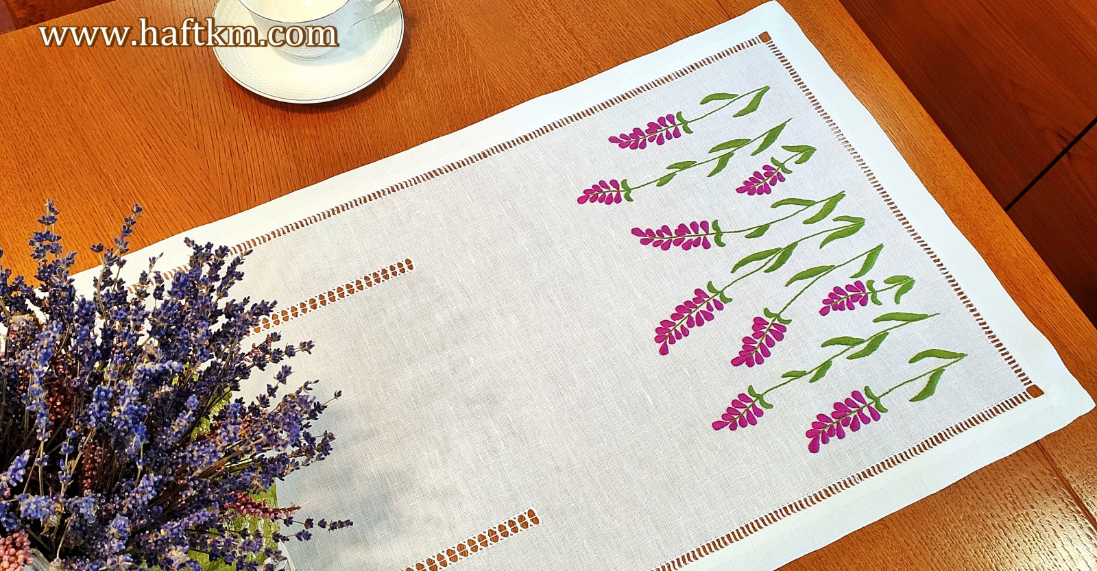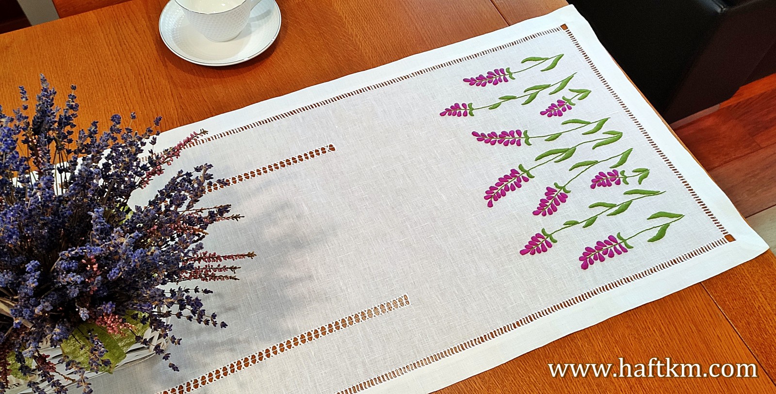 Lniany bieżnik ręcznie haftowany " Lawenda"