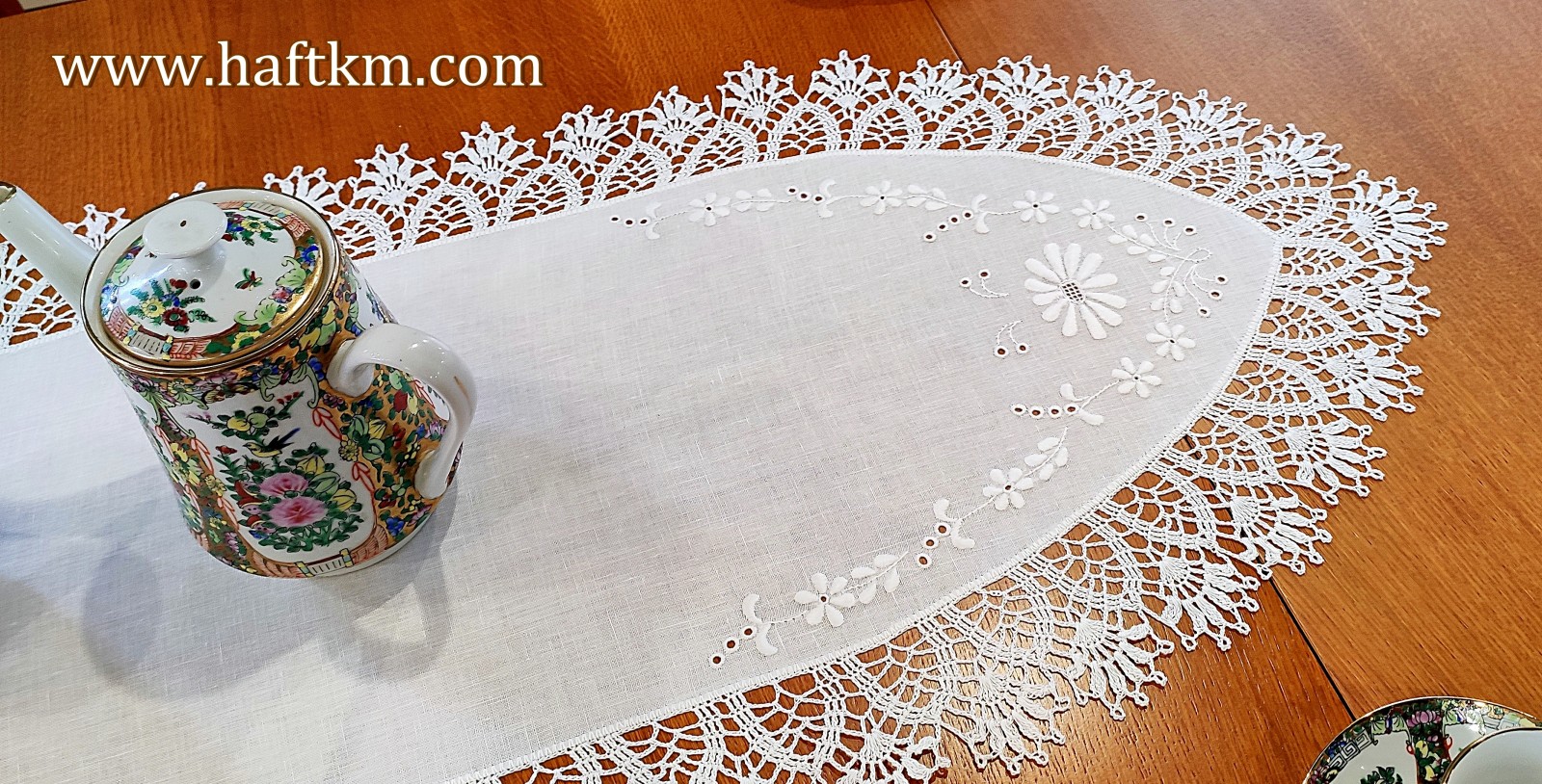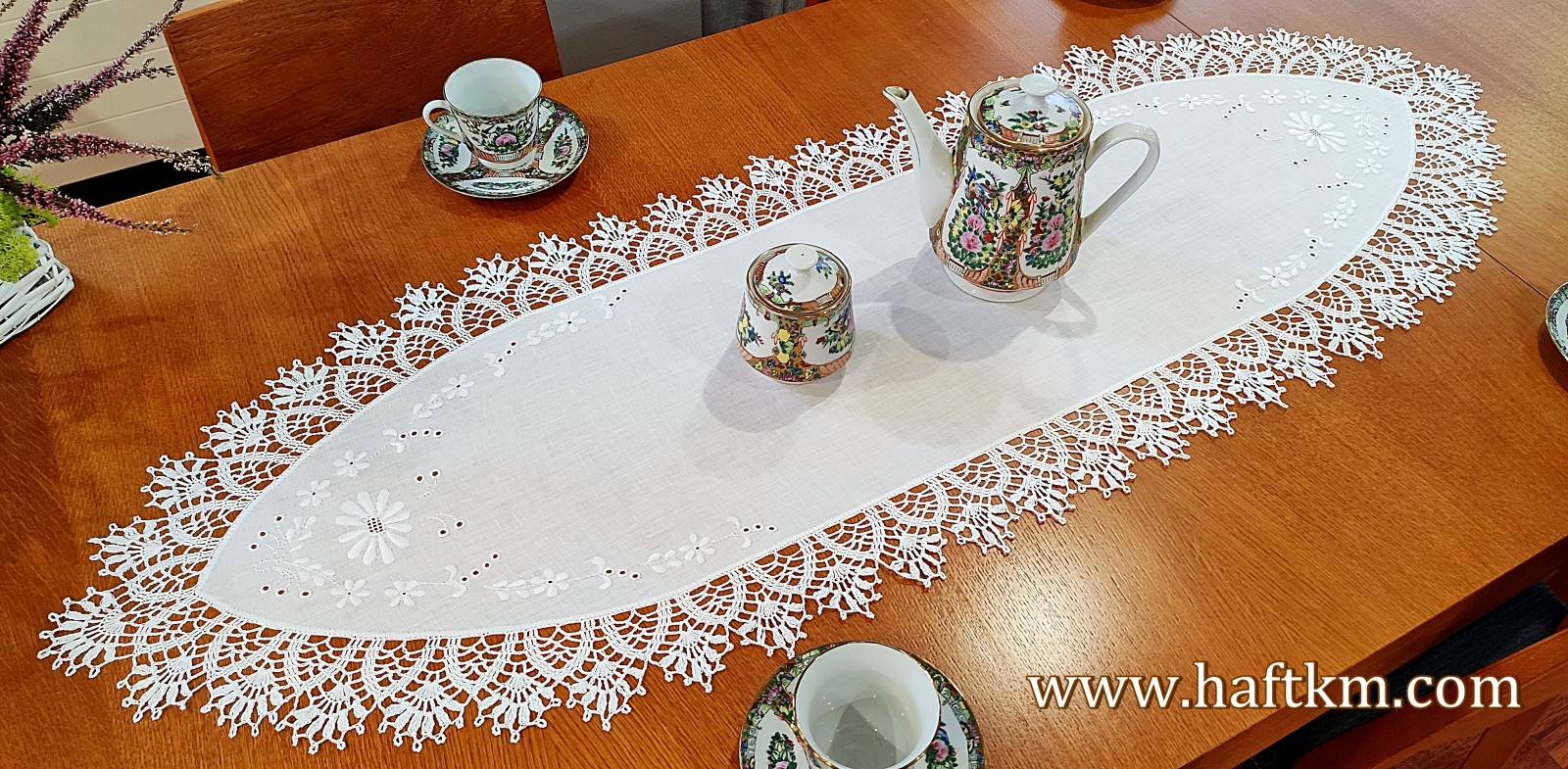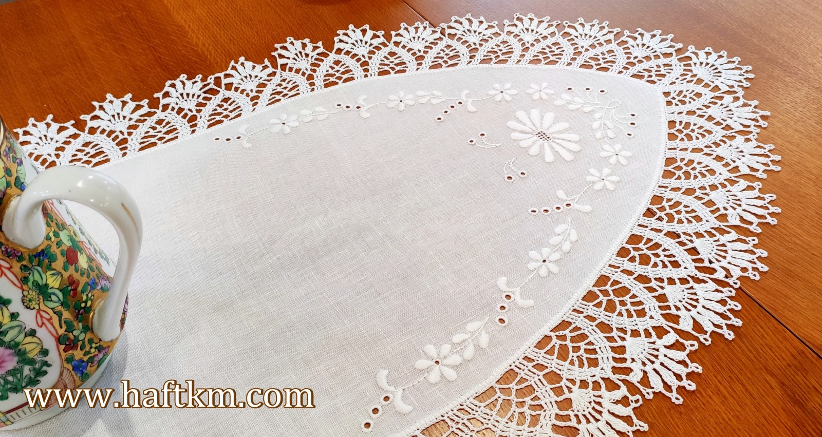 Luksusowa, ręcznie haftowana serweta z koronką szydełkową.