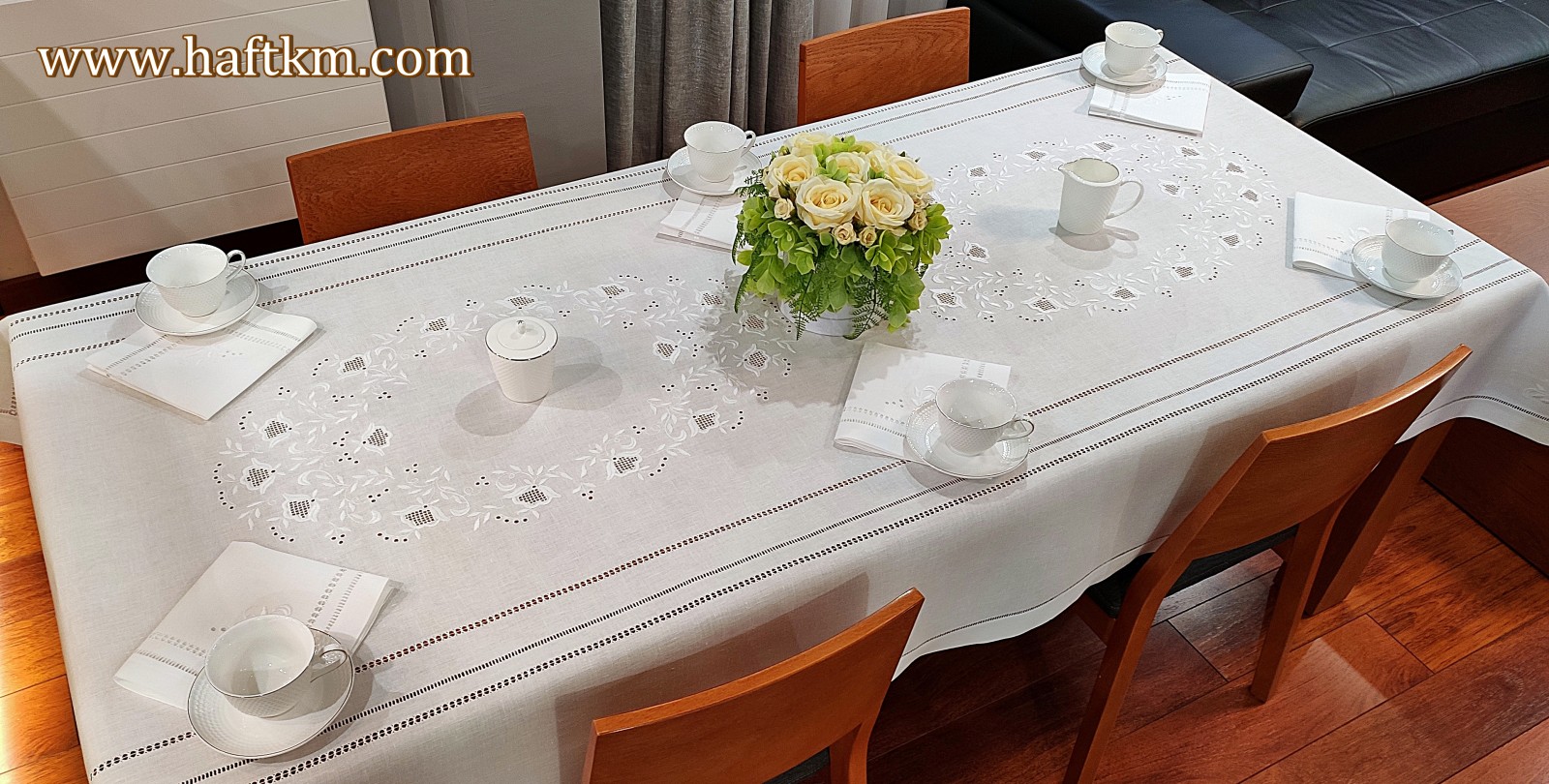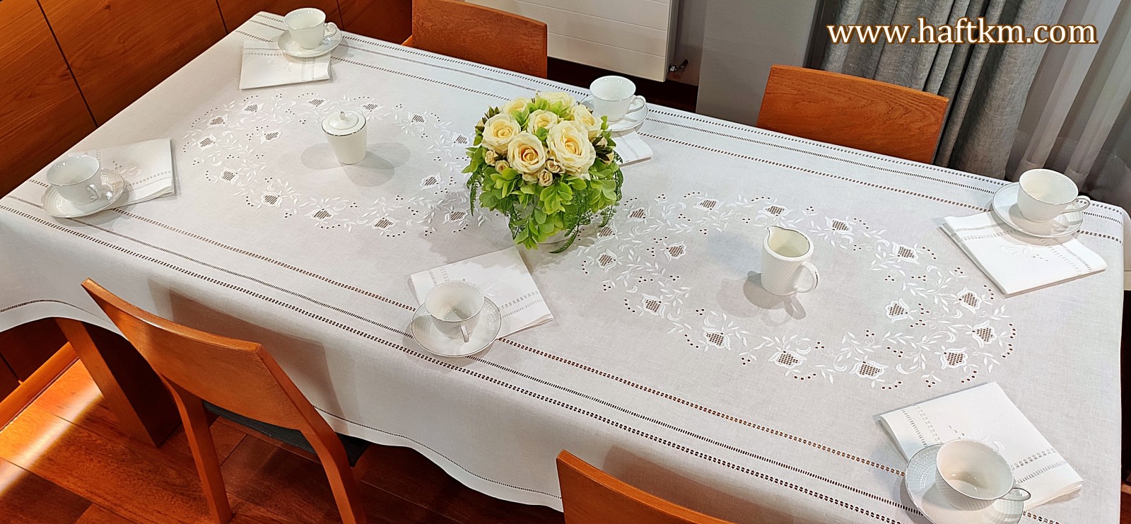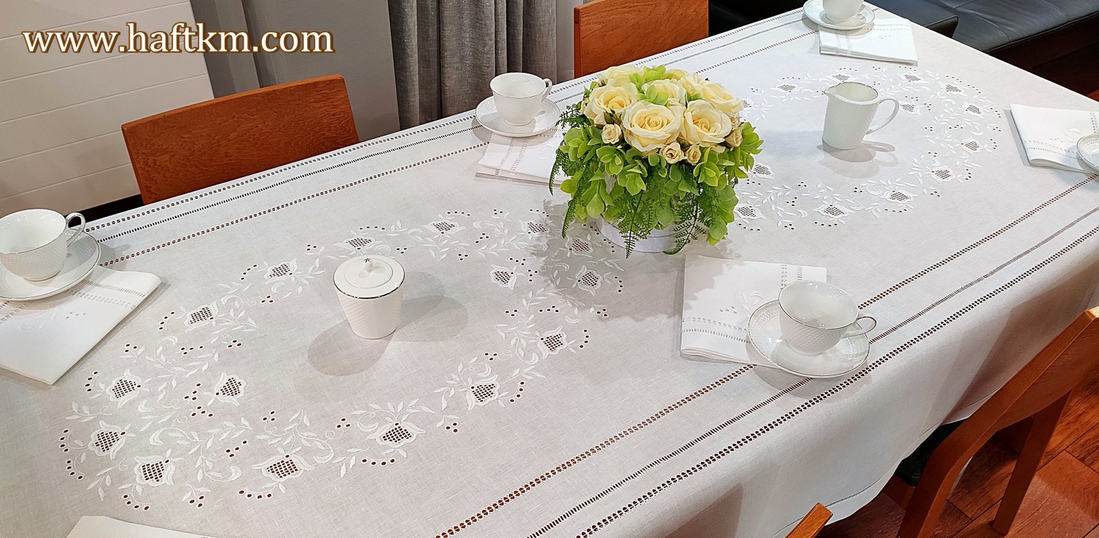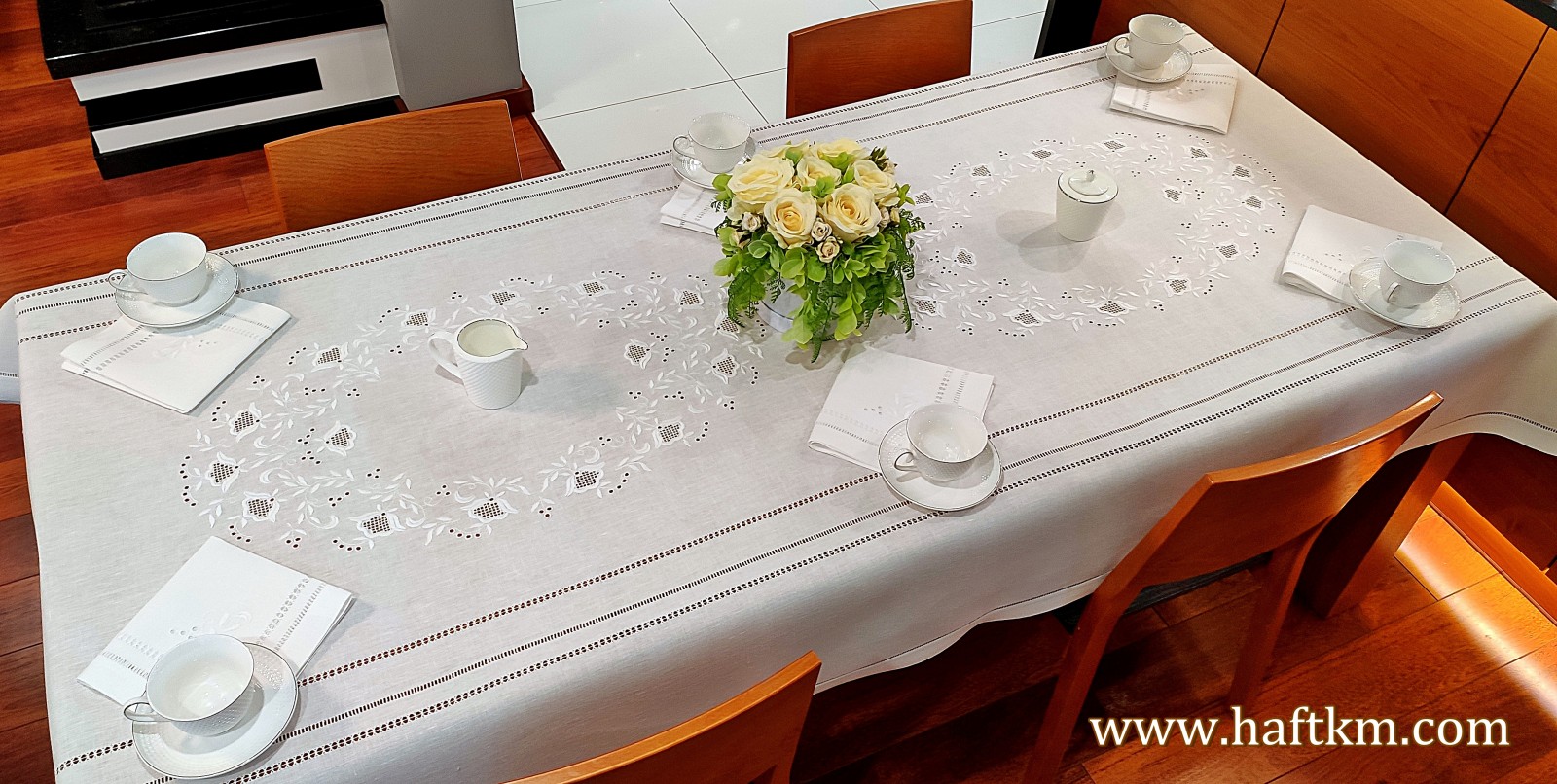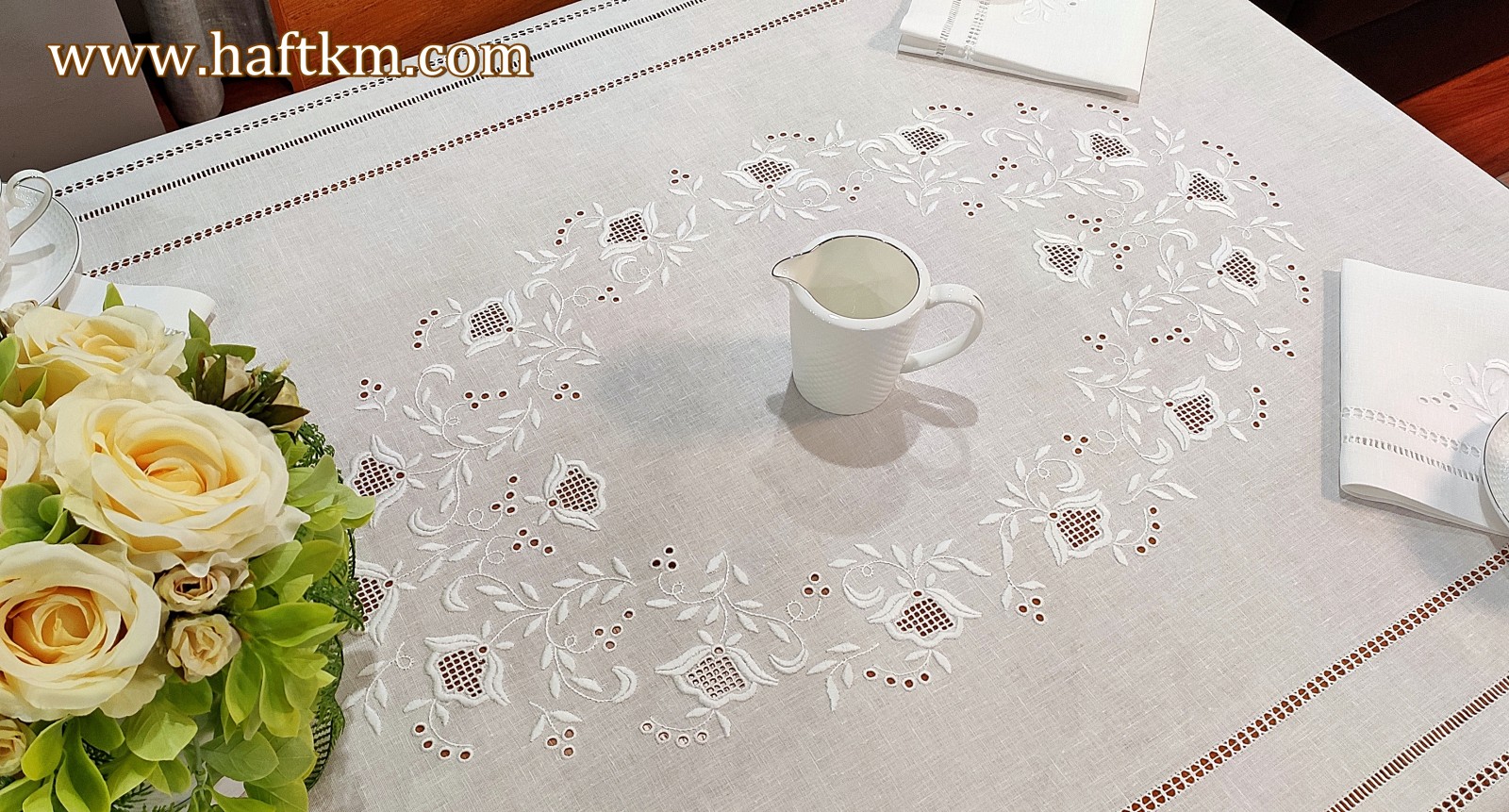 Ponadto obrus został misternie ozdobiony elegancką i estetyczną mereżką.