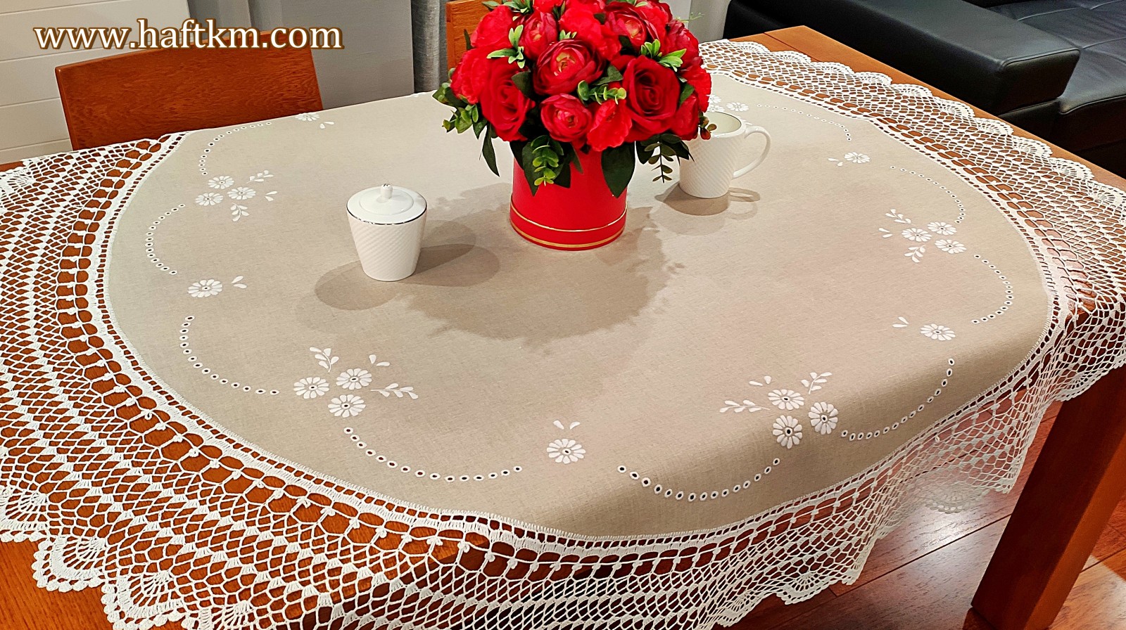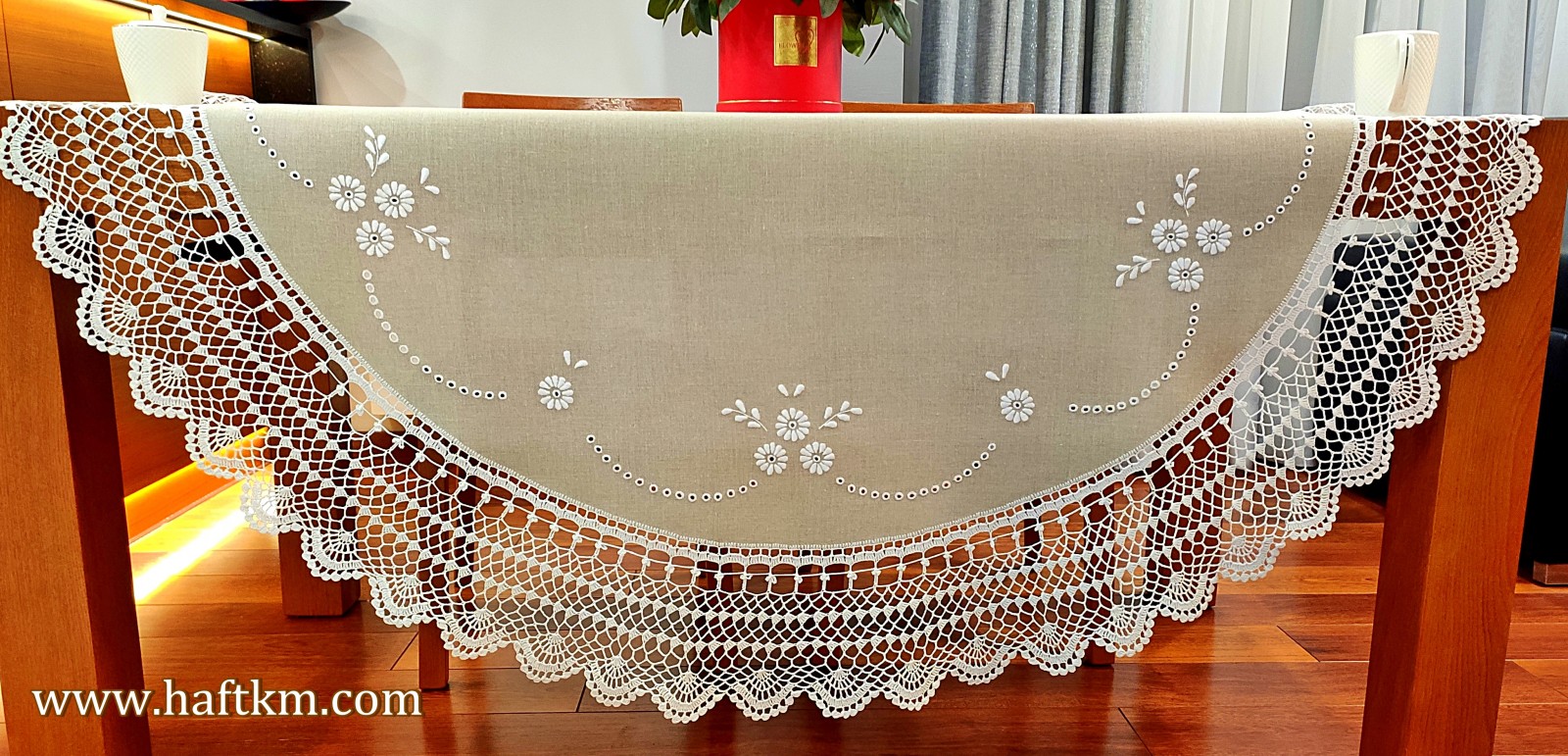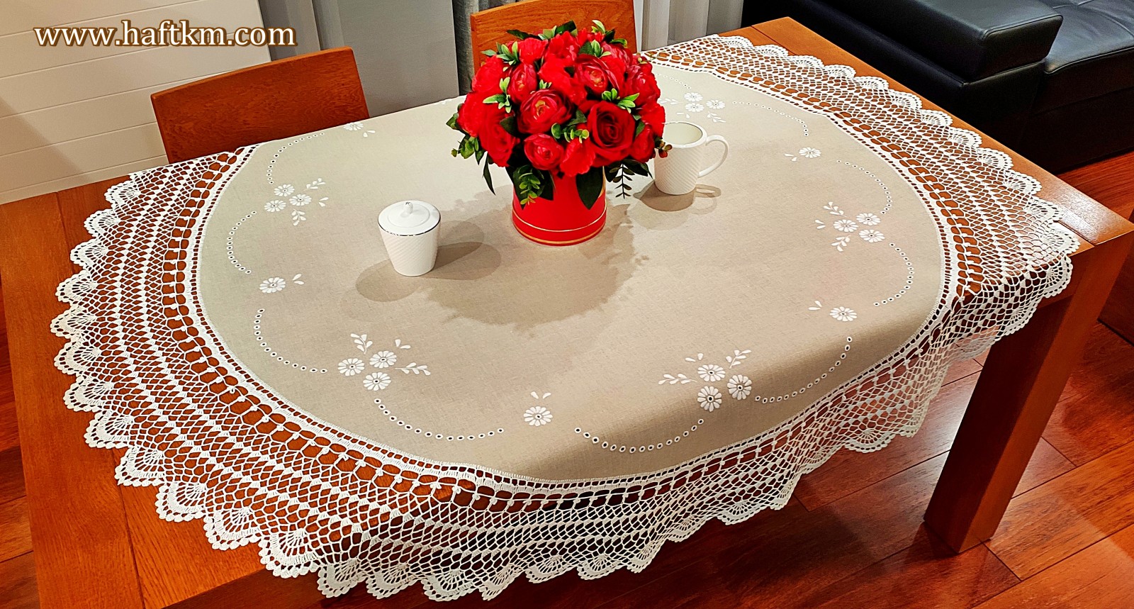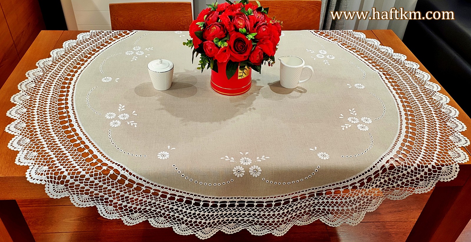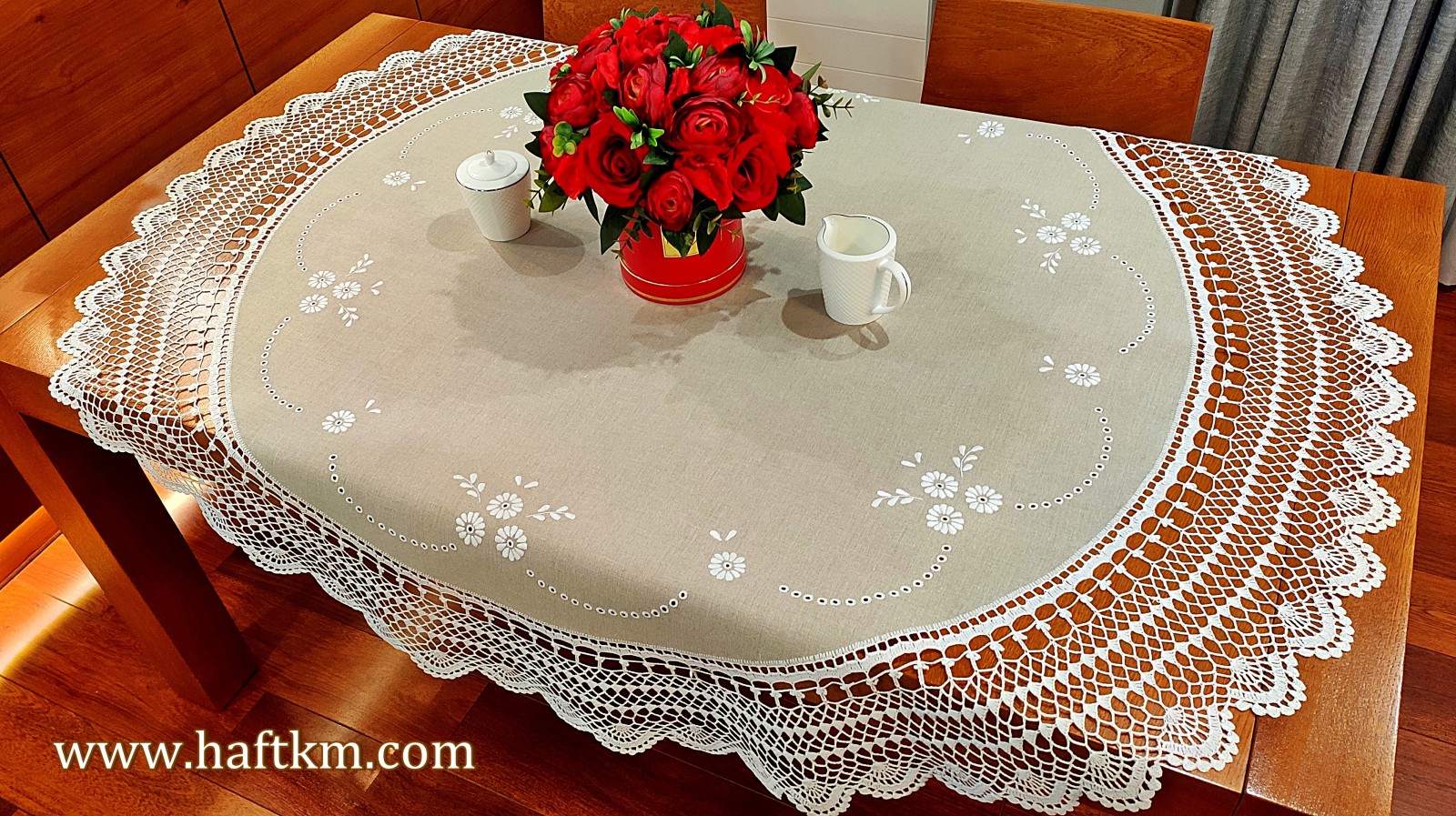 techniką hafciarską, haft wypukły. Ponadto obrus został misternie ozdobiony elegancką i misterną koronką szydełkową.