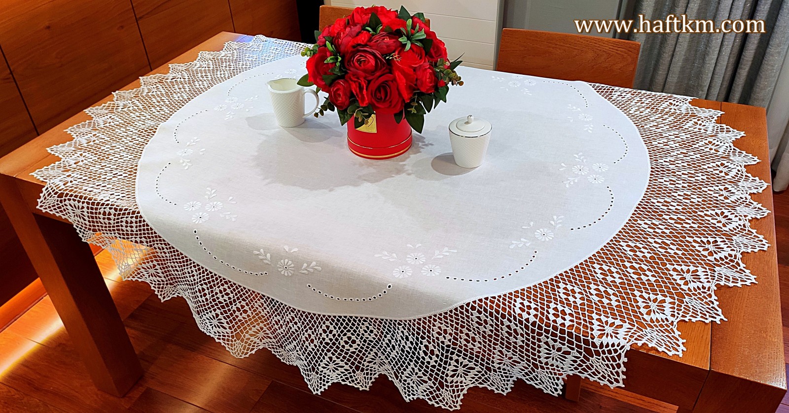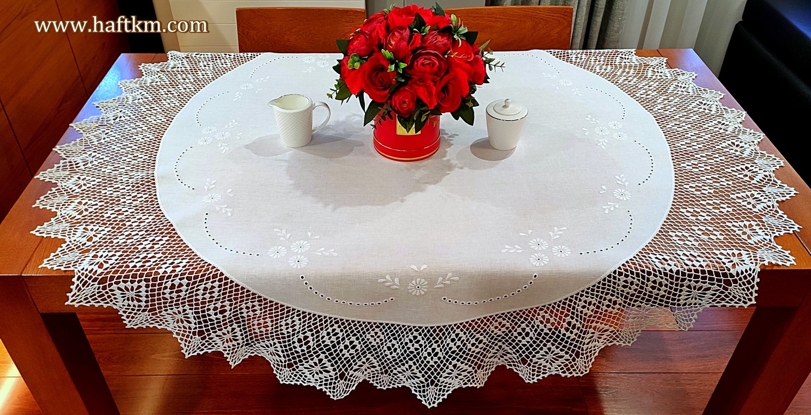 techniką hafciarską, haft wypukły. Ponadto obrus został misternie ozdobiony elegancką i misterną koronką szydełkową.