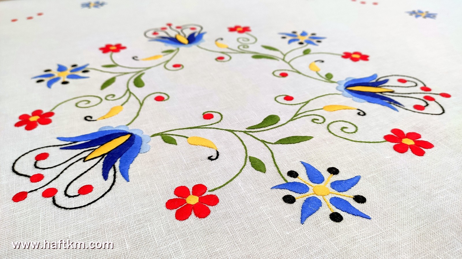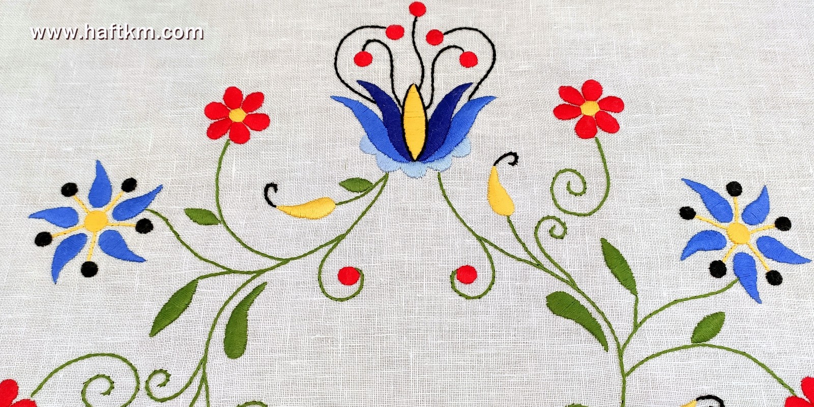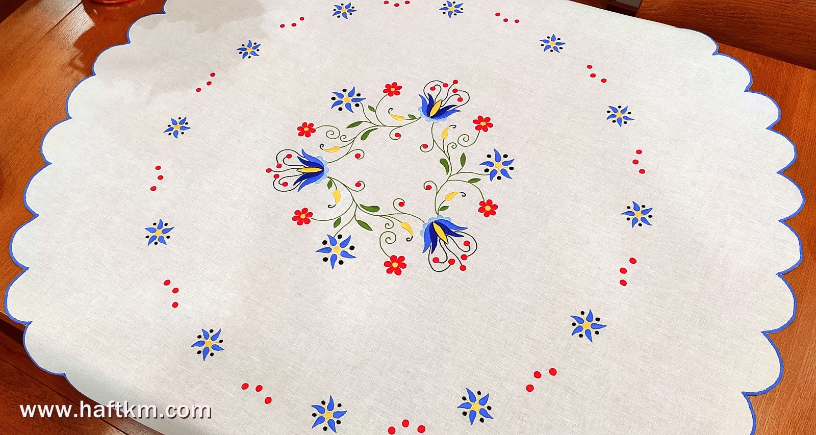 Ręcznie haftowany obrus z motywem kaszubskim.
