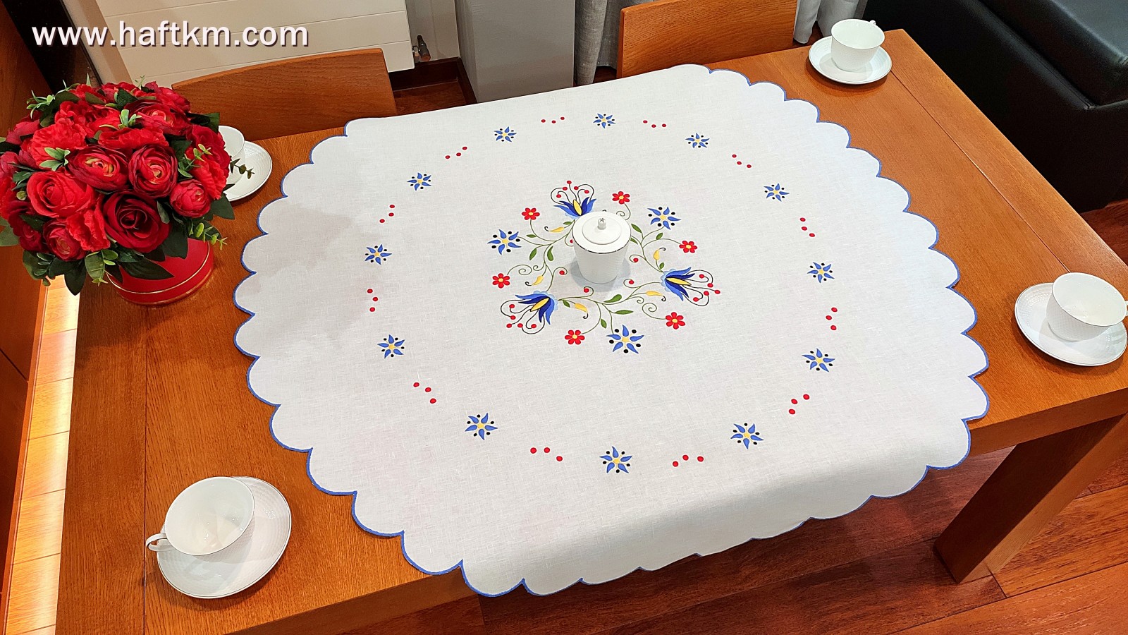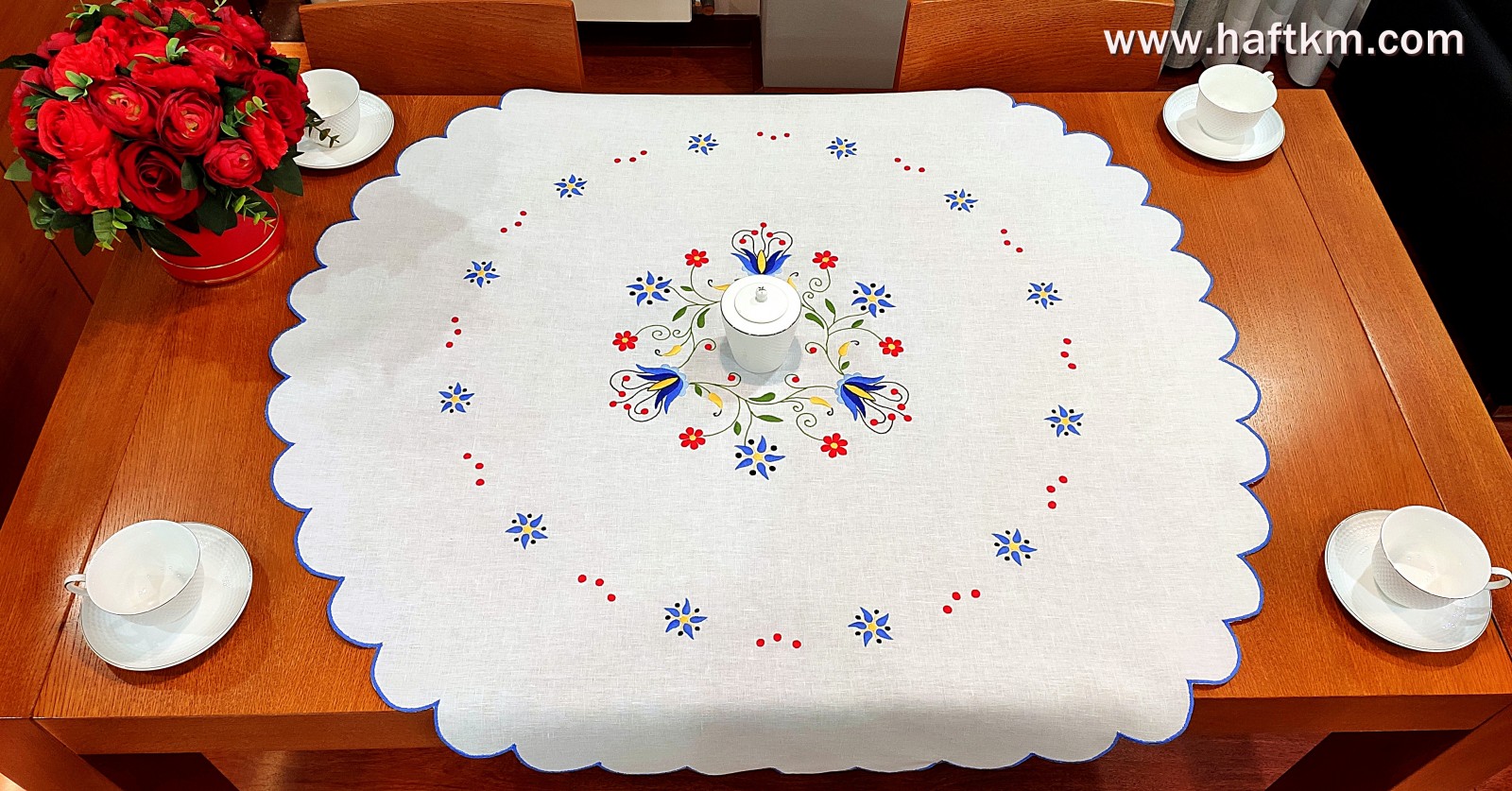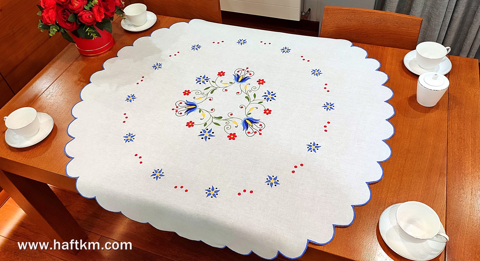 Ręcznie haftowany obrus z motywem kaszubskim.