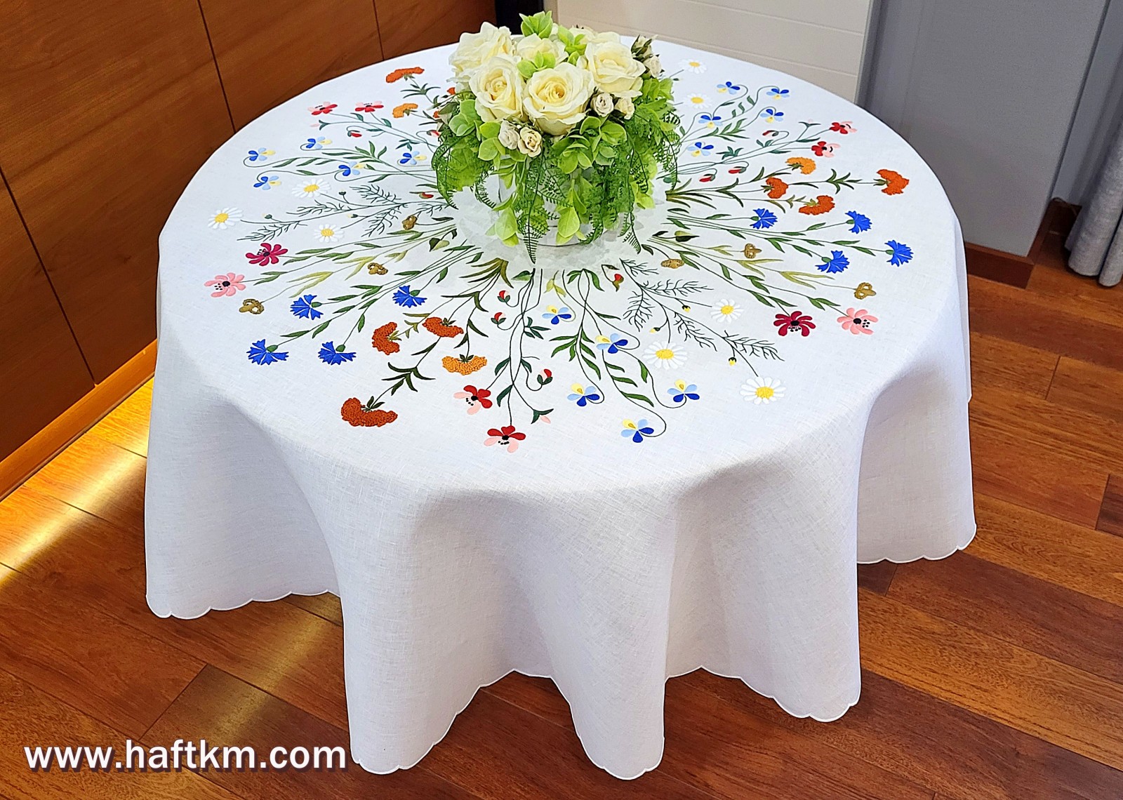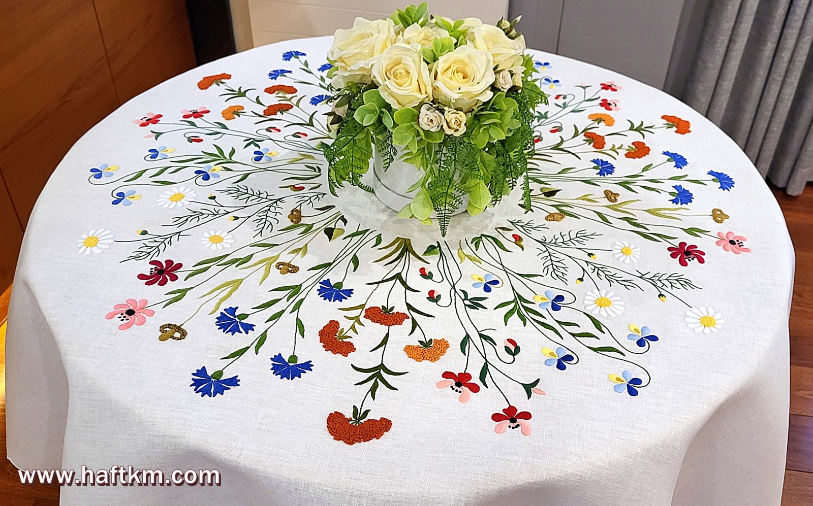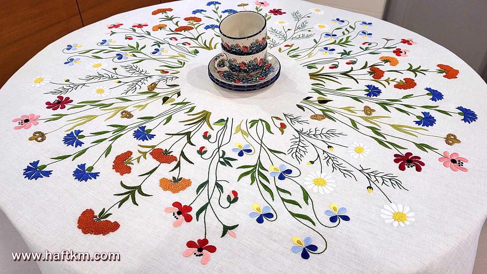 techniką hafciarską - haft wypukły. Ponadto obrus został misternie ozdobiony elegancką i estetyczną mereżką.