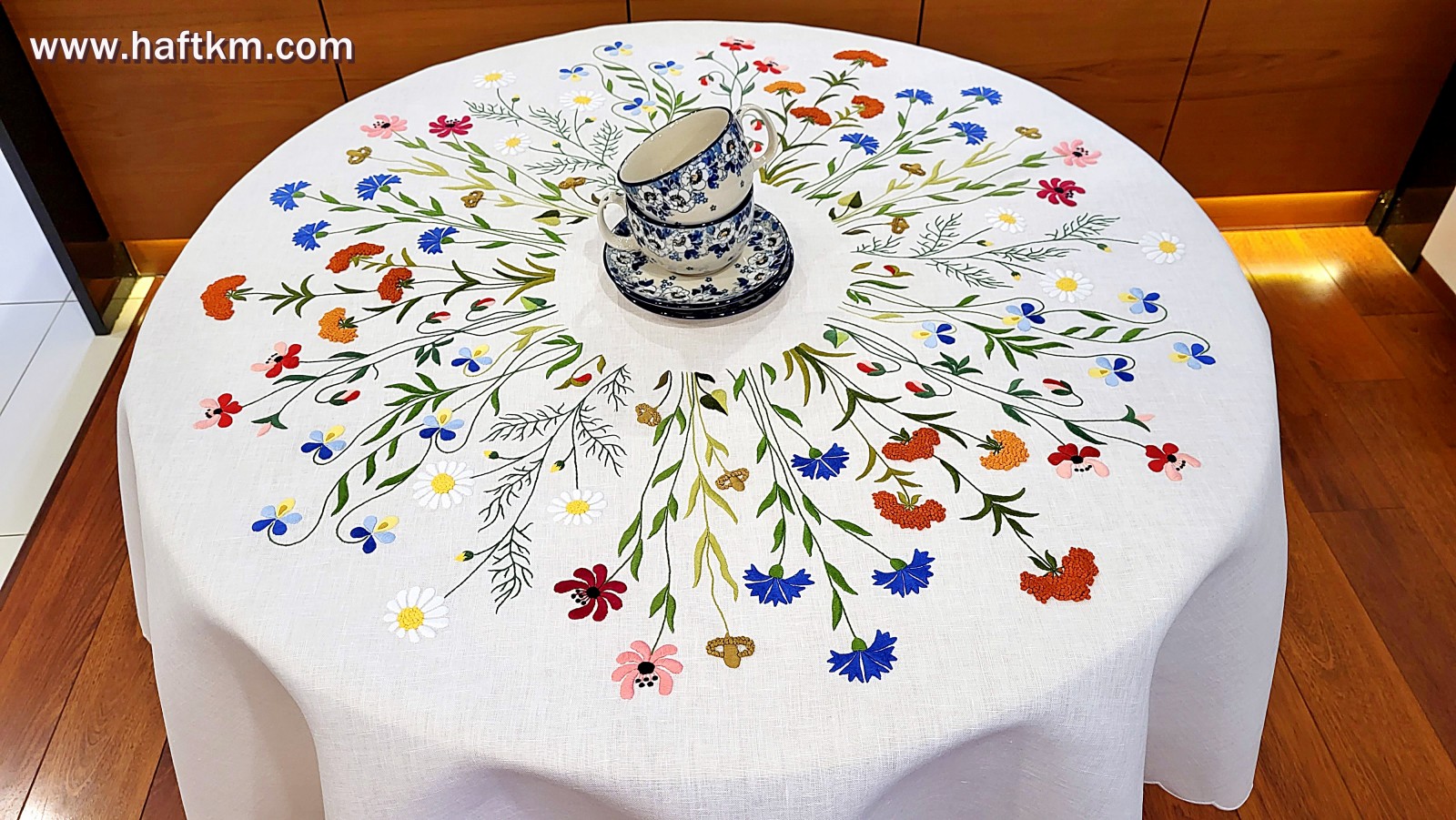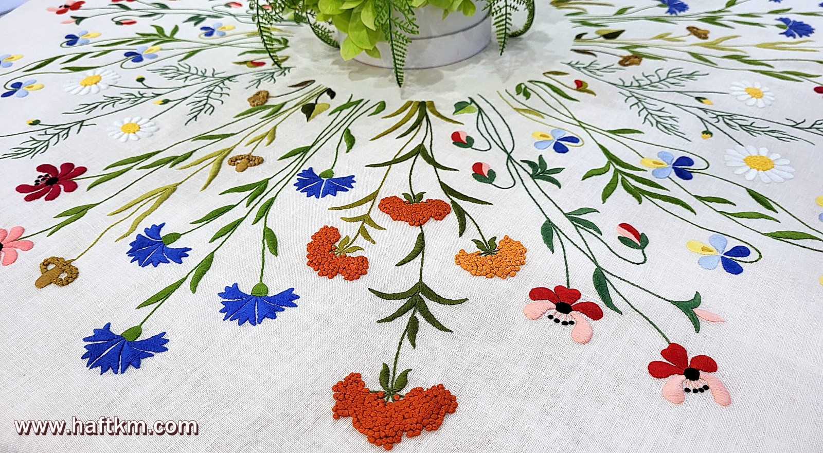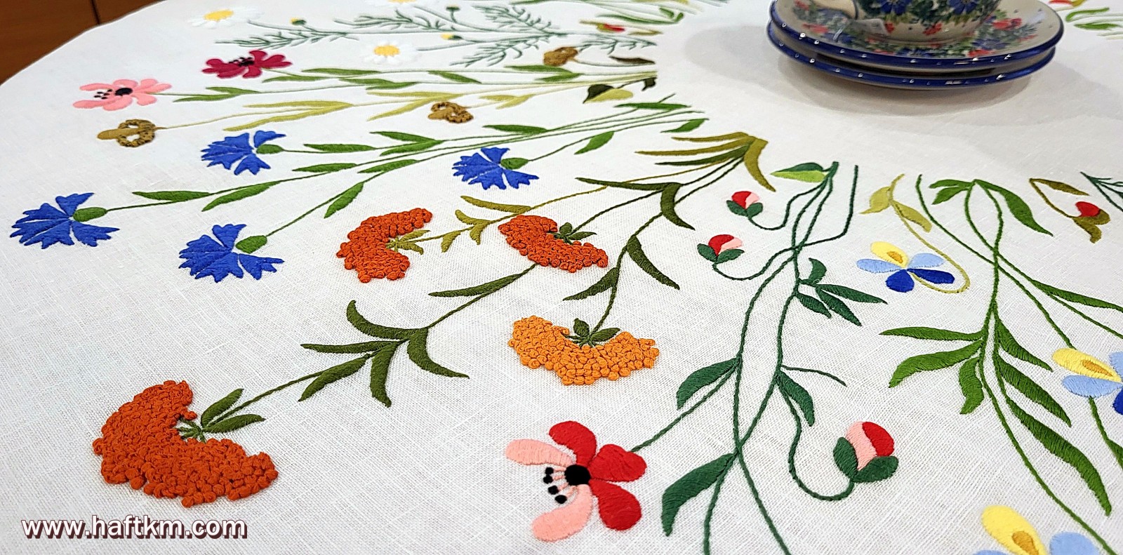 techniką hafciarską - haft wypukły. Ponadto obrus został misternie ozdobiony elegancką i estetyczną mereżką.