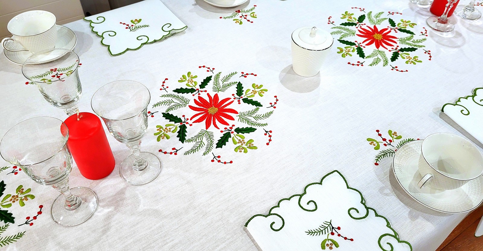 Przepiękny obrus z motywem świątecznym.